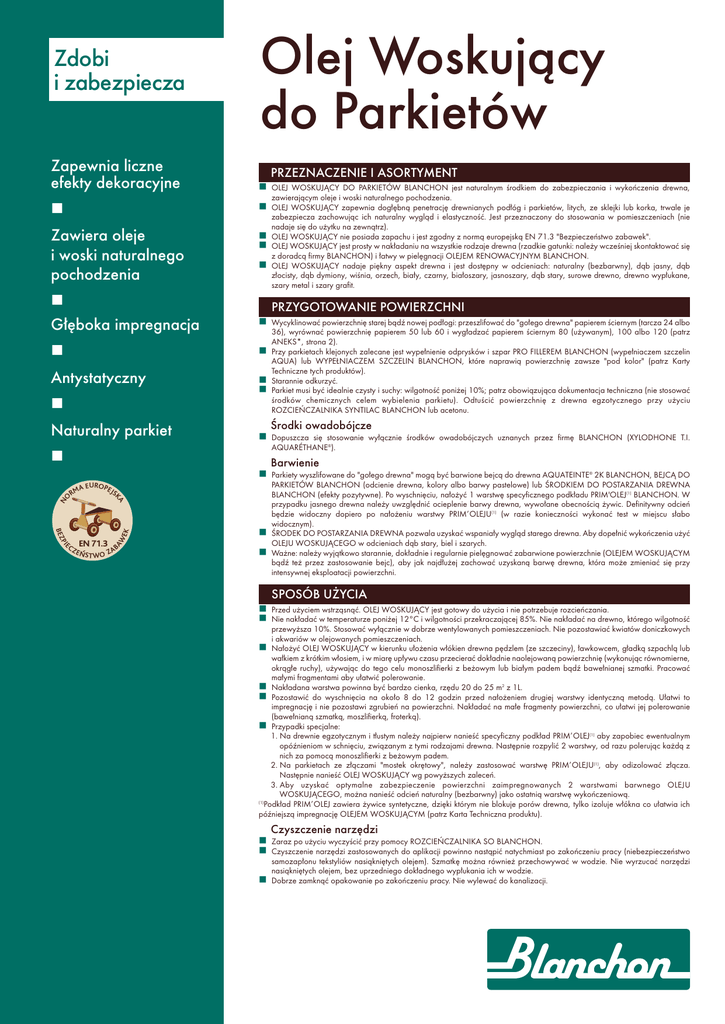 EUROPÉE N EN 71.3 E U TS CU RIT É DES JO Antystatyczny Version Française n Naturalny parkiet n n n n n n Barwienie NO KA EK NE E Parkiety wyszlifowane do "gołego drewna" mogą być barwione bejcą do drewna AQUATEINTE® 2K BLANCHON, BEJCĄ DO PARKIETÓW (odcienie drewna, kolory albo barwy pastelowe) lub ŚRODKIEM DO POSTARZANIA DREWNA RM RO NOBLANCHON EU BLANCHON (efekty pozytywne). Po wyschnięciu, nałożyć 1 warstwę specyficznego podkładu PRIM'OLEJ(1) BLANCHON. W przypadku jasnego drewna należy uwzględnić ocieplenie barwy drewna, wywołane obecnością żywic. Definitywny odcień E EUROPÉEN wykonać test w miejscu słabo będzie widoczny dopiero po nałożeniu warstwy PRIM’OLEJU(1) (w razie konieczności RM widocznym). ŚRODEK DO POSTARZANIA DREWNA pozwala uzyskać wspaniały wygląd starego drewna. Aby dopełnić wykończenia użyć OLEJU WOSKUJĄCEGO w odcieniach dąb stary, biel i szarych. 71.3 N E EN FO RE Ważne: starannie, dokładnie i regularnie pielęgnować zabarwione powierzchnie (OLEJEM WOSKUJĄCYM Rnależy C H I L Dwyjątkowo bądź też przez zastosowanie bejc), aby jak najdłużej zachować uzyskaną barwę drewna, która może zmieniać się przy CU EN 71.3 E intensywnej eksploatacji powierzchni. R U L PI AW Dopuszcza się stosowanie wyłącznie środków owadobójczych uznanych przez firmę BLANCHON (XYLODHONE T.I. AQUARÉTHANE®). AB SUIT BEZ n T WO Z NOIR Środki owadobójcze n EN 71.3 B A ENS ÉEN Wycyklinować powierzchnię starej bądź nowej podłogi: przeszlifować do "gołego drewna" papierem ściernym (tarcza 24 albo 36), wyrównać powierzchnię papierem 50 lub 60 i wygładzać papierem ściernym 80 (używanym), 100 albo 120 (patrz ANEKS*, strona 2). CU EN 71.3 E Przy parkietach klejonych zalecane jest wypełnienie odprysków i szpar PRO FILLEREM BLANCHON (wypełniaczem szczelin RIT U É DES JO zawsze "pod kolor" (patrz Karty AQUA) lub WYPEŁNIACZEM SZCZELIN BLANCHON, które naprawią powierzchnię Techniczne tych produktów). Starannie odkurzyć. Parkiet musi być idealnie czysty i suchy: wilgotność poniżej 10%; patrz obowiązująca dokumentacja techniczna (nie stosować środków chemicznych celem wybielenia parkietu). Odtuścić powierzchnię z drewna egzotycznego przy użyciu ROZCIEŃCZALNIKA SYNTILAC BLANCHON lub acetonu. n A EUROPEJS RM CZ PRZYGOTOWANIE POWIERZCHNI E RM SÉ SÉ n NE NO ME n NO UG TS ZE TT OL I EU Version Allemande SÉ Version Italienne NE DEI GIO HE UR EN 71.3 A C ZA P. 4975C SIC SIC EZ SPOSÓB UŻYCIA Przed użyciem wstrząsnąć. OLEJ WOSKUJĄCY jest gotowy do użycia i nie potrzebuje rozcieńczania. Nie nakładać w temperaturze poniżej 12°C i wilgotności przekraczającej 85%. Nie nakładać na drewno, którego wilgotność przewyższa 10%. Stosować wyłącznie w dobrze wentylowanych pomieszczeniach. Nie pozostawiać kwiatów doniczkowych i akwariów w olejowanych pomieszczeniach. n Nałożyć OLEJ WOSKUJĄCY w kierunku ułożenia włókien drewna pędzlem (ze szczeciny), ławkowcem, gładką szpachlą lub wałkiem z krótkim włosiem, i w miarę upływu czasu przecierać dokładnie naolejowaną powierzchnię (wykonując równomierne, ISCHE NO PÄruchy), okrągłe używając do tego celu monoszlifierki z beżowym lub białym padem bądź bawełnianej szmatki. Pracować R RO małymi fragmentami aby ułatwić polerowanie. n Nakładana warstwa powinna być bardzo cienka, rzędu 20 do 25 m2 z 1L. identyczną metodą. Ułatwi to n Pozostawić do wyschnięcia na około 8 do 12 godzin przed nałożeniem drugiej ROPÉ E EUwarstwy EN RM powierzchni, co ułatwi jej polerowanie impregnację i nie pozostawi zgrubień na powierzchni. Nakładać na małe fragmenty (bawełnianą szmatką, moszlifierką, froterką). DIN EN 71.3 RH n Przypadki IEL EIT specjalne: VON SP 1. Na drewnie egzotycznym i tłustym należy najpierw nanieść specyficzny podkład PRIM’OLEJ(1) aby zapobiec ewentualnym opóźnieniom w schnięciu, związanym z tymi rodzajami drewna. Następnie rozpylić 2 warstwy, od razu polerując każdą z nich za pomocą monoszlifierki z beżowym padem. CU EN 71.3 E (1) RIT PRIM’OLEJU U , aby odizolować złącza. 2. Na parkietach ze złączami "mostek okrętowy", należy zastosować warstwę É DES JO Następnie nanieść OLEJ WOSKUJĄCY wg powyższych zaleceń. 3. Aby uzyskać optymalne zabezpieczenie powierzchni zaimpregnowanych 2 warstwami barwnego OLEJU WOSKUJĄCEGO, można nanieść odcień naturalny (bezbarwny) jako ostatnią warstwę wykończeniową. (1) Podkład PRIM’OLEJ zawiera żywice syntetyczne, dzięki którym nie blokuje porów drewna, tylko izoluje włókna co ułatwia ich późniejszą impregnację OLEJEM WOSKUJĄCYM (patrz Karta Techniczna produktu). M N MA EUROPE A OR ITÉ DES J O Version Anglaise n n TS SÉ Version Polonaise NE n R Głęboka impregnacja n n TS Zawiera oleje i woski naturalnego pochodzenia OLEJ WOSKUJĄCY DO PARKIETÓW BLANCHON jest naturalnym środkiem do zabezpieczania i wykończenia drewna, zawierającym oleje i woski naturalnego pochodzenia. OLEJ WOSKUJĄCY zapewnia dogłębną penetrację drewnianych podłóg i parkietów, litych, ze sklejki lub korka, trwale je zabezpiecza zachowując ich naturalny wygląd i elastyczność. Jest przeznaczony do stosowania w pomieszczeniach (nie nadaje się do użytku na zewnątrz). OLEJ WOSKUJĄCY nie posiada zapachu i jest zgodny z normą europejską EN 71.3 "Bezpieczeństwo zabawek". OLEJ WOSKUJĄCY jest prosty w nakładaniu na wszystkie rodzaje drewna (rzadkie gatunki: należy wcześniej skontaktować się z doradcą firmy BLANCHON) i łatwy w pielęgnacji OLEJEM RENOWACYJNYM BLANCHON. OLEJ WOSKUJĄCY nadaje piękny aspekt drewna i jest dostępny w odcieniach: naturalny (bezbarwny), dąb jasny, dąb złocisty, dąb dymiony, wiśnia, orzech, biały, czarny, białoszary, jasnoszary, dąb stary, surowe drewno, drewno wypłukane, szary metal i szary grafit. EUROP NO n PRZEZNACZENIE I ASORTYMENT NO n n TO YS Zapewnia liczne efekty dekoracyjne O