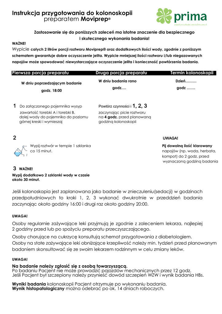 Instrukcja przygotowania do kolonoskopii preparatem Moviprep® Zastosowanie się do poniższych zaleceń ma istotne znaczenie dla bezpiecznego i skutecznego wykonania badania! WAŻNE! Wypicie całych 2 litrów porcji roztworu Moviprep® oraz dodatkowych ilości wody, zgodnie z poniższym schematem gwarantuje dobre oczyszczenie jelita. Wypicie mniejszej ilości roztworu i/lub niegazowanych napojów może spowodować niewystarczające oczyszczenie jelita i konieczność powtórzenia badania. Pierwsza porcja preparatu W dniu poprzedzającym badanie godz. 18:00 1 Termin kolonoskopii W dniu badania rano Dzień……… godz…. godz ……. Do załączonego pojemnika wysyp Powtórz czynności i 1, zawartość torebki A i torebki B. dolej wody do pojemnika do poziomu górnej kreski i wymieszaj zaczynając picie roztworu na 4 godz. przed planowaną godziną kolonoskopii 2 2, 3 UWAGA! Wypij roztwór w tempie 1 szklanka co 15 minut. 3 Druga porcja preparatu Pij dowolną ilość klarowany napojów (np. woda, herbata, kompot) do 2 godz. przed wyznaczoną godziną badania WAŻNE! Wypij dodatkowo 2 szklanki wody w czasie około 30 minut. Jeśli kolonoskopia jest zaplanowana jako badanie w znieczuleniu(sedacji) w godzinach przedpołudniowych to kroki 1, 2, 3 wykonać dwukrotnie w przeddzień badania zaczynając około godziny 16:00 i drugi raz około godziny 20:00. UWAGA! Osoby regularnie zażywające leki przyjmują je zgodnie z zaleceniem lekarza, najlepiej 2 godziny przed lub po spożyciu preparatu przeczyszczającego. Osoby chorujące na cukrzycę konsultują schemat przygotowania z diabetologiem. Osoby na stałe zażywające leki obniżające krzepliwość należy min. tydzień przed planowanym badaniem skonsultować się ze swoim lekarzem rodzinnym w celu zmiany leków. UWAGA! Na badanie należy zgłosić się z osobą towarzyszącą. Po badaniu Pacjent nie może prowadzić pojazdów mechanicznych przez 12 godz. Jeśli Pacjent był szczepiony należy przynieść dowód szczepień WZW i wynik badania HBs. Wyniki badania kolonoskopii Pacjent otrzymuje po wykonaniu badania. Wynik histopatologiczny można odebrać po ok. 14 dniach roboczych. Dieta przed kolonoskopią: Na 3 dni przed planowaną kolonoskopią: • nie jedz pieczywa z ziarnami, owoców pestkowych (np. winogron, pomidorów, kiwi, truskawek) oraz nasion siemienia lnianego, maku i sezamu (pestki i nasiona zalegające w jelicie utrudniają badanie) • poza tym zwykła dieta W przeddzień badania: • lekkostrawne ubogoresztkowe śniadanie: ■ możesz pić w dowolnej ilości: herbatę, kawę bez fusów - czarną lub z mlekiem, klarowny sok, kompot, wodę ■ możesz zjeść: bułeczkę lub kromkę chleba z masłem, z serem, jajkiem na twardo, plastrem wędliny • około godz. 13:00-15:00 możesz zjeść zupę typu krem albo przecedzony bulion • od godziny 15:00 nie możesz jeść żadnych posiłków • możesz ssać landrynki • możesz dodatkowo pić klarowne płyny (wodę, herbatę, sok, kompot) W dniu planowanej kolonoskopii: • na śniadanie: herbata, kawa bez fusów, kompot, woda (do 2 godz. przed badaniem, jeżeli kolonoskopia jest planowana przed południem) • nie możesz jeść żadnych posiłków • możesz ssać landrynki • możesz dodatkowo pić klarowne płyny (wodę, herbatę, kompot) do 2 godz. przed badaniem UWAGA! Po kolonoskopii wracasz do codziennej diety UWAGA!!! Powyższe zalecenia mają charakter ramowy i ogólny. Należy w każdym przypadku kierować się zaleceniami producenta leku umieszczonymi na ulotce dołączonej do opakowania leku.