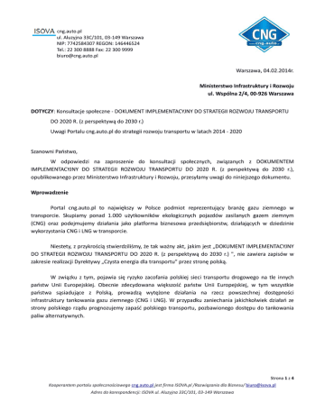 cng.auto.pl ul. Aluzyjna 33C/101, 03-149 Warszawa NIP: 7742584307 REGON: 146446524 Tel.: 22 300 8888 Fax: 22 300 9999 [email protected] Warszawa, 04.02.2014r. Ministerstwo Infrastruktury i Rozwoju ul. Wspólna 2/4, 00-926 Warszawa DOTYCZY: Konsultacje społeczne - DOKUMENT IMPLEMENTACYJNY DO STRATEGII ROZWOJU TRANSPORTU DO 2020 R. (z perspektywą do 2030 r.) Uwagi Portalu cng.auto.pl do strategii rozwoju transportu w latach 2014 - 2020 Szanowni Państwo, W odpowiedzi na zaproszenie do konsultacji społecznych, związanych z DOKUMENTEM IMPLEMENTACYJNY DO STRATEGII ROZWOJU TRANSPORTU DO 2020 R. (z perspektywą do 2030 r.), opublikowanego przez Ministerstwo Infrastruktury i Rozwoju, przesyłamy uwagi do niniejszego dokumentu. Wprowadzenie Portal cng.auto.pl to największy w Polsce podmiot reprezentujący branżę gazu ziemnego w transporcie. Skupiamy ponad 1.000 użytkowników ekologicznych pojazdów zasilanych gazem ziemnym (CNG) oraz podejmujemy działania jako platforma biznesowa przedsiębiorstw, działających w dziedzinie wykorzystania CNG i LNG w transporcie. Niestety, z przykrością stwierdziliśmy, że tak ważny akt, jakim jest „DOKUMENT IMPLEMENTACYJNY DO STRATEGII ROZWOJU TRANSPORTU DO 2020 R. (z perspektywą do 2030 r.) ", nie zawiera zapisów w zakresie realizacji Dyrektywy „Czysta energia dla transportu” przez stronę polską. W związku z tym, pojawia się ryzyko zacofania polskiej sieci transportu drogowego na tle innych państw Unii Europejskiej. Obecnie zdecydowana większość państw Unii Europejskiej, w tym wszystkie państwa sąsiadujące z Polską, prowadzą wytężone działania na rzecz powszechnej dostępności infrastruktury tankowania gazu ziemnego (CNG i LNG). W przypadku zaniechania jakichkolwiek działań ze strony polskiego rządu prognozujemy zapaść polskiego transportu, pozbawionego dostępu do tankowania paliw alternatywnych. Strona 1 z 4 Kooperantem portalu społecznościowego cng.auto.pl jest firma ISOVA.pl /Rozwiązania dla Biznesu/ [email protected] Adres do korespondencji: ISOVA ul. Aluzyjna 33C/101, 03-149 Warszawa cng.auto.pl ul. Aluzyjna 33C/101, 03-149 Warszawa NIP: 7742584307 REGON: 146446524 Tel.: 22 300 8888 Fax: 22 300 9999 [email protected] Istniejące dysproporcje przedstawiamy w poniższej tabeli. Liczba mieszkańców Państwa UE Ilość stacji CNG i LNG Polska Czeska Republika Niemcy Słowacja 25 52 920 14 38,5 mln 10,5 mln 80,3 mln 5,4 mln Liczba mieszkańców na stację CNG i LNG 0,065 0,495 1,146 0,259 Tabela. Dostępność stacji CNG i LNG na 100.000 mieszkańców Liczba stacji CNG/LNG na 100.000 mieszkańców 1,5 1 0,5 0 Niemcy Czeska Republika Słowacja Polska Wykres. Dostępność stacji CNG i LNG na 100.000 mieszkańców w wybranych państwach Unii Europejskiej 1. Uwagi ogólne 1.1. Wpisanie założeń Dyrektywy „Czysta energia dla transportu” do treści strategii Po lekturze dokumentu stwierdziliśmy, że w niniejszym opracowaniu w ogóle nie poruszono kwestii związanych z Dyrektywą „Czysta energia dla transportu”. Dokument ten nałoży na Polskę obowiązek zapewnienia podstawowego dostępu do tankowania paliw alternatywnych (przede wszystkim CNG i LNG). Co ważne, sąsiadujące z Polską państwa Unii Europejskiej posiadają już stosowne rozwiązania prawne w tym zakresie oraz rzeczywisty dostęp do tankowania paliw alternatywnych. Niepodjęcie przez stronę polską tej kwestii niesie ze sobą ryzyko niekompatybilności polskiego transportu z systemem europejskim oraz obniżenie konkurencyjności polskich przedsiębiorstw na unijnym rynku transportowym. Strona 2 z 4 Kooperantem portalu społecznościowego cng.auto.pl jest firma ISOVA.pl /Rozwiązania dla Biznesu/ [email protected] Adres do korespondencji: ISOVA ul. Aluzyjna 33C/101, 03-149 Warszawa cng.auto.pl ul. Aluzyjna 33C/101, 03-149 Warszawa NIP: 7742584307 REGON: 146446524 Tel.: 22 300 8888 Fax: 22 300 9999 [email protected] 2. Uwagi szczegółowe 2.1. Wpisanie Dyrektywy „Czysta energia dla transportu” wśród celów UE Postulujemy, aby na stronie 5 dokumentu, wśród celów Unii Europejskiej znalazła się adnotacja o realizowaniu założeń Dyrektywy „Czysta energia dla transportu” ze szczególnym naciskiem na budowę infrastruktury tankowania CNG i LNG przy szlakach transportowych sieci TEN-T. 2.2. Wpisanie wykorzystanie paliw alternatywnych wśród celów operacyjnych Postulujemy, aby na stronie 6 dokumentu, wśród celów operacyjnych dodano cel wdrożenia paliw niskoemisyjnych razem ze zmniejszeniem emisji transportu w oparciu o zapisy Dyrektywy „Czysta energia dla transportu”. 2.3. Wpisanie braku dostępu do paliw alternatywnych przy polskiej sieci drogowej Postulujemy, aby na stronie 15 dokumentu, w punkcie 2.3.2., wśród wad obecnie istniejącej sieci dróg poruszono brak dostępności do infrastruktury tankowania paliw alternatywnych. W państwach UE-15 istnieje powszechna dostępności do niniejszej infrastruktury, natomiast w pozostałych państwach UE, np. w Czeskiej Republice, podejmowane są liczne działania nakierowane na osiągnięcie tego celu (głównie infrastruktura tankowania CNG). W związku z tym istnieje pilna potrzeba zawarcia w planach rozwoju sieci drogowej budowy infrastruktury tankowania paliw alternatywnych, ze szczególnym położeniem nacisku na stacje CNG i LNG. W związku z tym apelujemy o dodanie wady dotyczącej braku dostępu do tankowania paliw alternatywnych. Odpowiedzią na to wyzwanie będzie wdrożenie rozwiązań zawartych w Dyrektywie „Czysta energia dla transportu”. 2.4. Dodanie wśród celów dla transportu drogowego „dostępności do infrastruktury tankowania paliw alternatywnych” Obecny dysonans w dostępności do tankowania paliw alternatywnych (głównie CNG i LNG) między Polską a pozostałymi państwami Unii Europejskiej, jest przyczyną narastającego opóźnienia rozwoju polskiego transportu pod względem minimalizacji emisji szkodliwych spalin na tle wspólnoty. Ponadto syt
