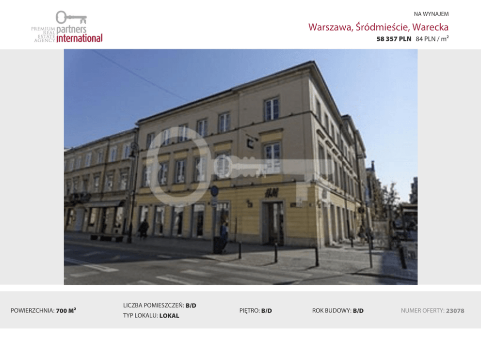 NA WYNAJEM Warszawa, Śródmieście, Warecka 58 357 PLN 84 PLN / m² POWIERZCHNIA: 700 M² LICZBA POMIESZCZEŃ: B/D TYP LOKALU: LOKAL PIĘTRO: B/D ROK BUDOWY: B/D NUMER OFERTY: 23078 Opis Lokal biurowy w eleganckiej kamienicy w centrum LOKALIZACJA w Centrum Warszawy mieści się obiekt, który odznacza olbrzymi potencjał biznesowy. Budynek znajduje się w bezpośrednim sąsiedztwie najbardziej popularnych restauracji i klubów, modnych butików czy galerii w Warszawie. Dlatego życie tutaj tętni od rana aż do zmierzchu. Niewielka odległość od Starego Miasta gwarantuje stały przepływ pieszych. Natomiast bliskość ważnej trasy komunikacyjnej w stolicy zapewnia łatwy dojazd samochodem. W niedalekim sąsiedztwie znajdują się liczne przystanki tramwajowe i autobusowe oraz stacja metra. Ponadto obiekt jest oddalony zaledwie 2 minuty od Ronda de Gaulle’a oraz 10 minut od Dworca Centralnego, co ułatwia dotarcie do niego przybywającym do Warszawy w celach biznesowych bądź turystycznych. To prestiżowa lokalizacja również ze względu na otoczenie. Znajdują się tutaj sklepy i wystawy najbardziej znanych, a niejednokrotnie ekskluzywnych firm odzieżowych. Usytuowanie budynku zapewnia doskonałą ekspozycję, warto więc dołączyć do ich grona. Pośrednik odpowiedzialny: Joanna Czapska (licencja zawodowa nr 4585)Przedstawiona wyżej propozycja nie jest ofertą handlową w rozumieniu przepisów prawa lecz ma charakter informacyjny. Wszelkie dane dotyczące nieruchomości uzyskano na podstawie oświadczeń Właścicieli bądź ich pełnomocników. Lokalizacja Katarzyna Joanna Czapska Katarzyna Joanna Czapska Ul. Koszykowa 10/19 00-564 Warszawa tel. (+48 22) 646 52 02 fax: (+48 22) 646 26 99 partnersinternational.pl Pośrednik odpowiedzialny: SEKRETARIAT PI telefon: 501551451 email: [email protected]