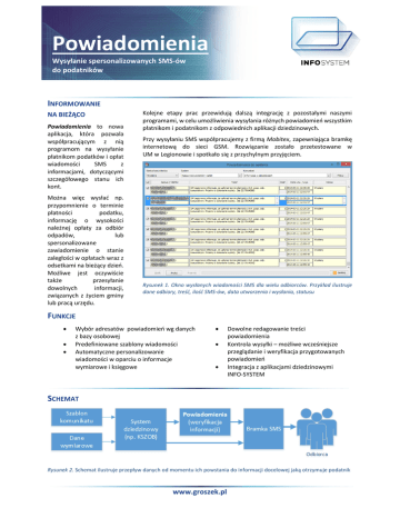 Powiadomienia Wysyłanie spersonalizowanych SMS-ów do podatników INFORMOWANIE NA BIEŻĄCO Powiadomienia to nowa aplikacja, która pozwala współpracującym z nią programom na wysyłanie płatnikom podatków i opłat wiadomości SMS z informacjami, dotyczącymi szczegółowego stanu ich kont. Można więc wysłać np. przypomnienie o terminie płatności podatku, informację o wysokości należnej opłaty za odbiór odpadów, lub spersonalizowane zawiadomienie o stanie zaległości w opłatach wraz z odsetkami na bieżący dzień. Możliwe jest oczywiście także przesyłanie dowolnych informacji, związanych z życiem gminy lub pracą urzędu. Kolejne etapy prac przewidują dalszą integrację z pozostałymi naszymi programami, w celu umożliwienia wysyłania różnych powiadomień wszystkim płatnikom i podatnikom z odpowiednich aplikacji dziedzinowych. Przy wysyłaniu SMS współpracujemy z firmą Mobitex, zapewniająca bramkę internetową do sieci GSM. Rozwiązanie zostało przetestowane w UM w Legionowie i spotkało się z przychylnym przyjęciem. Rysunek 1. Okno wysłanych wiadomości SMS dla wielu odbiorców. Przykład ilustruje dane odbiory, treść, ilość SMS-ów, data utworzenia i wysłania, statusu FUNKCJE Wybór adresatów powiadomień wg danych z bazy osobowej Predefiniowane szablony wiadomości Automatyczne personalizowanie wiadomości w oparciu o informacje wymiarowe i księgowe Dowolne redagowanie treści powiadomienia Kontrola wysyłki – możliwe wcześniejsze przeglądanie i weryfikacja przygotowanych powiadomień Integracja z aplikacjami dziedzinowymi INFO-SYSTEM SCHEMAT Rysunek 2. Schemat ilustruje przepływ danych od momentu ich powstania do informacji docelowej jaką otrzymuje podatnik www.groszek.pl