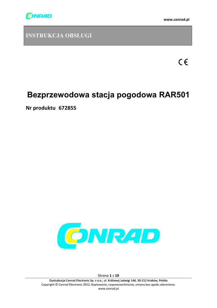 www.conrad.pl INSTRUKCJA OBSŁUGI Bezprzewodowa stacja pogodowa RAR501 Nr produktu 672855 Strona 1 z 10 Dystrybucja Conrad Electronic Sp. z o.o., ul. Królowej Jadwigi 146, 30-‐212 Kraków, Polska Copyright © Conrad Electronic 2012, Kopiowanie, rozpowszechnianie, zmiany bez zgody zabronione. www.conrad.pl www.conrad.pl PRZEGLĄD WIDOK Z PRZODU 1. Prognoza pogody 2. 3. 4. 5. 6. Ostrzeżenie przed powstawaniem grzyba Niski stan baterii jednostki podstawowej Temperatura i wilgotność powietrza w miejscu ustawienia jednostki podstawowej Temperatura i wilgotność powietrza w miejscu ustawienia nadajnika Dostosowywane etykiety z nazwami Strona 2 z 10 Dystrybucja Conrad Electronic Sp. z o.o., ul. Królowej Jadwigi 146, 30-‐212 Kraków, Polska Copyright © Conrad Electronic 2012, Kopiowanie, rozpowszechnianie, zmiany bez zgody zabronione. www.conrad.pl www.conrad.pl WIDOK Z TYŁU 1. Otwór do montażu na ścianie 2. Przegroda na baterie 3. Rozkładany stojak 4. °C/°F: Wybór jednostki temperatury 5. RESET: Przywracanie ustawień domyślnych urządzenia NADAJNIK Produkt ten może pracować z maksymalnie 3 nadajnikami, aby mierzyć temperaturę i względną wilgotność powietrza w różnych miejscach w mieszkaniu. W zestawie znajduje się kompletny zestaw 3 nadajników. Kolejne bezprzewodowe radiowe jednostki nadawcze mogą być zamawiane osobno. THGR122N Nadajnik wskazuje w wygodny sposób temperaturę/wilgotność powietrza. Dlatego też idealnie sprawdza się w miejscach (np. pokój dziecięcy), w których można odczytać dane przy jednym spojrzeniu, bez konieczności wykorzystywania za każdym razem jednostki podstawowej. 1. 2. 3. 4. 5. 6. Wyświetlacz LCD Wskaźnik stanu LED Otwór do montażu na ścianie RESET Przełącznik kanałów Przegroda na baterie Strona 3 z 10 Dystrybucja Conrad Electronic Sp. z o.o., ul. Królowej Jadwigi 146, 30-‐212 Kraków, Polska Copyright © Conrad Electronic 2012, Kopiowanie, rozpowszechnianie, zmiany bez zgody zabronione. www.conrad.pl www.conrad.pl 1. Wskaźnik stanu LED 2. Otwór do montażu na ścianie 3. Przegroda na baterie 4. RESET 5. Przełącznik kanałów AKCESORIA – ZAMAWIANE OSOBNO Opcjonalne bezprzewodowe radiowe jednostki nadawcze, podane poniżej, mogą być zamawiane osobno. Dalsze informacje można uzyskać u sprzedawcy na miejscu.* -‐THGR122N / THGN122N -‐ THGN132N * Poszczególne funkcje i akcesoria nie są dostępne we wszystkich krajach. PIERWSZE KROKI INSTALACJA NADAJNIKA RADIOWEGO 1. Krok ten dotyczy tylko THGR122N: Otworzyć pokrywę przegrody na baterie przy pomocy wkrętaka krzyżowego. 2. Przesunąć przełącznik kanału, aby wybrać kanał 1. Upewnić się, czy inne nadajniki (2, 3) wykorzystują własny kanał. 3. Założyć baterie, zwracając uwagę na prawidłowe ustawienie biegunów. 4. Po każdej wymianie baterii nacisnąć na RESET. 5. Założyć pokrywę przegrody na baterie. Strona 4 z 10 Dystrybucja Conrad Electronic Sp. z o.o., ul. Królowej Jadwigi 146, 30-‐212 Kraków, Polska Copyright © Conrad Electronic 2012, Kopiowanie, rozpowszechnianie, zmiany bez zgody zabronione. www.conrad.pl www.conrad.pl INSTALACJA JEDNOSTKI PODSTAWOWEJ 1. Otworzyć przegrodę na baterie. 2. Założyć baterie, zwracając uwagę na prawidłowe ustawienie biegunów. 3. Po każdej wymianie baterii nacisnąć na RESET. Symbol baterii może być wyświetlony w następujących obszarach: Zakres Znaczenie Obszar otoczenia Niski stan baterii jednostki jednostki podstawowej podstawowej Obszar otoczenia Niski stan baterii nadajnika nadajnika radiowego radiowego WSKAZÓWKA W przypadku tego produktu zaleca się stosowanie baterii alkalicznych dla dłuższej żywotności baterii oraz baterii litowych dla temperatur poniżej punktu zamarzania. Baterie nie mogą być narażane na oddziaływanie wysokich temperatur, np. przy promieniowaniu słonecznym lub w pobliżu paleniska. SYNCHRONIZACJA I MIEJSCE USTAWIENIA NADAJNIKÓW Jednostka podstawowa wyszukuje automatycznie nadajniki zresetowane na nowo w przeciągu 30 sekund. Jeśli synchronizacja z nadajnikiem nie zakończy się pomyślnie, to należy zresetować jednostkę podstawową i nadajnik lub wybrać inny kanał (nacisnąć na RESET). Symbol odbioru sygnału nadajnika radiowego wyświetla następujący stan: Symbole Znaczenie Jednostka podstawowa nadajnika (nadajników) wyszukuje Odnaleziono i zarejestrowano nadajnik Nie odnaleziono żadnego nadajnika Nadajnik powinien być ustawiony w odległości 30 m od jednostki podstawowej. Wskazówka Podczas ustawiania nadajników należy zapisać odpowiednie miejsca ustawienia każdego nadajnika. Przyporządkować je do miejsca przełącznika kanału (1, 2, 3) i dopasować je do symbolu kanału , który jest wyświetlany bezpośrednio nad etykietą z nazwą. Strona 5 z 10 Dystrybucja Conrad Electronic Sp. z o.o., ul. Królowej Jadwigi 146, 30-‐212 Kraków, Polska Copyright © Conrad Electronic 2012, Kopiowanie, rozpowszechnianie, zmiany bez zgody zabronione. www.conrad.pl www.conrad.pl -‐ Zasięg transmisji jest uzależniony od wielu czynników. Należy ewentualnie wypróbować kilka miejsc ustawienia, aby uzyskać optymalne wyniki. Dla uzyskania optymalnych wyników: -‐ Ustawiać nadajniki z dala od bezpośredniego promieniowania słonecznego i wilgoci. -‐ Ustawić nadajnik w taki sposób, aby był skierowany w stronę jednostki podstawowej oraz unikać przeszkód, takich jak drzwi, ściany i meble. -‐ Ustawiać nadajniki w miejscu z bezpośrednim widokiem na niebo i z dala od przedmiotów metalowych i urządzeń elektronicznych. ETYKIETY Z NAZWĄ Etykiety z nazwą mogą być montowane na jednostce podstawowej (patrz widok z przodu). W zestawie dostępne są 3 puste etykiety z nazwą. Na pustych etykietach można zapisać nazwy miejsc, w których zainstalowano nadajniki. PROGNOZA POGODY Produkt ten podaje prognozę pogody dla następnych 12 – 24 godzin w promieniu 30-‐50 km. Zakres prognozy pogody Symbol Opis Słonecznie Czę
