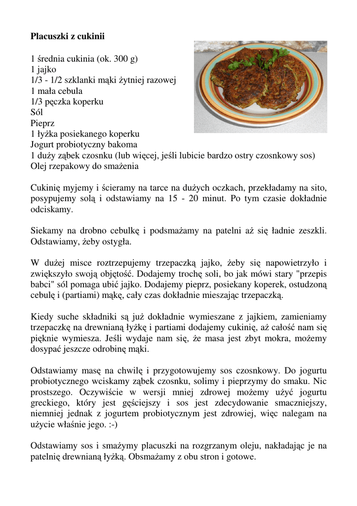 Placuszki z cukinii 1 średnia cukinia (ok. 300 g) 1 jajko 1/3 - 1/2 szklanki mąki żytniej razowej 1 mała cebula 1/3 pęczka koperku Sól Pieprz 1 łyżka posiekanego koperku Jogurt probiotyczny bakoma 1 duży ząbek czosnku (lub więcej, jeśli lubicie bardzo ostry czosnkowy sos) Olej rzepakowy do smażenia Cukinię myjemy i ścieramy na tarce na dużych oczkach, przekładamy na sito, posypujemy solą i odstawiamy na 15 - 20 minut. Po tym czasie dokładnie odciskamy. Siekamy na drobno cebulkę i podsmażamy na patelni aż się ładnie zeszkli. Odstawiamy, żeby ostygła. W dużej misce roztrzepujemy trzepaczką jajko, żeby się napowietrzyło i zwiększyło swoją objętość. Dodajemy trochę soli, bo jak mówi stary "przepis babci" sól pomaga ubić jajko. Dodajemy pieprz, posiekany koperek, ostudzoną cebulę i (partiami) mąkę, cały czas dokładnie mieszając trzepaczką. Kiedy suche składniki są już dokładnie wymieszane z jajkiem, zamieniamy trzepaczkę na drewnianą łyżkę i partiami dodajemy cukinię, aż całość nam się pięknie wymiesza. Jeśli wydaje nam się, że masa jest zbyt mokra, możemy dosypać jeszcze odrobinę mąki. Odstawiamy masę na chwilę i przygotowujemy sos czosnkowy. Do jogurtu probiotycznego wciskamy ząbek czosnku, solimy i pieprzymy do smaku. Nic prostszego. Oczywiście w wersji mniej zdrowej możemy użyć jogurtu greckiego, który jest gęściejszy i sos jest zdecydowanie smaczniejszy, niemniej jednak z jogurtem probiotycznym jest zdrowiej, więc nalegam na użycie właśnie jego. :-) Odstawiamy sos i smażymy placuszki na rozgrzanym oleju, nakładając je na patelnię drewnianą łyżką. Obsmażamy z obu stron i gotowe.