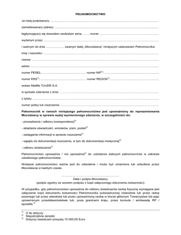PEŁNOMOCNICTWO Ja niżej podpisana/y: …………………………………………………………………………………………..… zameldowana/y (adres): ……………………………………………………………………………….……..…. legitymująca/y się dowodem osobistym seria ……. numer ………………………………………………..… wydanym przez …………………………………………………………………………………………………… i ważnym do dnia ……………… zwanym dalej „Mocodawcą” niniejszym ustanawiam Pełnomocnika: imię i nazwisko: ……………………………………………………………………………………………..……. nazwa: ……………….……………………………………………………………………….……………………. adres: ……………….…………………………………………………………………….……………………….. 1) numer PESEL: …………….……………………… numer NIP : …………………………………………..…. 1) 1) numer KRS : ..…….………………………..…..… numer REGON : .………………………..……………… wobec Metlife TUnŻiR S.A. w sprawie zdarzenia z dnia: …………………………….………………………………………………………. z tytułu: …………………………………………………………………………………………………………….. numer polisy lub roszczenia: ……………………………………………………………………………………. Pełnomocnik w ramach niniejszego pełnomocnictwa jest upoważniony do reprezentowania Mocodawcy w sprawie wyżej wymienionego zdarzenia, w szczególności do: - prowadzenia i odbioru korespondencji 2) - składania oświadczeń, wniosków, pism, podań - zasięgania informacji w sprawie roszczenia 2) 2) - wglądu do dokumentacji roszczenia, w tym do dokumentacji medycznej - odbioru świadczenia 2) 2) Pełnomocnictwo upoważnia / nie upoważnia udzielonego pełnomocnictwa. 2) do udzielania dalszych pełnomocnictw w zakresie Niniejsze pełnomocnictwo ważne jest do odwołania i może być zmienione lub odwołane przez Mocodawcę w każdym czasie. ………………………………………………… Data i podpis Mocodawcy (podpis zgodny ze wzorem podpisu z kopii załączonego dokumentu tożsamości) W przypadku, gdy pełnomocnictwo upoważnia do odbioru świadczenia osobę fizyczną wymagane jest załączenie kopii dokumentu tożsamości Pełnomocnika poświadczonej notarialnie lub przez radcę prawnego lub przez adwokata lub przez upoważnioną osobę w biurze głównym Towarzystwa lub jego uprawnionym przedstawicielstwie lub, poza granicami kraju, przez konsula / ambasadę RP / 3) apostille. 1) 2) 3) O ile dotyczy Niepotrzebne skreślić Dotyczy świadczeń powyżej 15 000,00 Euro