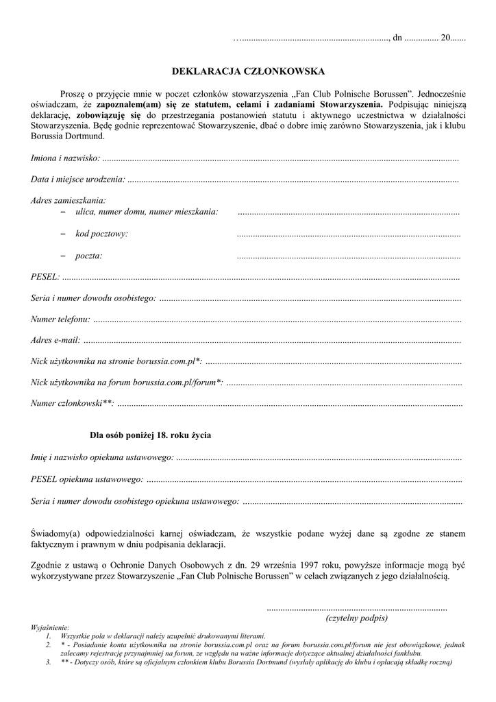 …................................................................, dn ............... 20....... DEKLARACJA CZŁONKOWSKA Proszę o przyjęcie mnie w poczet członków stowarzyszenia „Fan Club Polnische Borussen”. Jednocześnie oświadczam, że zapoznałem(am) się ze statutem, celami i zadaniami Stowarzyszenia. Podpisując niniejszą deklarację, zobowiązuję się do przestrzegania postanowień statutu i aktywnego uczestnictwa w działalności Stowarzyszenia. Będę godnie reprezentować Stowarzyszenie, dbać o dobre imię zarówno Stowarzyszenia, jak i klubu Borussia Dortmund. Imiona i nazwisko: ............................................................................................................................................................ Data i miejsce urodzenia: ................................................................................................................................................. Adres zamieszkania: – ulica, numer domu, numer mieszkania: ….............................................................................................. – kod pocztowy: .................................................................................................. – poczta: .................................................................................................. PESEL: .............................................................................................................................................................................. Seria i numer dowodu osobistego: …................................................................................................................................. Numer telefonu: ….............................................................................................................................................................. Adres e-mail: ….................................................................................................................................................................. Nick użytkownika na stronie borussia.com.pl*: …............................................................................................................. Nick użytkownika na forum borussia.com.pl/forum*: ….................................................................................................... Numer członkowski**: ….................................................................................................................................................... Dla osób poniżej 18. roku życia Imię i nazwisko opiekuna ustawowego: ............................................................................................................................. PESEL opiekuna ustawowego: …....................................................................................................................................... Seria i numer dowodu osobistego opiekuna ustawowego: …............................................................................................. Świadomy(a) odpowiedzialności karnej oświadczam, że wszystkie podane wyżej dane są zgodne ze stanem faktycznym i prawnym w dniu podpisania deklaracji. Zgodnie z ustawą o Ochronie Danych Osobowych z dn. 29 września 1997 roku, powyższe informacje mogą być wykorzystywane przez Stowarzyszenie „Fan Club Polnische Borussen” w celach związanych z jego działalnością. ............................................................................... (czytelny podpis) Wyjaśnienie: 1. Wszystkie pola w deklaracji należy uzupełnić drukowanymi literami. 2. * - Posiadanie konta użytkownika na stronie borussia.com.pl oraz na forum borussia.com.pl/forum nie jest obowiązkowe, jednak zalecamy rejestrację przynajmniej na forum, ze względu na ważne informacje dotyczące aktualnej działalności fanklubu. 3. ** - Dotyczy osób, które są oficjalnym członkiem klubu Borussia Dortmund (wysłały aplikację do klubu i opłacają składkę roczną)
