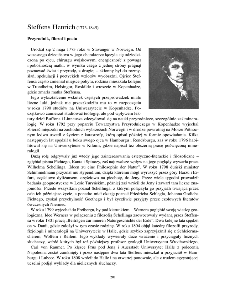 Steffens Henrich (1773−1845) Przyrodnik, filozof i poeta Urodził się 2 maja 1773 roku w Stavanger w Norwegii. Od wczesnego dzieciństwa w jego charakterze łączyła się odziedzi− czona po ojcu, chirurgu wojskowym, energiczność z powagą i pobożnością matki, w wyniku czego z jednej strony pragnął poznawać świat i przyrodę, z drugiej – skłonny był do rozmy− ślań, spekulacji i poetyckich wzlotów wyobraźni. Ojciec Stef− fensa często zmieniał miejsce pobytu, rodzina mieszkała kolejno w Trondheim, Helsingor, Roskilde i wreszcie w Kopenhadze, gdzie zmarła matka Steffensa. Jego wykształcenie wskutek częstych przeprowadzek miało liczne luki, jednak nie przeszkodziło mu to w rozpoczęciu w roku 1790 studiów na Uniwersytecie w Kopenhadze. Po− czątkowo zamierzał studiować teologię, ale pod wpływem lek− tury dzieł Buffona i Linneusza zdecydował się na nauki przyrodnicze, szczególnie zaś minera− logię. W roku 1792 przy poparciu Towarzystwa Przyrodniczego w Kopenhadze wyjechał zbierać mięczaki na zachodnich wybrzeżach Norwegii i w drodze powrotnej na Morzu Północ− nym ledwo uszedł z życiem z katastrofy, którą opisał później w formie opowiadania. Kilka następnych lat spędził u boku swego ojca w Hamburgu i Rendsburgu, zaś w roku 1796 habi− litował się na Uniwersytecie w Kilonii, gdzie napisał też obszerną pracę poświęconą mine− ralogii. Dużą rolę odgrywały już wtedy jego zainteresowania estetyczno−literackie i filozoficzne – zgłębiał pisma Fichtego, Kanta i Spinozy, zaś najtrwalsze wpływ na jego poglądy wywarła praca Wilhelma Schellinga „Ideen zu eine Philosophie der Natur”. W roku 1798 duński minister Schimmelmann przyznał mu stypendium, dzięki któremu mógł wyruszyć przez góry Harzu i Er− furt, częściowo dyliżansem, częściowo na piechotę, do Jeny. Przez wiele tygodni prowadził badania geognostyczne w Lesie Turyńskim, później zaś wrócił do Jeny i zawarł tam liczne zna− jomości. Przede wszystkim poznał Schellinga, z którym połączyła go przyjaźń trwająca przez całe ich późniejsze życie, a ponadto miał okazję poznać Friedricha Schlegla, Johanna Gotlieba Fichtego, zyskał przychylność Goethego i był życzliwie przyjęty przez czołowych literatów ówczesnych Niemiec. W roku 1799 wyjechał do Freibergu, by pod kierunkiem Wernera pogłębić swoją wiedzę geo− logiczną. Idee Wernera w połączeniu z filozofią Schellinga zaowocowały wydaną przez Steffen− sa w roku 1801 pracą „Beiträgen zur inneren Naturgeschichte der Erde”. Dwa kolejne lata spędził on w Danii, gdzie założył w tym czasie rodzinę. W roku 1804 objął katedrę filozofii przyrody, fizjologii i mineralogii na Uniwersytecie w Halle, gdzie szybko zaprzyjaźnił się z Schleierma− cherem, Wolfem i Reilem. Jego wykłady wywierały duże wrażenie i przyciągały licznych słuchaczy, wśród których był też późniejszy profesor geologii Uniwersytetu Wrocławskiego, Carl von Raumer. Po klęsce Prus pod Jeną i Auerstädt Uniwersytet Halle z polecenia Napoleona został zamknięty i przez następne dwa lata Steffens mieszkał u przyjaciół w Ham− burgu i Lubece. W roku 1808 wrócił do Halle i na otwartej ponownie, ale z trudem egzystującej uczelni podjął wykłady dla nielicznych słuchaczy. 201 Ponieważ kontaktował się z kręgami nastawionymi wrogo do Napoleona i Francuzów, znalazł się pod obserwacją francuskich agentów i po nieudanej próbie wywołania powstania, jaką podjął major Ferdinand Schill, najbezpieczniejszym wyjściem było dla niego przeniesienie się do Wrocławia. Na otwartej właśnie uczelni przygotował do zajęć Instytut Fizyki, rozpoczął wykłady z fizyki i filozofii, opracowywał podręcznik mineralogii, a równocześnie bacznie śledził bieżące wydarzenia polityczne. Gdy w lutym 1813 roku we wrocławskiej „Schlesische Zeitung” ukazała się odezwa króla Fryderyka Wilhelma III wzywająca do wojny z Francuzami, Steffens wygłosił na uniwersytecie płomienną mowę, która sprawiła, że niektórzy profesorowie wraz z dużą częś− cią studentów zaciągnęli się w szeregi pospolitego ruszenia. Sam Steffens, jako entuzjasta Prus, choć miał już 40 lat, zaciągnął się również, wziął udział w bitwach pod Grossgörschen, Bautzen, Wartenburgiem i Lipskiem, odznaczony został Żelaznym Krzyżem, a na uczelnię powrócił dopiero w roku 1814, po zajęciu Paryża. Brał aktywny udział w życiu Uniwersytetu Wrocławskiego, w roku akademickim 1818/19 był dziekanem Fakultetu Filozoficznego, zaś w latach 1821/22 oraz 1829/30 pełnił obowiązki rekto− ra. Poza fizyką i filozofią przyrody wykładał również geografię, zaś po odejściu Carla von Raumera, również geologię i mineralogię, przy czym jego dorobek mierzyć należy nie tyle rezul− tatami badań, co wpływem, jaki jego poglądy wywierały na licznych słuchaczach jego wykładów, wśród których było wielu późniejszych tak wybitnych przyrodników, jak Constantin Gloger, August Henschel, Augustyn Kaluza, Carl Rudolf Mentzel i Felix Rendschmidt. Szereg opublikowanych w tym czasie opowiadań i wierszy nacechowanych głęboką religijnością znacznie powiększył jego dorobek literacki. Przez szereg lat był członkiem Śląskiego Towarzyst− wa Kultury Ojczystej, które w roku 1832 wyróżniło go godnością członka honorowego. W roku 1822 wydał swoją „Antropologię”, w której człowiek jawił się jako mikrokosmiczne odzwier− ciedlenie Uniwersum oraz jedność natury i ducha, a traktowane bardzo swobodnie zagadnienia fizyczne, geologiczne i fizjologiczne ilustrowały rozwój świata od czynników nieorganicznych do moralności i świadomości religijnej, przez co dzieło to wzbudziło tyleż zachwytów, co sprzeciwów. W późniejszym okresie Steffens wdawał się często w zażarte spory i konflikty natury religijnej, w wyniku których czu