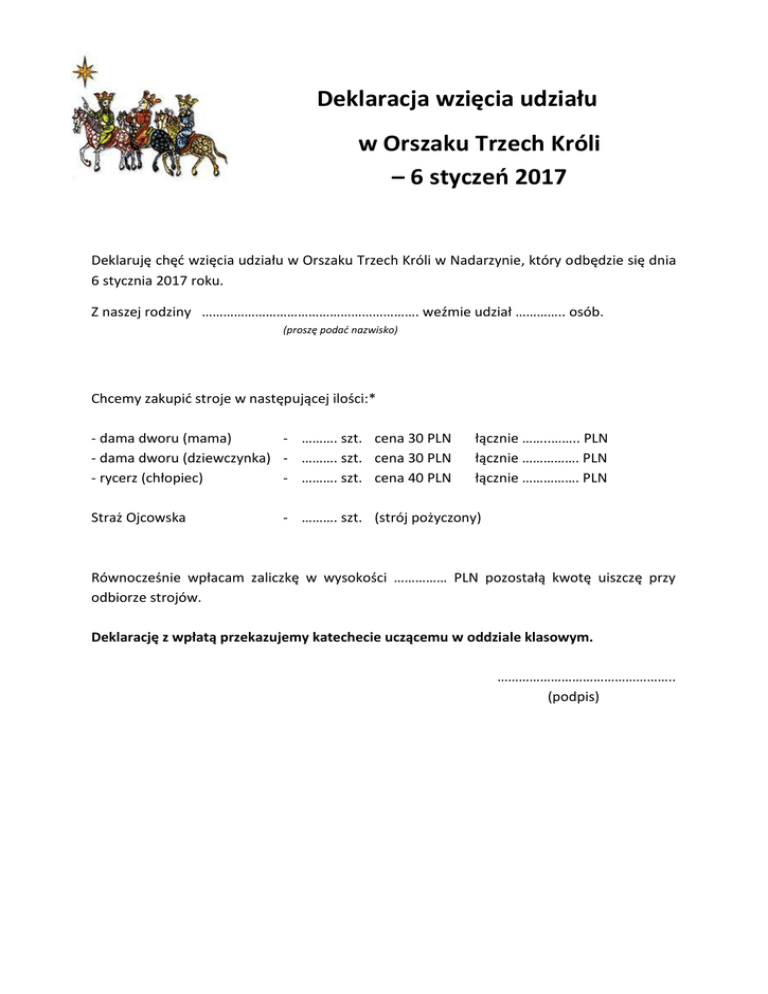 Deklaracja wzięcia udziału w Orszaku Trzech Króli – 6 styczeń 2017 Deklaruję chęć wzięcia udziału w Orszaku Trzech Króli w Nadarzynie, który odbędzie się dnia 6 stycznia 2017 roku. Z naszej rodziny ……………………………………………………. weźmie udział ………….. osób. (proszę podać nazwisko) Chcemy zakupić stroje w następującej ilości:* - dama dworu (mama) - ………. szt. cena 30 PLN - dama dworu (dziewczynka) - ………. szt. cena 30 PLN - rycerz (chłopiec) - ………. szt. cena 40 PLN Straż Ojcowska łącznie ……..…….. PLN łącznie ……………. PLN łącznie ……………. PLN - ………. szt. (strój pożyczony) Równocześnie wpłacam zaliczkę w wysokości …………… PLN pozostałą kwotę uiszczę przy odbiorze strojów. Deklarację z wpłatą przekazujemy katechecie uczącemu w oddziale klasowym. ………………………………………….. (podpis)