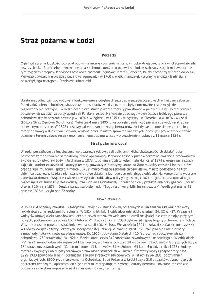 Archiwum Państwowe w Łodzi Straż pożarna w Łodzi Początki Ogień od zarania ludzkości posiadał podwójną naturę - ujarzmiony stanowił dobrodziejstwo, jako żywioł stawał się siłą niszczycielską. Z potrzeby przeciwstawienia się temu zagrożeniu pojawili się ludzie walczący z ogniem i związane z tym zajęciem przepisy. Pierwsze zachowane "porządki ogniowe" z terenu obecnej Polski pochodzą ze średniowiecza. Pierwsze powszechne przepisy pożarowe wprowadził w 1760 r. wielki marszałek koronny Franciszek Bieliński, a poszerzył jego następca - Stanisław Lubomirski. Utrata niepodległości spowodowała funkcjonowanie odrębnych przepisów przeciwpożarowych w każdym zaborze. Przed założeniem ochotniczej straży pożarnej sposoby walki z pożarami były normowane przez rosyjskie rozporządzenia policyjne. Pierwsze ochotnicze straże pożarne zaczęły powstawać w połowie XIX w. Do regularnych oddziałów strażackich zaborcy utrudniali Polakom wstęp. Na terenie obecnego województwa łódzkiego pierwsze ochotnicze straże pożarne powstały w 1874 r. w Zgierzu, w 1875 r. - w Łęczycy i w Sieradzu, a w 1876 - w Łodzi (Łódzka Straż Ogniowa Ochotnicza). Tutaj też 4 maja 1895 r. rozpoczęła działalność pierwsza zawodowa straż na omawianym obszarze. W 1898 r. ustawy zatwierdzane przez gubernatorów zostały zastąpione Ustawą normalną straży ogniowej w Królestwie Polskim, wydaną przez ministra spraw wewnętrznych, obowiązującą wszystkie straże pożarne z terenu zaboru rosyjskiego i zmienioną dopiero wraz z wprowadzeniem ustawy z 13 marca 1934 r. Straż pożarna w Łodzi W Łodzi początkowo za bezpieczeństwo pożarowe odpowiadali policjanci. Niska skuteczność ich działań była powodem zorganizowania samoobrony przeciwpożarowej. Pierwsze zespoły przeciwpożarowe złożone z pracowników swoich fabryk utworzył Ludwik Grohman w 1873 r., po nim zrobili to kolejni fabrykanci. W 1874 r. organizacją straży zajął się komitet założycielski straży pożarnej, powstały z inicjatywy Leopolda Zonera, który zatrudnił instruktorów oraz zakupił mundury i sprzęt. 4 marca 1876 r. miało miejsce zebranie założycielskie. Miasto podzielono na trzy dzielnice pożarowe, każda z nich stanowiła rejon działania jednego samodzielnego oddziału. Na komendanta wybrano Ludwika Grohmana. Wspólne ćwiczenia wszystkich oddziałów odbyły się 14 maja 1876 r. i jest to data formalnego rozpoczęcia działalności przez Łódzką Straż Ogniową Ochotniczą. Chrzest ogniowy przeszła ona przy gaszeniu pożaru drukarni 20 maja 1876 r. Dewizą straży stało się hasło: "Bogu na chwałę, bliźnim na pożytek". Według stanu na 31 grudnia 1876 r. liczyła ona 32 osoby. Nowe stulecie W 1901 r. 4 oddziały miejskie i 2 fabryczne liczyły 579 strażaków wyposażonych w kilkanaście sikawek oraz wozy rekwizytowe z narzędziami i drabinami. W 1914 r. istniało 9 oddziałów miejskich, w latach 30. XX w. -17. W czasie I wojny światowej wielu zawodowych i ochotniczych strażaków wcielono do armii rosyjskiej, nie zatrudniając przy tym nowych, pozbawiono też straże koni i taboru. W latach 20. XX w. ŁSOO była najsilniejszą tego typu formacją w Polsce. W tym też czasie powstała straż kolejowa na stacji Łódź Kaliska. We wrześniu 1921 r. związki strażackie połączyły się w Główny Związek Straży Pożarnych Rzeczpospolitej Polskiej. W okresie 1920-1925 zakupiono po raz pierwszy samochody i sikawki motorowo-benzynowe. Do 1925 r. powołano 5 stałych i 10 fabrycznych oddziałów straży ochotniczej (750 strażaków). W 1928 r. łódzka straż liczyła 842 strażaków zawodowych i ochotniczych. W oddziałach I-IV i Ia 26 samochodów obsługiwało 44 kierowców, a 8 końmi powoziło 10 woźniców. 11 oddziałów fabrycznych liczyło 184 strażaków zawodowych, 11 samochodów, 11 kierowców, 31 woźniców i 65 koni. 4 października 1928 r. łódzcy strażacy zwyciężyli na międzynarodowych zawodach strażackich w Turynie. Światowy kryzys gospodarczy z lat 1929-1933 spowodował m.in. ograniczenie liczby strażaków zawodowych. W latach 1934-1935, po zmianach organizacyjnych, ŁSOO przemianowana na Ochotniczą Straż Pożarną w Łodzi liczyła 316 strażaków, dysponujących aparatami tlenowymi, aparatami do cięcia metali, motopompami Syrena i autocysternami. Powołano też żeńskie oddziały samarytańsko-pożarnicze dla niesienia pomocy sanitarnej. 1 Archiwum Państwowe w Łodzi Organizacja Oddziały składały się z samodzielnych sekcji wyspecjalizowanych w określonych czynnościach (topornicy, sikawkowi, wodni, porządkowi). Oddział I - działał pomiędzy przedmieściami Bałut a ul. Cegielnianą (ob. Jaracza). Strażacy zbierali się początkowo w ratuszu na Nowym Rynku (ob. pl. Wolności), a od 1910 r. - w remizie z koszarami i stajnią przy ul. Konstantynowskiej 2. Oddział II - zabezpieczał centrum miasta pomiędzy ul. Jaracza a ul. Nawrot, a jego siedzibą była prowizoryczna remiza przy ul. Przejazd (ob. Tuwima). Oddział III - teren jego działalności obejmował część miasta pomiędzy obecną ul. Nawrot a ul. Przybyszewskiego. Siedziba oddziału mieściła się na rogu ul. Głównej i Piotrkowskiej, a później przy obecnej ul. Sienkiewicza 54. Oddział IV - powstał w 1882 r. i mieścił się przy ul. Zarzewskiej (ob. Przybyszewskiego). 4 maja 1895 r. w oddziale II powstał pierwszy zawodowy oddział straży pożarnej. Powstawały też nowe, dobrze wyposażone oddziały fabryczne, stające się niekiedy częścią ŁSOO (jak powstała 10 czerwca 1884 r. jednostka z zakładów Karola Scheiblera, która w 1928 r. wygrała Mistrzostwa Europy Straży Ogniowych w Turynie). 4 grudnia 1928 r. powstała nowoczesna strażnica przy ul. Zgierskiej 47, gdzie zaczął funkcjonować oddział pomocniczy Ia. Wyposażenie W czasach Łodzi rolniczej i w przemysłowych początkach miasta obrona przed ogniem polegała na samopomocy mieszkańc