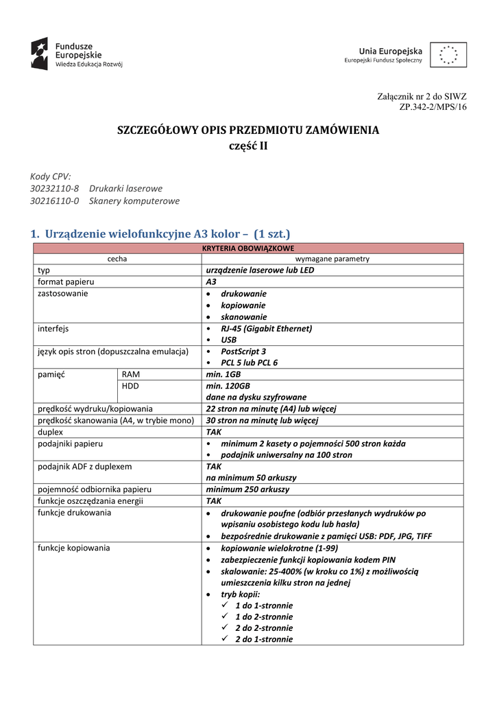 Załącznik nr 2 do SIWZ ZP.342-2/MPS/16 SZCZEGÓŁOWY OPIS PRZEDMIOTU ZAMÓWIENIA część II Kody CPV: 30232110-8 30216110-0 Drukarki laserowe Skanery komputerowe 1. Urządzenie wielofunkcyjne A3 kolor – (1 szt.) KRYTERIA OBOWIĄZKOWE cecha typ format papieru zastosowanie interfejs język opis stron (dopuszczalna emulacja) pamięć RAM HDD prędkość wydruku/kopiowania prędkość skanowania (A4, w trybie mono) duplex podajniki papieru podajnik ADF z duplexem pojemność odbiornika papieru funkcje oszczędzania energii funkcje drukowania funkcje kopiowania wymagane parametry urządzenie laserowe lub LED A3 drukowanie kopiowanie skanowanie • RJ-45 (Gigabit Ethernet) • USB • PostScript 3 • PCL 5 lub PCL 6 min. 1GB min. 120GB dane na dysku szyfrowane 22 stron na minutę (A4) lub więcej 30 stron na minutę lub więcej TAK • minimum 2 kasety o pojemności 500 stron każda • podajnik uniwersalny na 100 stron TAK na minimum 50 arkuszy minimum 250 arkuszy TAK drukowanie poufne (odbiór przesłanych wydruków po wpisaniu osobistego kodu lub hasła) bezpośrednie drukowanie z pamięci USB: PDF, JPG, TIFF kopiowanie wielokrotne (1-99) zabezpieczenie funkcji kopiowania kodem PIN skalowanie: 25-400% (w kroku co 1%) z możliwością umieszczenia kilku stron na jednej tryb kopii: 1 do 1-stronnie 1 do 2-stronnie 2 do 2-stronnie 2 do 1-stronnie funkcje skanowania funkcje faksowania integracja z usługami katalogowymi panel sterowania zarządzanie i kontrola stanu urządzenia wspierane systemy operacyjne (sterowniki drukarki) inne certyfikaty i standardy format pliku: PDF (w tym PDF/A), JPG, TIFF miejsce docelowe: na mail (możliwość stworzenia książki adresowej) na zasób sieciowy do pamięci USB (np. pendrive-a) przesłanie odebranych faksów na adres e-mail możliwość wysyłania faksów za pomocą komputera (na zasadzie „print to fax”) TAK (LDAP/MS Active Directory) kolorowy ekran dotykowy menu w języku polskim możliwość zabezpieczenia panelu przy pomocy PINu lub hasła • zarzadzanie i możliwość sprawdzenia stanu urządzenia przez interfejs WWW SNMPv3 Windows Vista (32bit/64bit) Windows 7 (32bit/64bit) Windows 8 (32bit/64bit) Windows 10 (32bit/64bit) sterowniki w języku polskim urządzenie powinno być zamontowane na dedykowanym stoliku/platformie z kółkami i umożliwiać przemieszczanie urządzenia EnergyStar KRYTERIA OPCJONALNE cecha większa prędkość wydruku/kopiowania większa prędkość skanowania (A4, w trybie mono) typ podajnika ADF z duplexem panel sterowania typ rozmiar większa pojemność odbiornika papieru większa pojemność podajnika ADF większa pojemność dysku pamięć RAM dodatkowe aplikacje minimalne wymagane parametry 25 str./min lub większa [1 pkt] 30 str./min lub większa [2 pkt] 35 str./min lub większa [5 pkt] maksymalnie Wykonawca może otrzymać 5 pkt 40 str./min lub większa [2 pkt] 50 str./min lub większa [4 pkt] 60 str./min lub większa [5 pkt] maksymalnie Wykonawca może otrzymać 5 pkt DADF: skanowanie dwóch stron kartki w jednym przebiegu [10 pkt] ekran pojemnościowy [5 pkt] ≥ 9 cali [2 pkt] minimum 500 stron [2 pkt] minimum 100 stron [2 pkt] powyżej 200GB [2 pkt] 1,5 GB [1 pkt] 2GB lub więcej [3 pkt] maksymalnie Wykonawca może otrzymać 3 pkt możliwość instalowania na urządzeniu dodatkowych aplikacji zwiększających funkcjonalność [2 pkt] otwarty interfejs podłączenia aplikacji zewnętrznych od producentów niezależnych [2 pkt] automatyczne usuwanie pustych stron podczas skanowania i kopiowania interaktywna pomoc zdalna obsługa możliwości rozbudowy TAK [1 pkt] skrócone instrukcje obsługi najpopularniejszych czynności (m.in. kopiowanie, skanowanie) w postaci filmów dostępne zamieszczone w postaci ikon uruchamianych i do oglądania na panelu dotykowym urządzenia [1 pkt] obsługa i zarządzanie panelem urządzenia w sposób zdalny z komputera administratora : na ekranie komputera ma być odwzorowany panel dotykowy urządzenia z pełną obsługą [5 pkt] obsługa i zarządzanie urządzeniem w sposób zdalny z komputera administratora : połączenie zdalne do panelu administratora urządzenia nie blokuje urządzenia dla użytkownika [3 pkt] możliwość instalacji dodatkowego podajnika papieru o dużej pojemności (minimum 2000 arkuszy A4) [5 pkt] możliwość instalacji czytnika kart pozwalającego na uwierzytelnianie użytkownika za pomocą kart magnetycznych i zbliżeniowych [5 pkt]