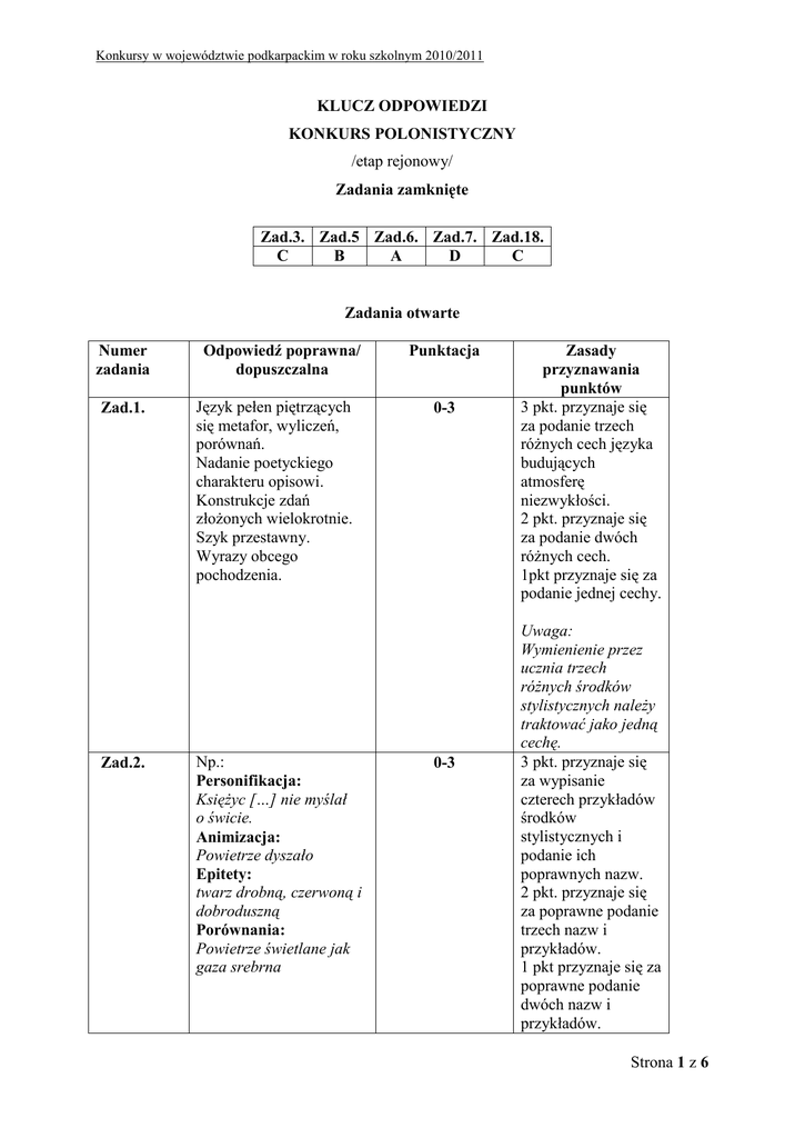 Konkursy w województwie podkarpackim w roku szkolnym 2010/2011 KLUCZ ODPOWIEDZI KONKURS POLONISTYCZNY /etap rejonowy/ Zadania zamknięte Zad.3. Zad.5 Zad.6. Zad.7. Zad.18. C B A D C Zadania otwarte Numer zadania Zad.1. Zad.2. Odpowiedź poprawna/ dopuszczalna Język pełen piętrzących się metafor, wyliczeń, porównań. Nadanie poetyckiego charakteru opisowi. Konstrukcje zdań złożonych wielokrotnie. Szyk przestawny. Wyrazy obcego pochodzenia. Np.: Personifikacja: Księżyc […] nie myślał o świcie. Animizacja: Powietrze dyszało Epitety: twarz drobną, czerwoną i dobroduszną Porównania: Powietrze świetlane jak gaza srebrna Punktacja 0-3 0-3 Zasady przyznawania punktów 3 pkt. przyznaje się za podanie trzech różnych cech języka budujących atmosferę niezwykłości. 2 pkt. przyznaje się za podanie dwóch różnych cech. 1pkt przyznaje się za podanie jednej cechy. Uwaga: Wymienienie przez ucznia trzech różnych środków stylistycznych należy traktować jako jedną cechę. 3 pkt. przyznaje się za wypisanie czterech przykładów środków stylistycznych i podanie ich poprawnych nazw. 2 pkt. przyznaje się za poprawne podanie trzech nazw i przykładów. 1 pkt przyznaje się za poprawne podanie dwóch nazw i przykładów. Strona 1 z 6 Konkursy w województwie podkarpackim w roku szkolnym 2010/2011 Zad.4. Zad.8. Zad.9. Zad.10. Zad.11. Synestezja to przypisywanie wrażeń odbieranych za pomocą jednego zmysłu innemu. Mieszanie się wrażeń znajduje odzwierciedlenie w języku, np. powietrze ma ciężar („jest lekkie”), ma kolor – jest „świetlane jak gaza srebrna”. Np. pora dnia (noc, pora marzeń sennych); pora roku; baśniowość; niezwykłe, nierealne, wydarzenia; utrata orientacji w czasie i przestrzeni; rozluźnienie poczucia czasu; odrealnienie miejsc rzeczywistych. Powiedział, że to dla mnie i stał się bardzo mały, jak konik z drzewa. 0-2 1 pkt przyznaje się za wyjaśnienie zjawiska synestezji. 1 pkt przyznaje się za odwołanie do przykładu. 0-3 3 pkt. przyznaje się za podanie czterech różnych elementów. 2 pkt. przyznaje się za podanie trzech różnych elementów. 1 pkt przyznaje się za podanie dwóch elementów. 0-1 Mitologia: Labirynt został zbudowany przez Dedala i znajdował się w pałacu w Knossos, na Krecie. W nim, według greckiego mitu, uwięziony był potwór Minotaur. Znaczenie: symbol zagubienia się, ale i poszukiwania duchowego centrum, dążenia do samopoznania. Np.: Tekst opowiadania B. Schulza mógłby ilustrować obraz Van Gogha, malowidło to jest bowiem malarską, impresjonistyczną wizją nocnego nieba, rozświetlonego przez gwiazdy i ich konstelacje. Natomiast obraz Chagalla jest podobnie jak tekst 0-2 1 pkt przyznaje się za przekształcenie tekstu na mowę zależną. 1 pkt przyznaje się za opisanie źródła motywu. 1 pkt przyznaje się za wyjaśnienie symbolicznego znaczenie motywu. 0-2 2 pkt. przyznaje się za podanie dwóch logicznie skonstruowanych argumentów. 1 pkt przyznaje się za podanie jednego logicznie skonstruowanego argumentu. Strona 2 z 6 Konkursy w województwie podkarpackim w roku szkolnym 2010/2011 Zad.13. Zad.14. Schulza, nieco surrealistyczny, ze względu na obecność nierealnych postaci jak kot z głową człowieka, latający ludzie, itp. Np. Kraina Lorien – niezwykle piękna Kraina Elfów, od wschodu otoczona rzeką Anduiną, czyli Wielką Rzeką. Miejsce, w którym zatrzymano czas, bez pór roku, starzenia się i rozpadu. Miejsce schronienia i przechowywania tego, co najpiękniejsze i najcenniejsze w obliczu zagrożenia złem czającym się w Mrocznej Puszczy i twierdzy Dol Guldur. Symboliczne znaczenie motywu – światłość i ciemność (często biel i czerń) to siły dobra i zła nieustannie toczące ze sobą walkę (wątek manichejski, biblijny). Przykłady: Ciemność – zło: Władca Ciemności – Sauron, otacza go symbolika mroku, czerni i nocy: Czarni Jeźdźcy Mordor – Czarny Kraj 0-3 0-3 1 pkt przyznaje się za uwzględnienie czterech informacji o krainie, pochodzących z tekstu II. 1 pkt przyznaje się za nadanie wypowiedzi formy hasła do słownika (np.: wyróżnienie hasła, dostosowanie stylu wypowiedzi). 1 pkt przyznaje się za poprawność językową, ortograficzną i interpunkcyjną (wymaga się tekstu bezbłędnego). Uwaga: Za tekst, w którym uczeń cytuje fragmenty przyznajemy 0 pkt. 1 pkt przyznaje się za wyjaśnienie motywu światła i ciemności 1 pkt przyznaje się za podanie trzech przykładów ilustrujących motyw światła. 1 pkt przyznaje się za podanie trzech przykładów ilustrujących motyw ciemności. Strona 3 z 6 Konkursy w województwie podkarpackim w roku szkolnym 2010/2011 Zad.15. Zad.16. Światłość (biel): Gandalf – „Biały” Nenya – Biały Pierścień Galadrieli Gondor – ma w godle Białe Drzewo Numenoru Rada Mędrców jest zwana „Białą”. Topos - dawne, sięgające Biblii i antyku, motywy i tematy, które przechodzą z tekstu do tekstu, będąc dowodem ciągłości kultury. Topos można wyrażać nie tylko w literaturze, ale także w sztukach plastycznych czy nawet muzyce. Z powieści Tolkiena przykładem może być topos homo viator ( człowiek w drodze), którego uosabia główny bohater Frodo. Np.: Średniowieczne motywy: pojedynek ze smokiem (np. pojedynek Gandalfa z Barlogiem ); wiara w magię i czarnoksięstwo; wartość przekazu ustnego i tradycji. 0-2 1 pkt przyznaje się za wyjaśnienie pojęcia 1 pkt przyznaje się za podanie właściwego przykładu toposu. 0-5 Po jednym punkcie przyznaje się za podanie każdego z przykładu. Średniowieczne postacie: smok Barlog, Bilbo Baggins jako średniowieczny bard układający pieśni; Średniowieczne rekwizyty: ubiór bohaterów (zbroja krasnoludzka Frodo); miecz oraz tradycja nazywania broni (np. Żądełko); środek transportu (konie, wozy) Strona 4 z 6 Konkursy w województwie podkarpackim w roku szkolnym 2010/2011 Zad.17. Np.: Dla Ewy - symbol ożywienia, nowego życia,