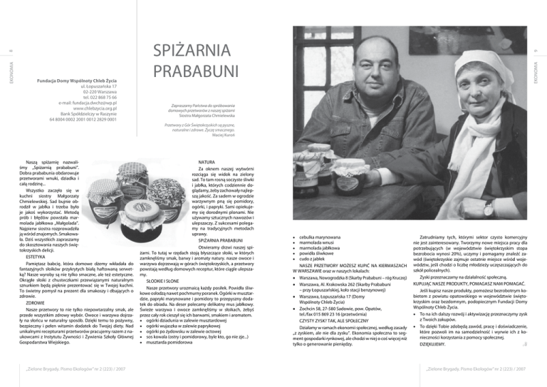 EKONOMIA EKONOMIA Fundacja Domy Wspólnoty Chleb Życia ul. Łopuszańska 17 02-220 Warszawa tel. 022 868 75 66 e-mail: [email protected] www.chlebzycia.org.pl Bank Spółdzielczy w Raszynie 64 8004 0002 2001 0012 2829 0001 SPIŻARNIA PRABABUNI Zapraszamy Państwa do spróbowania domowych przetworów z naszej spiżarni Siostra Małgorzata Chmielewska Przetwory z Gór Świętokrzyskich są pyszne, naturalne i zdrowe. Życzę smacznego. Maciej Kuroń Naszą spiżarnię nazwaliśmy „Spiżarnią prababuni”. Dobra prababunia obdarowuje przetworami wnuki, dziadka i całą rodzinę... Wszystko zaczęło się w kuchni siostry Małgorzaty Chmielewskiej. Sad bujnie obrodził w jabłka i trzeba było je jakoś wykorzystać. Metodą prób i błędów powstała marmolada jabłkowa „Małgolada”. Najpierw siostra rozprowadziła ją wśród znajomych. Smakowała. Dziś wszystkich zapraszamy do skosztowania naszych świętokrzyskich delicji. ESTETYKA Pamiętasz babcię, która domowe dżemy wkładała do fantazyjnych słoików przykrytych białą haftowaną serwetką? Nasze wyroby są nie tylko smaczne, ale też estetyczne. Okrągłe słoiki z chusteczkami przewiązanymi naturalnym sznurkiem będą pięknie prezentować się w Twojej kuchni. To świetny pomysł na prezent dla smakoszy i dbających o zdrowie. ZDROWIE Nasze przetwory to nie tylko niepowtarzalny smak, ale przede wszystkim zdrowy wybór. Owoce i warzywa dojrzały na słońcu w naturalny sposób. Dzięki temu to pożywny, bezpieczny i pełen witamin dodatek do Twojej diety. Nad unikalnymi recepturami przetworów pracujemy razem z naukowcami z Instytutu Żywności i Żywienia Szkoły Głównej Gospodarstwa Wiejskiego. „Zielone Brygady. Pismo Ekologów” nr 2 (223) / 2007 NATURA Za oknem naszej wytwórni rozciąga się widok na zielony sad. To tam rosną soczyste śliwki i jabłka, których codziennie doglądamy, żeby zachowały najlepszą jakość. Za sadem w ogrodzie warzywnym pną się pomidory, ogórki, i papryki. Sami opiekujemy się dorodnymi plonami. Nie używamy sztucznych nawozów i ulepszaczy. Z sukcesami polegamy na tradycyjnych metodach uprawy. SPIŻARNIA PRABABUNI Otwieramy drzwi naszej spiżarni. To tutaj w rzędach stoją błyszczące słoiki, w których zamknęliśmy smak, barwy i aromaty natury. nasze owoce i warzywa dojrzewają w górach świętokrzyskich, a przetwory powstają według domowych receptur, które ciągle ulepszamy. SŁODKIE I SŁONE Nasze przetwory urozmaicą każdy posiłek. Powidła śliwkowe osłodzą nawet pochmurny poranek. Ogórki w musztardzie, papryki marynowane i pomidory to przepyszny dodatek do obiadu. Na deser polecamy delikatny mus jabłkowy. Świeże warzywa i owoce zamknęliśmy w słoikach, żebyś przez cały rok cieszył się ich barwami, smakiem i aromatem. • ogórki dziadunia w zalewie musztardowej • ogórki wujaszka w zalewie paprykowej • ogórki po żydowsku w zalewie octowej • sos kowala (ostry i pomidorowy, byle kto, go nie zje...) • musztarda pomidorowa cebulka marynowana marmolada wnusi marmolada jabłkowa powidła śliwkowe cudo z jabłek NASZE PRZETWORY MOŻESZ KUPIĆ NA KIERMASZACH W WARSZAWIE oraz w naszych lokalach: • Warszawa, Nowogrodzka 8 (Skarby Prababuni – róg Kruczej) • Warszawa, Al. Krakowska 262 (Skarby Prababuni – przy Łopuszańskiej, koło stacji benzynowej) • Warszawa, Łopuszańska 17 (Domy Wspólnoty Chleb Życia) • Zochcin 58, 27-580 Sadowie, pow. Opatów, tel./fax 015 869 23 16 (przetwórnia) CZYSTY ZYSK? TAK, ALE SPOŁECZNY Działamy w ramach ekonomii społecznej, według zasady „z zyskiem, ale nie dla zysku”. Ekonomia społeczna to segment gospodarki rynkowej, ale chodzi w niej o coś więcej niż tylko o generowanie pieniędzy. • • • • • Zatrudniamy tych, którymi sektor czysto komercyjny nie jest zainteresowany. Tworzymy nowe miejsca pracy dla potrzebujących (w województwie świętokrzyskim stopa bezrobocia wynosi 20%), uczymy i pomagamy znaleźć zawód (świętokrzyskie zajmuje ostatnie miejsce wśród województw, jeśli chodzi o liczbę młodzieży uczęszczających do szkół policealnych). Zyski przeznaczamy na działalność społeczną. KUPUJĄC NASZE PRODUKTY, POMAGASZ NAM POMAGAĆ. Jeśli kupisz nasze produkty, pomożesz bezrobotnym kobietom z powiatu opatowskiego w województwie świętokrzyskim oraz bezdomnym, podopiecznym Fundacji Domy Wspólnoty Chleb Życia. • To na ich dalszy rozwój i aktywizację przeznaczymy zysk z Twoich zakupów. • To dzięki Tobie zdobędą zawód, pracę i doświadczenie, które pozwoli im na samodzielność i wyrwie ich z konieczności korzystania z pomocy społecznej. DZIĘKUJEMY. „Zielone Brygady. Pismo Ekologów” nr 2 (223) / 2007