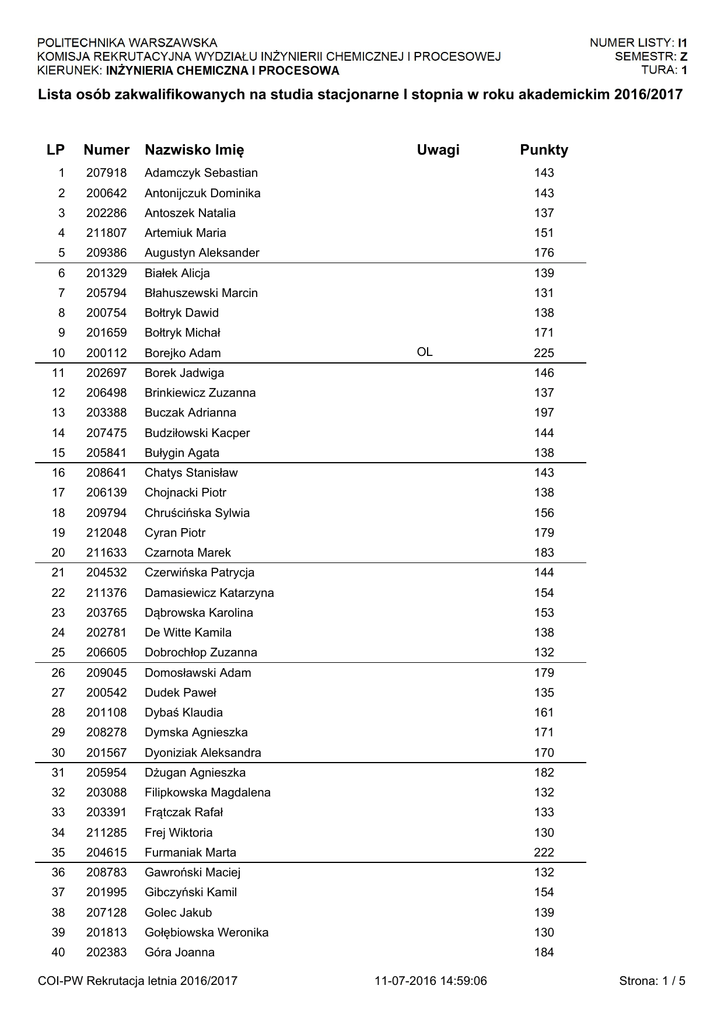 Lista osób zakwalifikowanych na studia stacjonarne I stopnia w roku akademickim 2016/2017 LP Numer Nazwisko Imię 1 207918 Adamczyk Sebastian 143 2 200642 Antonijczuk Dominika 143 3 202286 Antoszek Natalia 137 4 211807 Artemiuk Maria 151 5 209386 Augustyn Aleksander 176 6 201329 Białek Alicja 139 7 205794 Błahuszewski Marcin 131 8 200754 Bołtryk Dawid 138 9 201659 Bołtryk Michał 171 10 200112 Borejko Adam 11 202697 Borek Jadwiga 146 12 206498 Brinkiewicz Zuzanna 137 13 203388 Buczak Adrianna 197 14 207475 Budziłowski Kacper 144 15 205841 Bułygin Agata 138 16 208641 Chatys Stanisław 143 17 206139 Chojnacki Piotr 138 18 209794 Chruścińska Sylwia 156 19 212048 Cyran Piotr 179 20 211633 Czarnota Marek 183 21 204532 Czerwińska Patrycja 144 22 211376 Damasiewicz Katarzyna 154 23 203765 Dąbrowska Karolina 153 24 202781 De Witte Kamila 138 25 206605 Dobrochłop Zuzanna 132 26 209045 Domosławski Adam 179 27 200542 Dudek Paweł 135 28 201108 Dybaś Klaudia 161 29 208278 Dymska Agnieszka 171 30 201567 Dyoniziak Aleksandra 170 31 205954 Dżugan Agnieszka 182 32 203088 Filipkowska Magdalena 132 33 203391 Frątczak Rafał 133 34 211285 Frej Wiktoria 130 35 204615 Furmaniak Marta 222 36 208783 Gawroński Maciej 132 37 201995 Gibczyński Kamil 154 38 207128 Golec Jakub 139 39 201813 Gołębiowska Weronika 130 40 202383 Góra Joanna 184 COI-PW Rekrutacja letnia 2016/2017 Uwagi OL 11-07-2016 14:59:06 Punkty 225 Strona: 1 / 5 Lista osób zakwalifikowanych na studia stacjonarne I stopnia w roku akademickim 2016/2017 LP Numer Nazwisko Imię 41 200317 Górniak Izabela 132 42 206730 Grabowska Gabriela 154 43 204316 Grajkowska Karolina 156 44 204219 Granatowska Anna 134 45 202688 Gregorek Agata 137 46 206910 Gromek Emil 143 47 209349 Grzeczka Dominika 133 48 211084 Grzeczyńska Bernadeta 148 49 207231 Grzelka Karolina 192 50 202757 Gumińska Maja 150 51 207241 Gwozdek Magdalena 146 52 204803 Helik Kinga 139 53 206306 Iwankiewicz Katarzyna 132 54 203458 Jakubowska Małgorzata 180 55 210222 Janik Aleksandra 156 56 200950 Janowska Oliwia 153 57 201076 Jarząbek Maria 153 58 206648 Jastrzębski Maciej 179 59 203789 Jezierska Aneta 134 60 203572 Kamińska Ewelina 170 61 208362 Kańkowska Sylwia 131 62 206257 Kawałko Aleksandra 144 63 206955 Kęsicki Dariusz 154 64 210790 Klimiuk Magdalena 130 65 206674 Kluz Piotr 186 66 211844 Kokot Łukasz 133 67 204564 Kondracki Kamil 160 68 210616 Korkus Krzyztof 159 69 211739 Korycki Przemysław 160 70 208480 Korytkowski Jakub 146 71 202041 Kossakowski Adam 148 72 203768 Kot Jakub 135 73 211448 Kot Magda 130 74 204080 Kowalski Jakub 138 75 207077 Kozik Wiktor 136 76 205878 Kozłowska Olga 133 77 203341 Kozyrski Jakub 157 78 206288 Krakowski Igor 153 79 202345 Krawiecka Aleksandra 154 80 205937 Krzemińska Paulina 141 COI-PW Rekrutacja letnia 2016/2017 Uwagi 11-07-2016 14:59:06 Punkty Strona: 2 / 5 Lista osób zakwalifikowanych na studia stacjonarne I stopnia w roku akademickim 2016/2017 LP Numer Nazwisko Imię 81 203851 Kwiatkowska Anita 170 82 202553 Lasikowska Alicja 138 83 206644 Liszewski Sebastian 138 84 205738 Łasica Maciej 132 85 203450 Machoń Filip 134 86 210581 Machura Natalia 131 87 203435 Magnuska Małgorzata 136 88 205060 Majewska Izabela 131 89 200083 Małek Aleksandra 144 90 202002 Marcinkowska Weronika 158 91 201322 Mazurkiewicz Wojciech 140 92 208428 Michalak Aleksandra 131 93 204896 Michalak Daria 153 94 211776 Michalski Bartłomiej 198 95 204662 Mickiewicz Mateusz 144 96 208551 Milanowski Łukasz 155 97 205124 Misztal Karolina 168 98 205519 Mońka Dominika 162 99 203313 Mospan Martyna 171 100 203355 Mroczek Justyna 145 101 206861 Mucha Agnieszka 133 102 207523 Nowicki Dominik 150 103 200743 Obidzińska Emilia 148 104 204254 Osuch Paweł 176 105 204423 Otręba Justyna 156 106 209998 Pach Magdalena 132 107 202354 Pakuła Rafał 200 108 208815 Pawełkiewicz Grzegorz 136 109 204285 Piros Agata 162 110 211150 Piskorski Piotr 174 111 201923 Piwko Adrianna 175 112 206521 Płochocka Marta 131 113 211932 Proczka Jakub 147 114 205442 Próchnicki Jarosław 193 115 207778 Prusak Przemysław 196 116 204483 Przybył Olga 202 117 200222 Puczydłowska Anna 138 118 210036 Pyzel Katarzyna 153 119 201224 Racki Adrian 132 120 203889 Rawska Natalia 160 COI-PW Rekrutacja letnia 2016/2017 Uwagi 11-07-2016 14:59:06 Punkty Strona: 3 / 5 Lista osób zakwalifikowanych na studia stacjonarne I stopnia w roku akademickim 2016/2017 LP Numer Nazwisko Imię 121 204530 Rendaszek Natalia 131 122 203979 Rębisz Dominik 182 123 209842 Roszewska Weronika 134 124 205975 Rybicki Jan 172 125 202734 Sadowska Sandra 130 126 211942 Sadowski Tomasz 127 201934 Sawicka Klaudia 138 128 200671 Schimmelpfennig Patrycja 170 129 208708 Siatkowska Karolina 189 130 204729 Sidorski Michał 184 131 203706 Siek Małgorzata 130 132 211020 Siemiątkowska Adrianna 144 133 204624 Skotnicka Joanna 139 134 200454 Skowroński Patryk 185 135 203421 Skrzypczak Jakub 180 136 200589 Sobczak Piotr 169 137 209224 Sobczyk Aleksandra 141 138 202700 Sokół Sebastian 141 139 204727 Stadryniak Michał 146 140 201560 Stocka Beata 143 141 210378 Szajnicki Jakub 198 142 200987 Szczepańska Justyna 137 143 209538 Szczytkowska Dorota 142 144 207982 Szymczyk Aleksandra 150 145 201672 Śliwka Mateusz 158 146 207355 Talarek Jakub 134 147 204156 Tamkun Filip 141 148 207718 Tarapata Dagmara 130 149 207804 Terc Piotr 191 150 206662 Tkaczuk Magdalena 143 151 210431 Tomaszewski Olaf 141 152 206074 Tomkiewicz Marcin 140 153 202773 Trębicka Zofia 158 154 202255 Tuchowska Barbara 154 155 210475 Tyszka Jacek 139 156 207237 Wajszczuk Weronika 153 157 201624 Wasylewicz Hubert 140 158 211754 Wawrzyniak Julia 130 159 205889 Wejer Szymon 131 160 206249 Wesołowski Michał 136 COI-PW Rekrutacja letnia 2016/2017 Uwagi KP 11-07-2016 14:59:06 Punkty 137 Strona: 4 / 5 Lista osób zakwalifikowanych na studia stacjonarne I stopnia w roku akademickim 2016/2017 LP Numer Nazwisko Imię 161 210905 Własiuk Karolina 131 162 202674 Wojciechowski Artu