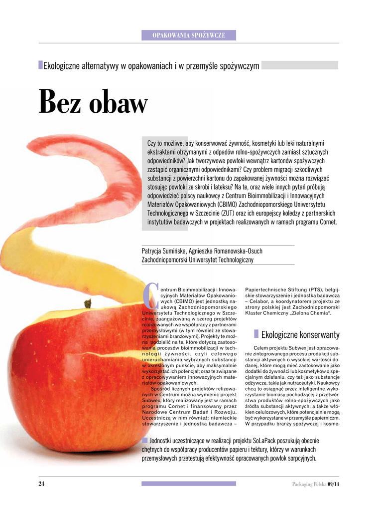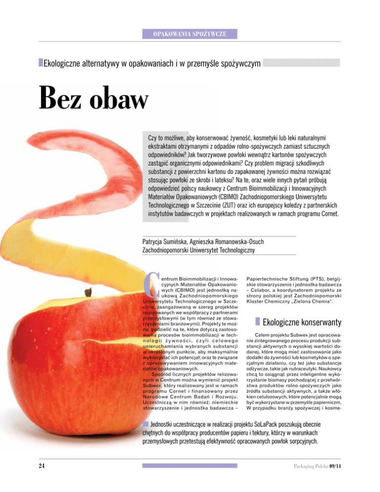OPAKOWANIA SPOŻYWCZE zEkologiczne alternatywy w opakowaniach i w przemyśle spożywczym Bez obaw Czy to możliwe, aby konserwować żywność, kosmetyki lub leki naturalnymi ekstraktami otrzymanymi z odpadów rolno-spożywczych zamiast sztucznych odpowiedników? Jak tworzywowe powłoki wewnątrz kartonów spożywczych zastąpić organicznymi odpowiednikami? Czy problem migracji szkodliwych substancji z powierzchni kartonu do zapakowanej żywności można rozwiązać stosując powłoki ze skrobi i lateksu? Na te, oraz wiele innych pytań próbują odpowiedzieć polscy naukowcy z Centrum Bioimmobilizacji i Innowacyjnych Materiałów Opakowaniowych (CBIMO) Zachodniopomorskiego Uniwersytetu Technologicznego w Szczecinie (ZUT) oraz ich europejscy koledzy z partnerskich instytutów badawczych w projektach realizowanych w ramach programu Cornet. Patrycja Sumińska, Agnieszka Romanowska-Osuch Zachodniopomorski Uniwersytet Technologiczny C entrum Bioimmobilizacji i Innowacyjnych Materiałów Opakowaniowych (CBIMO) jest jednostką naukową Zachodniopomorskiego Uniwersytetu Technologicznego w Szczecinie, zaangażowaną w szereg projektów realizowanych we współpracy z partnerami przemysłowymi (w tym również ze stowarzyszeniami branżowymi). Projekty te można podzielić na te, które dotyczą zastosowania procesów bioimmobilizacji w technologii ż y wności, cz yli celowego unieruchamiania wybranych substancji w określonym punkcie, aby maksymalnie wykorzystać ich potencjał; oraz te związane z opracowywaniem innowacyjnych materiałów opakowaniowych. Spośród licznych projektów relizowanych w Centrum moźna wymienić projekt Subwex, który realizowany jest w ramach programu Cornet i finansowany przez Narodowe Centrum Badań i Rozwoju. Uczestniczą w nim również: niemieckie stowarzyszenie i jednostka badawcza – Papiertechnische Stiftung (PTS), belgijskie stowarzyszenie i jednostka badawcza – Celabor, a koordynatorem projektu ze strony polskiej jest Zachodniopomorski Klaster Chemiczny „Zielona Chemia“. z Ekologiczne konserwanty Celem projektu Subwex jest opracowanie zintegrowanego procesu produkcji substancji aktywnych o wysokiej wartości dodanej, które mogą mieć zastosowanie jako dodatki do żywności lub kosmetyków o specjalnym działaniu, czy też jako substancje odżywcze, takie jak nutraceutyki. Naukowcy chcą to osiągnąć przez inteligentne wykorzystanie biomasy pochodzącej z przetwórstwa produktów rolno-spożywczych jako źródła substancji aktywnych, a także włókien celulozowych, które potencjalnie mogą być wykorzystane w przemyśle papierniczm. W przypadku branży spożywczej i kosme- ■ Jednostki uczestniczące w realizacji projektu SoLaPack poszukują obecnie chętnych do współpracy producentów papieru i tektury, którzy w warunkach przemysłowych przetestują efektywność opracowanych powłok sorpcyjnych. 24 Packaging Polska 09/14 BERICAP Technology The plastic closure company committed to your success tycznej aktywne substancje można przetworzyć na naturalne konserwanty, antyoksydanty, substancje odżywcze itp. W procesie ekstrakcji biomasy za pomocą wody w stanie nadkrytycznym firmy papiernicze dostarczają energii, która jest generowana w dużych ilościach podczas produkcji papieru. Dodatkowo w projekcie włóknista pozostałość po procesie ekstrakcji badana jest pod kątem przydatności w procesie papierniczym. z Pierwsze wnioski © Grzegorz Bańcarz W pierwszym etapie projektu przebadano szereg odpadów rolno-spożywczych, które wykazywały największą użyteczność do procesu ekstrakcji. Przy wyborze istotna była przede wszystkim jakość pozostałości włóknistej, a także właściwości antymikrobiologiczne i antyoksydacyjne wyprodukowanych ekstraktów. Aby uzyskać ekstrakty wykorzystano nowatorską metodę ekstrakcji za Strefa dyfuzji ekstraktu otrzymanego ze słomy jęczmiennej na powierzchni agaru (po 24 godz.). pomocą wody w stanie nadkrytycznym (powyżej temperatury wrzenia). Proces ten realizowany był w Belgii w instytucie Celabor, który posiada nowoczesną aparaturę, zaprojektowaną w celu uzyskania jak najwyższej wydajności. Woda w stanie nadkrytycznym ma właściwości zbliżone do typowych rozpuszczalników organicznych, a proces ekstrakcji jest nie tylko bardziej ekologiczny i szybszy, ale jego efektywność i selektywność uzyskiwania aktywnych substancji jest często wyższa niż w konwencjonalnych procesach ekstrakcyjnych. W ramach projektu stwierdzono, że aktywność antymikrobiologiczna i antyoksydacyjna ekstraktów z wybranych pozostałości rolno-spożywczych jest bardzo wysoka i może być porównywalna do używanych na rynku konserwantów. Ich stosowanie może niemal całkowicie hamować rozwój wybranych mikroorganizmów (np. Escherichia coli i Staphyloccous aureus). Jedynym warunkiem jest stosunkowo duża ilość konieczna, aby uzyskać taki efekt (rzędu 5-7,5 proc.). Z kolei pozostałość poekstrakcyjna może być wykorzystana w procesie produkcji papieru i stosowana jako włókna częściowo zastępujące włókna celulozowe. Bowiem dodatek, nawet w ilości do 40 proc. nie powoduje zmian właściwości mechanicznych papieru czy tektury. Podczas badań stwierdzono, że takie włókna mogą być swobodnie stosowane w produkcji tektur i kartonów, a także papierów technicznych przeznaczonych do pakowania żywności. Niestety wykluczono zastosowanie takich włókien w papierze graficznym, ze względu na to, że ich obecność nadaje mu ciemny kolor. 09/14 Packaging Polska www.bericap.com Research and Development | Mould Technology Global Presence | Capping Technology and Know-How Innovation and Flexibility 25 OPAKOWANIA SPOŻYWCZE z Bio-powłoka na papierze Równolegle do doświadczeń prowadzonych w ramach projektu Subwex toczą się również inne prace badawcze związane z projektami realizowanymi w CBIMO. W lipcu tego roku rozpoczął się nowy projekt o akronimie ProgRESS, realizowany we