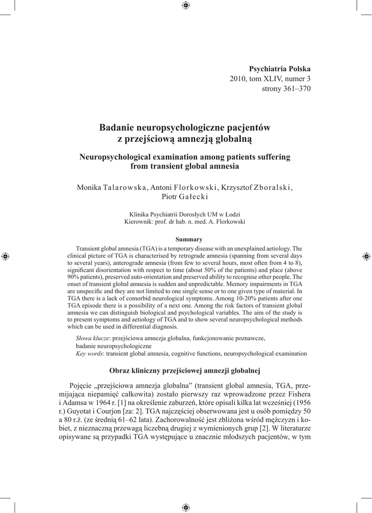 Psychiatria Polska 2010, tom XLIV, numer 3 strony 361–370 Badanie neuropsychologiczne pacjentów z przejściową amnezją globalną Neuropsychological examination among patients suffering from transient global amnesia Monika Talarowska, Antoni Fl o r k o w s k i , Krzysztof Z b o r a l s k i , Piotr G a ł e c k i Klinika Psychiatrii Dorosłych UM w Łodzi Kierownik: prof. dr hab. n. med. A. Florkowski Summary Transient global amnesia (TGA) is a temporary disease with an unexplained aetiology. The clinical picture of TGA is characterised by retrograde amnesia (spanning from several days to several years), anterograde amnesia (from few to several hours, most often from 4 to 8), significant disorientation with respect to time (about 50% of the patients) and place (above 90% patients), preserved auto-orientation and preserved ability to recognise other people. The onset of transient global amnesia is sudden and unpredictable. Memory impairments in TGA are unspecific and they are not limited to one single sense or to one given type of material. In TGA there is a lack of comorbid neurological symptoms. Among 10-20% patients after one TGA episode there is a possibility of a next one. Among the risk factors of transient global amnesia we can distinguish biological and psychological variables. The aim of the study is to present symptoms and aetiology of TGA and to show several neuropsychological methods which can be used in differential diagnosis. Słowa klucze: przejściowa amnezja globalna, funkcjonowanie poznawcze, badanie neuropsychologiczne Key words: transient global amnesia, cognitive functions, neuropsychological examination Obraz kliniczny przejściowej amnezji globalnej Pojęcie „przejściowa amnezja globalna” (transient global amnesia, TGA, przemijająca niepamięć całkowita) zostało pierwszy raz wprowadzone przez Fishera i Adamsa w 1964 r. [1] na określenie zaburzeń, które opisali kilka lat wcześniej (1956 r.) Guyotat i Courjon [za: 2]. TGA najczęściej obserwowana jest u osób pomiędzy 50 a 80 r.ż. (ze średnią 61–62 lata). Zachorowalność jest zbliżona wśród mężczyzn i kobiet, z nieznaczną przewagą liczebną drugiej z wymienionych grup [2]. W literaturze opisywane są przypadki TGA występujące u znacznie młodszych pacjentów, w tym 362 Monika Talarowska i wsp. nawet u dzieci (w tej grupie należy liczyć się z poważnym ryzykiem padaczki) [3, 4]. TGA ma charakter przemijający, zazwyczaj rozpoczyna się w godzinach porannych lub dopołudniowych [2]. Luka pamięciowa ma charakter amnezji wstecznej (dotyczy czasu od kilku dni do kilku lat, w miarę wycofywania się dezorientacji i amnezji następczej skraca się okres niepamięci wstecznej, obejmując tylko czas trwania samego napadu) i następczej (obejmuje przedział czasu od kilku do kilkunastu godzin, najczęściej od 4 do 8, pacjent nie jest w stanie zapamiętać żadnych nowych informacji). Opisanym objawom towarzyszy również znaczna dezorientacja co do czasu (ponad 90% pacjentów) i miejsca (około 50% chorych). Orientacja autopsychiczna i rozpoznawanie innych osób jest zachowane. Pacjent powtarza wielokrotnie te same pytania w celu zorientowania się w sytuacji („Gdzie jestem?”, „Co się ze mną dzieje?”) [5]. Początek TGA jest nagły i niemożliwy do przewidzenia. Zaburzenia pamięci obecne w TGA mają niespecyficzny charakter, nie są ograniczone do jednej modalności zmysłowej czy jednego rodzaju materiału. Nie obserwuje się również współtowarzyszących objawów neurologicznych [6]. Atakom często towarzyszą bóle i zawroty głowy oraz nudności [2]. U 10–20% pacjentów po przebytym TGA wystąpi kolejny epizod niepamięci [7]. Etiologia TGA Pierwsze hipotezy próbujące wytłumaczyć zjawisko TGA doszukiwały się jej przyczyn w zaburzeniu krążenia mózgowego (etiologia naczyniowa). Zgodnie z nimi TGA jest spowodowana niewydolnością krążenia podstawno-kręgowego, w obrębie dolno-przyśrodkowych części płatów skroniowych (jednego lub obu), wzgórza i prążkowia [8]. Zwiększenie się ciśnienia w układzie żył szyjnych może spowodować zmniejszenie przepływu mózgowego oraz niedokrwienie obszarów odpowiedzialnych za pamięć [9]. Schreiber i wsp. [10] stwierdzili częstsze występowanie niewydolności aparatu zastawkowego żyły szyjnej wewnętrznej w grupie po incydencie TGA w porównaniu z grupą kontrolną. Istnieje również teoria zakrzepowo-zatorowa traktująca epizod TGA jako odmianę przemijających ataków niedokrwiennych (transient ischemic attacs, TIA) [11]. Zdaniem Lin i wsp. [12] TGA towarzyszą zawały w obrębie unaczynienia tętnicy mózgu tylnej i tętnicy przeszywającej wzgórza. Zdaniem Fishera [13], u podłoża TGA leżą nie przyczyny naczyniowe, a krótkotrwały napad padaczkowy. Zależność ta nie została jednak potwierdzona [14, 15, 16]. Kolejna grupa teorii poszukuje źródeł TGA w napadach bólów migrenowych – skurcz gałęzi tętnic kręgowo-podstawnych o mechanizmie migrenowym [11] (zaburzenia osobowości oraz bóle migrenowe częściej pojawiają się u kobiet, czym tłumaczy się większe rozpowszechnienie TGA w tej grupie pacjentów [17]). Ponadto, zastosowanie obrazowania dyfuzyjnego rezonansu magnetycznego (DWI, diffusion-weighted imaging) pozwoliło stwierdzić nieprawidłowości w obszarze hipokampa i wzgórza utrzymujące się przez kilka godzin od rozpoczęcia TGA [18, 19]. Zmiany patologiczne są obserwowane przede wszystkim w górnej, bocznej części hipokampa (w okolicach regionu CA1, szczególnie podatnego na niedokrwienie i niedotlenienie) [20, 21]. Opisywane nieprawidłowości mogą być wynikiem zatoru żylnego [22], zmian w metabolizmie kwasu glutaminowego (neuro- Przejściowa amnezja globalna 363 przekaźnika odgrywającego znaczącą rolę w procesach poznawczych oraz funkcjonowaniu emocjonalnym, w tym w lęku) spowodowanych silnym przejściowym stresem psychologicznym lub fizjologicznym [7] czy zwę