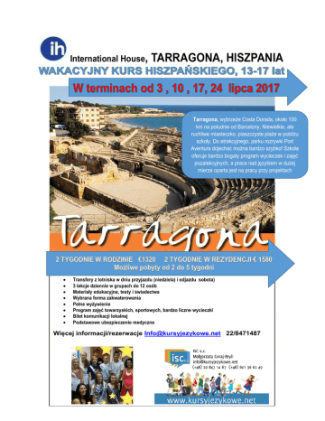 International House, TARRAGONA, HISZPANIA Tarragona, wybrzeże Costa Dorada, około 100 km na południe od Barcelony. Niewielkie, ale ruchliwe miasteczko, piaszczyste plaże w pobliżu szkoły. Do atrakcyjnego, parku rozrywki Port Aventura dojechać można bardzo szybko! Szkoła oferuje bardzo bogaty program wycieczek i zajęć pozalekcyjnych, a praca nad językiem w dużej mierze oparta jest na pracy przy projektach 2 TYGODNIE W RODZINIE €1320 2 TYGODNIE W REZYDENCJI € 1580 . Możliwe pobyty od 2 do 5 tygodni Transfery z lotniska w dniu przyjazdu (niedziela) i odjazdu sobota) 3 lekcje dziennie w grupach do 12 osób Materiały edukacyjne, testy i świadectwa Wybrana forma zakwaterowania Pełne wyżywienie Program zajęć towarzyskich, sportowych, bardzo liczne wycieczki Bilet komunikacji lokalnej Podstawowe ubezpieczenie medyczne Więcej informacji/rezerwacje [email protected] 22/8471487