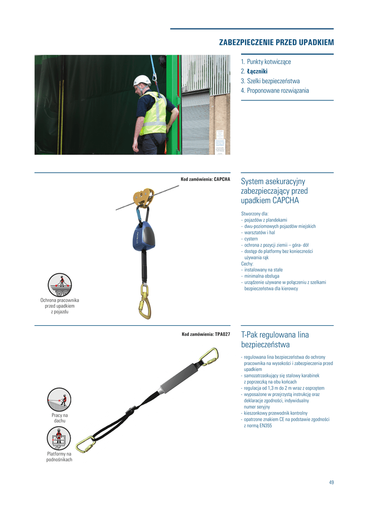 ZABEZPIECZENIE PRZED UPADKIEM 1.Punkty kotwiczące 2.Łączniki 3.Szelki bezpieczeństwa 4.Proponowane rozwiązania Kod zamówienia: CAPCHA System asekuracyjny zabezpieczający przed upadkiem CAPCHA Stworzony dla: - pojazdów z plandekami - dwu-poziomowych pojazdów miejskich - warsztatów i hal - cystern - ochrona z pozycji ziemii – góra- dół - dostęp do platformy bez konieczności używania rąk Cechy: - instalowany na stałe - minimalna obsługa - urządzenie używane w połączeniu z szelkami bezpieczeństwa dla kierowcy Ochrona pracownika przed upadkiem z pojazdu Kod zamówienia: TPA027 Pracy na dachu T-Pak regulowana lina bezpieczeństwa - regulowana lina bezpieczeństwa do ochrony pracownika na wysokości i zabezpieczenia przed upadkiem - samozatrzaskujący się stalowy karabinek z poprzeczką na obu końcach - regulacja od 1,3 m do 2 m wraz z osprzętem - wyposażone w przejrzystą instrukcję oraz deklaracje zgodności, indywidualny numer seryjny - kieszonkowy przewodnik kontrolny - opatrzone znakiem CE na podstawie zgodności z normą EN355 Platformy na podnośnikach 49