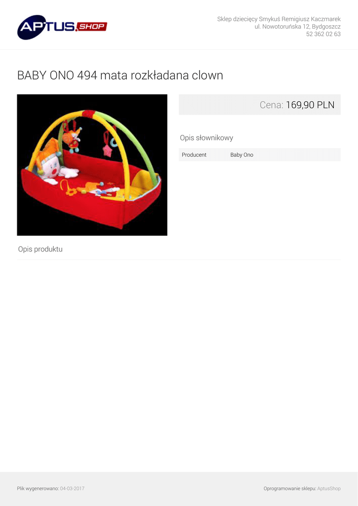Sklep dziecięcy Smykuś Remigiusz Kaczmarek ul. Nowotoruńska 12, Bydgoszcz 52 362 02 63 BABY ONO 494 mata rozkładana clown Cena: 169,90 PLN Opis słownikowy Producent Baby Ono Opis produktu Plik wygenerowano: 04-03-2017 Powered by TCPDF (www.tcpdf.org) Oprogramowanie sklepu: AptusShop