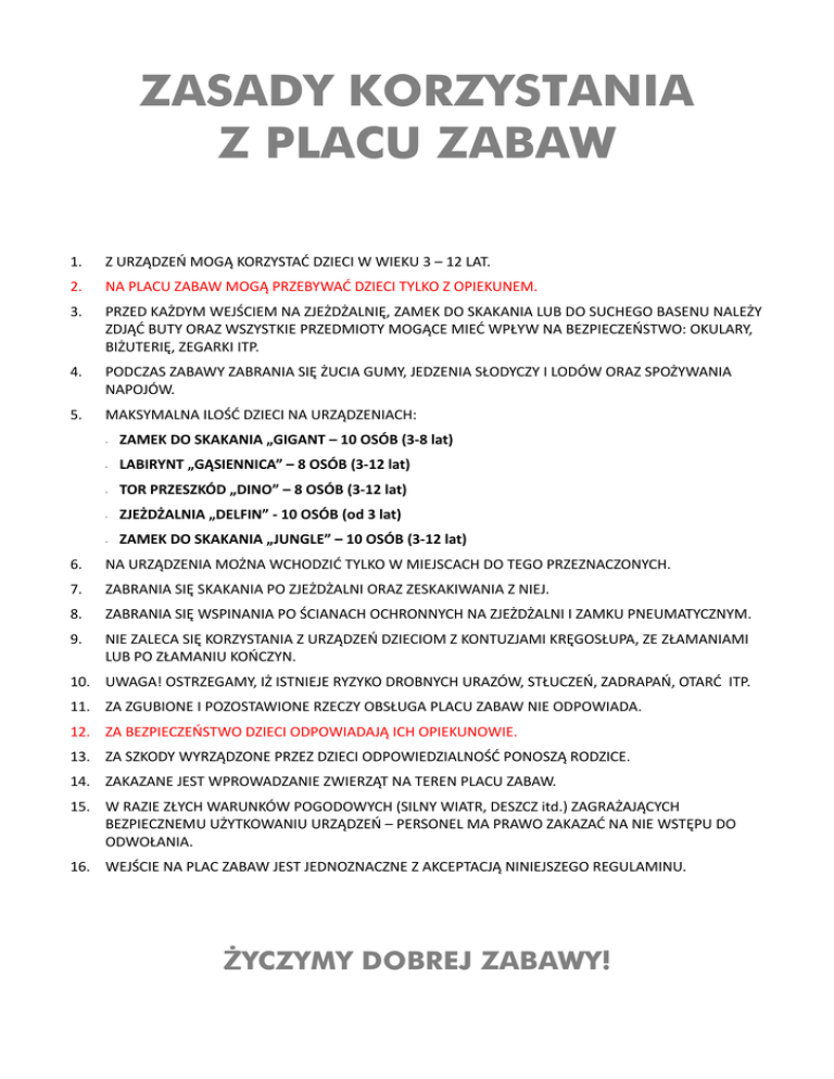 ZASADY KORZYSTANIA Z PLACU ZABAW 1. Z URZĄDZEŃ MOGĄ KORZYSTAĆ DZIECI W WIEKU 3 – 12 LAT. 2. NA PLACU ZABAW MOGĄ PRZEBYWAĆ DZIECI TYLKO Z OPIEKUNEM. 3. PRZED KAŻDYM WEJŚCIEM NA ZJEŻDŻALNIĘ, ZAMEK DO SKAKANIA LUB DO SUCHEGO BASENU NALEŻY ZDJĄĆ BUTY ORAZ WSZYSTKIE PRZEDMIOTY MOGĄCE MIEĆ WPŁYW NA BEZPIECZEŃSTWO: OKULARY, BIŻUTERIĘ, ZEGARKI ITP. 4. PODCZAS ZABAWY ZABRANIA SIĘ ŻUCIA GUMY, JEDZENIA SŁODYCZY I LODÓW ORAZ SPOŻYWANIA NAPOJÓW. 5. MAKSYMALNA ILOŚĆ DZIECI NA URZĄDZENIACH: - ZAMEK DO SKAKANIA „GIGANT – 10 OSÓB (3-8 lat) - LABIRYNT „GĄSIENNICA” – 8 OSÓB (3-12 lat) - TOR PRZESZKÓD „DINO” – 8 OSÓB (3-12 lat) - ZJEŻDŻALNIA „DELFIN” - 10 OSÓB (od 3 lat) - ZAMEK DO SKAKANIA „JUNGLE” – 10 OSÓB (3-12 lat) 6. NA URZĄDZENIA MOŻNA WCHODZIĆ TYLKO W MIEJSCACH DO TEGO PRZEZNACZONYCH. 7. ZABRANIA SIĘ SKAKANIA PO ZJEŻDŻALNI ORAZ ZESKAKIWANIA Z NIEJ. 8. ZABRANIA SIĘ WSPINANIA PO ŚCIANACH OCHRONNYCH NA ZJEŻDŻALNI I ZAMKU PNEUMATYCZNYM. 9. NIE ZALECA SIĘ KORZYSTANIA Z URZĄDZEŃ DZIECIOM Z KONTUZJAMI KRĘGOSŁUPA, ZE ZŁAMANIAMI LUB PO ZŁAMANIU KOŃCZYN. 10. UWAGA! OSTRZEGAMY, IŻ ISTNIEJE RYZYKO DROBNYCH URAZÓW, STŁUCZEŃ, ZADRAPAŃ, OTARĆ ITP. 11. ZA ZGUBIONE I POZOSTAWIONE RZECZY OBSŁUGA PLACU ZABAW NIE ODPOWIADA. 12. ZA BEZPIECZEŃSTWO DZIECI ODPOWIADAJĄ ICH OPIEKUNOWIE. 13. ZA SZKODY WYRZĄDZONE PRZEZ DZIECI ODPOWIEDZIALNOŚĆ PONOSZĄ RODZICE. 14. ZAKAZANE JEST WPROWADZANIE ZWIERZĄT NA TEREN PLACU ZABAW. 15. W RAZIE ZŁYCH WARUNKÓW POGODOWYCH (SILNY WIATR, DESZCZ itd.) ZAGRAŻAJĄCYCH BEZPIECZNEMU UŻYTKOWANIU URZĄDZEŃ – PERSONEL MA PRAWO ZAKAZAĆ NA NIE WSTĘPU DO ODWOŁANIA. 16. WEJŚCIE NA PLAC ZABAW JEST JEDNOZNACZNE Z AKCEPTACJĄ NINIEJSZEGO REGULAMINU. YCZYMY DOBREJ ZABAWY!