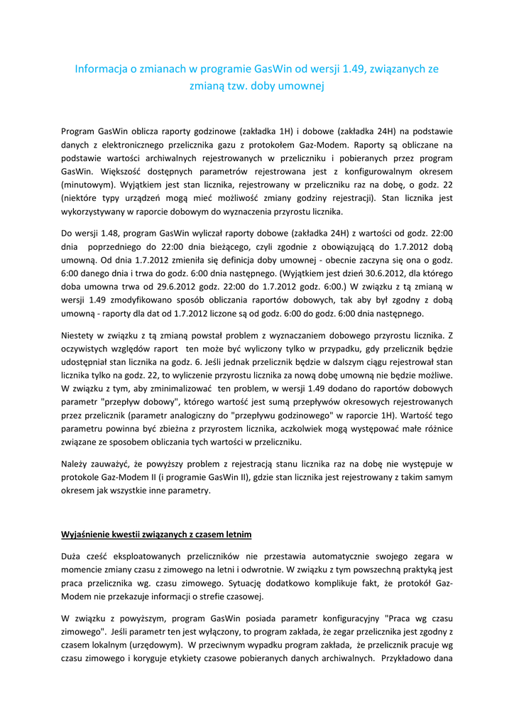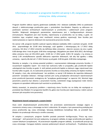 Informacja o zmianach w programie GasWin od wersji 1.49, związanych ze zmianą tzw. doby umownej Program GasWin oblicza raporty godzinowe (zakładka 1H) i dobowe (zakładka 24H) na podstawie danych z elektronicznego przelicznika gazu z protokołem Gaz-Modem. Raporty są obliczane na podstawie wartości archiwalnych rejestrowanych w przeliczniku i pobieranych przez program GasWin. Większość dostępnych parametrów rejestrowana jest z konfigurowalnym okresem (minutowym). Wyjątkiem jest stan licznika, rejestrowany w przeliczniku raz na dobę, o godz. 22 (niektóre typy urządzeń mogą mieć możliwość zmiany godziny rejestracji). Stan licznika jest wykorzystywany w raporcie dobowym do wyznaczenia przyrostu licznika. Do wersji 1.48, program GasWin wyliczał raporty dobowe (zakładka 24H) z wartości od godz. 22:00 dnia poprzedniego do 22:00 dnia bieżącego, czyli zgodnie z obowiązującą do 1.7.2012 dobą umowną. Od dnia 1.7.2012 zmieniła się definicja doby umownej - obecnie zaczyna się ona o godz. 6:00 danego dnia i trwa do godz. 6:00 dnia następnego. (Wyjątkiem jest dzień 30.6.2012, dla którego doba umowna trwa od 29.6.2012 godz. 22:00 do 1.7.2012 godz. 6:00.) W związku z tą zmianą w wersji 1.49 zmodyfikowano sposób obliczania raportów dobowych, tak aby był zgodny z dobą umowną - raporty dla dat od 1.7.2012 liczone są od godz. 6:00 do godz. 6:00 dnia następnego. Niestety w związku z tą zmianą powstał problem z wyznaczaniem dobowego przyrostu licznika. Z oczywistych względów raport ten może być wyliczony tylko w przypadku, gdy przelicznik będzie udostępniał stan licznika na godz. 6. Jeśli jednak przelicznik będzie w dalszym ciągu rejestrował stan licznika tylko na godz. 22, to wyliczenie przyrostu licznika za nową dobę umowną nie będzie możliwe. W związku z tym, aby zminimalizować ten problem, w wersji 1.49 dodano do raportów dobowych parametr "przepływ dobowy", którego wartość jest sumą przepływów okresowych rejestrowanych przez przelicznik (parametr analogiczny do "przepływu godzinowego" w raporcie 1H). Wartość tego parametru powinna być zbieżna z przyrostem licznika, aczkolwiek mogą występować małe różnice związane ze sposobem obliczania tych wartości w przeliczniku. Należy zauważyć, że powyższy problem z rejestracją stanu licznika raz na dobę nie występuje w protokole Gaz-Modem II (i programie GasWin II), gdzie stan licznika jest rejestrowany z takim samym okresem jak wszystkie inne parametry. Wyjaśnienie kwestii związanych z czasem letnim Duża cześć eksploatowanych przeliczników nie przestawia automatycznie swojego zegara w momencie zmiany czasu z zimowego na letni i odwrotnie. W związku z tym powszechną praktyką jest praca przelicznika wg. czasu zimowego. Sytuację dodatkowo komplikuje fakt, że protokół GazModem nie przekazuje informacji o strefie czasowej. W związku z powyższym, program GasWin posiada parametr konfiguracyjny "Praca wg czasu zimowego". Jeśli parametr ten jest wyłączony, to program zakłada, że zegar przelicznika jest zgodny z czasem lokalnym (urzędowym). W przeciwnym wypadku program zakłada, że przelicznik pracuje wg czasu zimowego i koryguje etykiety czasowe pobieranych danych archiwalnych. Przykładowo dana zapisana latem w przeliczniku o godz. 10:00 (wg zegara przelicznika) będzie widoczna w programie z etykietą czasową 11:00. Raport dobowy będzie wyznaczony dla danych od godz. 22:00 do 22:00 lub 6:00 do 6:00 czasu lokalnego (urzędowego), czyli od 21:00 do 21:00 lub 5:00 do 5:00 wg zegara przelicznika. Uwaga - korekta czasu nie jest wykonywana dla stanów licznika - stan zapisany o 22:00 wg zegara przelicznika, będzie widoczny w programie GasWin z etykietą 22:00. (Korekta godziny rejestracji stanu licznika nie ma sensu, ponieważ jest on potrzebny na koniec doby umownej) Zaletą pracy wg. czasu zimowego jest ciągłość danych w dniach zmiany czasu z zimowego na letni i z letniego na zimowy. Natomiast wadą jest rozbieżność, w okresie letnim, dobowego zużycia gazu wyliczonego jako różnica stanów licznika i sumy przepływów. Rozbieżność ta wynika z faktu, że różnica stanów licznika jest wyliczana dla doby umownej wg. zegara przelicznika, a suma przepływów wg czasu lokalnego (urzędowego). Oczywiście przepływ dobowy wyliczony wg różnicy stanów licznika nie jest, w okresie letnim, formalnie poprawny (jest wyliczany od godz. 23 do 23 czasu urzędowego) i w związku z tym nie powinien być brany pod uwagę. W przypadku gdy parametr konfiguracyjny "Praca wg czasu zimowego" jest wyłączony, unikamy problemu rozbieżności wartości przepływów dobowych, natomiast pojawia się problem nieciągłości danych w dniach zmiany czasu. Ponadto, jeśli przelicznik nie koryguje automatycznie czasu, wyznaczane raporty są latem przesunięte godzinę. Przykładowo - średni przepływ godzinowy pokazywany przez program na godzinę 10 miał w rzeczywistości miejsce o godz. 11. czasu lokalnego (urzędowego). Podobny problem występuje z danymi dobowymi - raporty dobowe są wyliczane z danych rejestrowanych od 23:00 do 23:00 lub 7:00 7:00 czasu lokalnego (urzędowego).