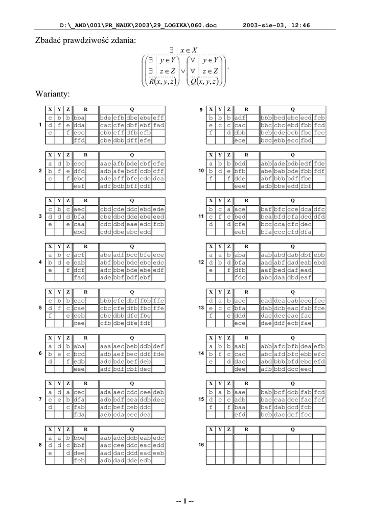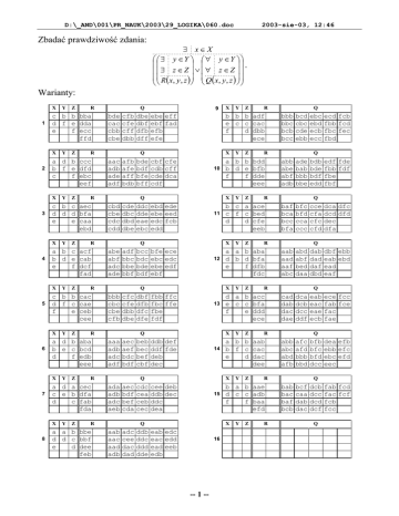 D:\_AND\001\PR_NAUK\2003\29_LOGIKA\060.doc Zbadać prawdziwość zdania: 2003-sie-03, 12:46 ∃ x∈ X ∃ y ∈Y ∀ y ∈Y . ∃ z ∈ Z ∨ ∀ z ∈ Z R ( x, y , z ) Q ( x, y , z ) Warianty: X 1 Y Z Y Z Y Z Y Z Y Z bde cac cbb cbe cfb cfe cff dbb dbe dbf dfb dff aac adb ade adf afb afe aff bdb bde bdf bfe bff cbd cbe cdc cdd cde dbc dbd dbe ddc dde eae ebc adf bbc bbe bbf bcc bdc bde bdf bbb cbc cbe cfb cfc cfe dbb dbe dbf dfb dfc dfe R aec aef bdc bdf beb bec bef cbf ada adb adc aeb aec bdf bef cda cdc cea ceb cec R X 10 X ebd ede ebe eed edc fcb edd 11 bfe ece ebc edc ebe edf ebf 12 13 14 15 Q aab aac aad adb adc cee dac dad ddb ddc ddd dde 16 -- 1 -- Z Y Z Y Z Y Z Y Z bcd cbc cde ebb ebc ebd ecb ecc abb abe abf adb ade bab bbb bbe bdb bde bdf edd edf fde fbb fdf fbe fbf Q baf bca bcc bfa bfc bfd cca ccc cce cfa cfc cfd dca dfc dcd dfd dec dfa Q aab aad aaf abc abd abf bed daa dab dad daf dbd cad dab dac dae dca dcb dcc ddf eab eac eae ecb R dbf ebb eab ebd ead eaf Q R ece fcc fab fce fac fae Q abb abc abd afb afc afd bbb bbd bfb bfc bfd dcc bab bac baf bcb bcf caa dab dac dcb dcc dcd dcf R R ecd fcb fbb fcd fbc fec fbd Q R b a b aae d c c adb f f baa efd X eab edc eac edd ead eeb edb Y bbb bbc bcb bcc R a b b aab b f c cac e d dac dee X cee deb ddb dec ddc dea Z Q R d a b acc e c c bfa f e ddd ece X ddb def ddf fde deb dec Y Z a a b aba d b d bfa e f dfb fdc X fbb ffc fbc ffe fbe fdf Y b c a ace c f c bed d d cfe eeb X Q R R a b b bdd b d e bfb f f dde eee Q aaa adb adc adf Z cbf cfe cdb cff cde dca cdf Q R Y b b b adf e c c cac f d dbb ece Q abe abf adc ade X ebe eff ebf fad efb efe Q R a a b bbe d d c bbf e d dee feb 9 Q R a d a cec c e b dfa d c fab fda X 8 Z a d b aba b e c bcd d f edb eee X 7 Y Q R c b b cac d f c cae f e ceb cee X 6 Z a b c acf b d e cab e f dcf fad X 5 Y c b c aec d d d bfa e e caa ebd X 4 R a d b ccc b f e dfd c f ebc eef X 3 Z c b b bba d f e dda e f ecc ffd X 2 Y dea efb ebb efc ebc efd eec Q Q fab fcd fac fcf fcb fcc