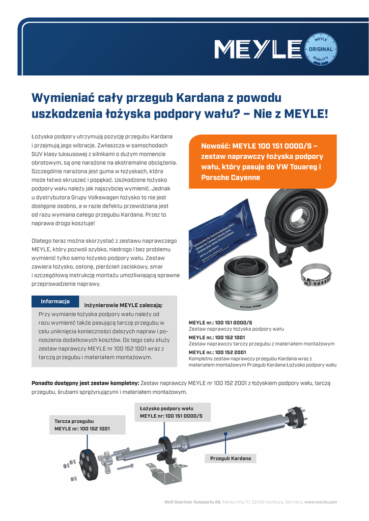 Wymieniać cały przegub Kardana z powodu uszkodzenia łożyska podpory wału? – Nie z MEYLE! Łożyska podpory utrzymują pozycję przegubu Kardana i przejmują jego wibracje. Zwłaszcza w samochodach SUV klasy luksusowej z silnikami o dużym momencie obrotowym, są one narażone na ekstremalne obciążenia. Szczególnie narażona jest guma w łożyskach, która może łatwo skruszeć i popękać. Uszkodzone łożysko Nowość: MEYLE 100 151 0000/S – zestaw naprawczy łożyska podpory wału, który pasuje do VW Touareg i Porsche Cayenne podpory wału należy jak najszybciej wymienić. Jednak u dystrybutora Grupy Volkswagen łożysko to nie jest dostępne osobno, a w razie defektu przewidziana jest od razu wymiana całego przegubu Kardana. Przez to naprawa drogo kosztuje! Dlatego teraz można skorzystać z zestawu naprawczego MEYLE, który pozwoli szybko, niedrogo i bez problemu wymienić tylko samo łożysko podpory wału. Zestaw zawiera łożysko, osłonę, pierścień zaciskowy, smar i szczegółową instrukcję montażu umożliwiającą sprawne przeprowadzenie naprawy. a Informacja Inżynierowie MEYLE zalecają: Przy wymianie łożyska podpory wału należy od razu wymienić także pasującą tarczę przegubu w celu uniknięcia konieczności dalszych napraw i ponoszenia dodatkowych kosztów. Do tego celu służy zestaw naprawczy MEYLE nr 100 152 1001 wraz z MEYLE nr.: 100 151 0000/S Zestaw naprawczy łożyska podpory wału MEYLE nr.: 100 152 1001 Zestaw naprawczy tarczy przegubu z materiałem montażowym MEYLE nr.: 100 152 2001 Kompletny zestaw naprawczy przegubu Kardana wraz z materiałem montażowym Przegub Kardana Łożysko podpory wału tarczą przegubu i materiałem montażowym. Ponadto dostępny jest zestaw kompletny: Zestaw naprawczy MEYLE nr 100 152 2001 z łożyskiem podpory wału, tarczą przegubu, śrubami sprężynującymi i materiałem montażowym. Tarcza przegubu MEYLE nr: 100 152 1001 Łożysko podpory wału MEYLE nr: 100 151 0000/S Przegub Kardana Wulf Gaertner Autoparts AG, Merkurring 111, 22143 Hamburg, Germany, www.meyle.com