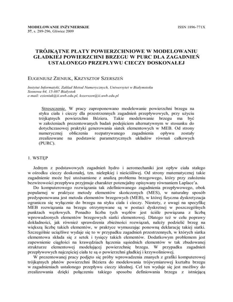 MODELOWANIE INŻYNIERSKIE 37, s. 289-296, Gliwice 2009 ISSN 1896-771X TRÓJKĄTNE PŁATY POWIERZCHNIOWE W MODELOWANIU GŁADKIEJ POWIERZCHNI BRZEGU W PURC DLA ZAGADNIEŃ USTALONEGO PRZEPŁYWU CIECZY DOSKONAŁEJ EUGENIUSZ ZIENIUK, KRZYSZTOF SZERSZEŃ Instytut Informatyki, Zakład Metod Numerycznych, Uniwersytet w Białymstoku Sosnowa 64, 15-887 Białystok e-mail: [email protected], [email protected] Streszczenie. W pracy zaproponowano modelowanie powierzchni brzegu na styku ciała i cieczy dla przestrzennych zagadnień przepływowych, przy użyciu trójkątnych powierzchni Béziera. Takie modelowanie brzegu ma być w założeniach prezentowanych badań podejściem alternatywnym w stosunku do dotychczasowej praktyki generowania siatek elementowych w MEB. Od strony numerycznej obliczenia rozpatrywanego zagadnienia opływu zostały zrealizowane na podstawie parametrycznych układów równań całkowych (PURC). 1. WSTĘP Jednym z podstawowych zagadnień hydro i aeromechaniki jest opływ ciała stałego w ośrodku cieczy doskonałej, tzn. nielepkiej i nieściśliwej. Od strony matematycznej takie zagadnienie może być utożsamione z analizą problemu brzegowego, który przy założeniu bezwirowości przepływu przyjmuje charakter potencjalny opisywany równaniem Laplace’a. Do komputerowego rozwiązania tak zdefiniowanego zagadnienia przepływowego, obok popularnej w praktyce metody elementów skończonych (MES), w naturalny sposób predysponowana jest metoda elementów brzegowych (MEB), w której fizyczna dyskretyzacja ogranicza się wyłącznie do brzegu na styku ciała i cieczy. Niestety, z uwagi na specyfikę MEB rozwiązania na brzegu otrzymywane są w postaci dyskretnej w poszczególnych punktach węzłowych. Ponadto liczba tych węzłów jest ściśle powiązana z liczbą wprowadzonych elementów brzegowych siatki elementowej. Dlatego też w celu poprawy dokładności, jak również sprawdzenia zbieżności rozwiązań, należy podzielić brzeg na większą liczbę takich elementów, w praktyce wymuszając ponowną deklarację takiej siatki. Szczególnie uciążliwe wydaje się to w przypadku zagadnień przestrzennych, w których siatka elementowa składa się z setek i tysięcy takich elementów. Dodatkowym problemem jest zapewnienie ciągłości na krawędziach łączenia sąsiednich elementów w tak zbudowanej strukturze elementowej modelującej powierzchnię brzegu. W przypadku zagadnień przepływowych najczęściej ciała te są o powierzchni gładkiej i krzywoliniowej. W prezentowanej pracy podjęto się próby wprowadzenia znanych z grafiki komputerowej trójkątnych płatów powierzchni Béziera do modelowania trójwymiarowej kształtu brzegu w zagadnieniach ustalonego przepływu cieczy idealnej. Cel ten wydaje się jest możliwy do zrealizowania dzięki połączeniu takiego sposobu definiowania brzegu z istniejącą 290 E. ZIENIUK, K. SZERSZEŃ i szczegółowo przetestowaną wcześniejszą koncepcją parametrycznych układów równań całkowych (PURC), głównie dla zagadnień dwuwymiarowych. 2. TRÓJKATNE PŁATY BÉZIERA Trójkątny płat Béziera stopnia n jest definiowany przez zbiór 0.5(n + 1)(n + 2) punktów kontrolnych Pi , j , k . Matematyczna formuła takiego płata jest uzależniona jest od trzech parametrów v , w, u [1]: P n (v, w, u ) = åP i , j , k >= 0 , i + j + k =n i, j ,k Bin, j , k (v, w, u ), Bin, j ,k (v, w, u ) = n! i j k vw u i! j! k! (1) gdzie 0 £ v, w, u £ 1, v + w + u £ 1 , zaś Bin, j , k (v, w, u ) są funkcjami bazowymi Bernsteina n-tego stopnia. Po podstawienia w formule (1) u = 1 - w - v i przy wprowadzeniu dodatkowych ograniczeń 0 £ v, w £ 1 oraz v + w £ 1 otrzymujemy bardziej dogodną matematyczną formę opisu takich płatów, uzależnioną wyłącznie od dwóch parametrów v , w : P n (v, w) = åP i , j , k >= 0 i + j + k =n i , j,k Bin, j ,k (v, w,1 - v - w), Bin, j ,k (v, w,1 - v - w) = n! i j k v w (1 - v - w ) . (2) i! j! k! Podstawową zaletą płatów Béziera jest prostota definiowania (rys. 1a) i modyfikacji (rys. 1bc) skomplikowanych kształtów powierzchni za pomocą jedynie niewielkiej liczby punktów kontrolnych. Na rys. 1a przedstawiono wizualizację takiego płata deklarowanego 15 punktami kontrolnymi. a) b) c) Rys. 1. Trójkątny płat Béziera stopnia 4: a) definiowanie 15 punktami kontrolnymi, b) i c) modyfikacje płata po przesunięciu wybranych punktów kontrolnych Możliwa jest w ten sposób deklaracja zarówno płaskich powierzchni trójkątnych (rys. 1a), jak również powierzchni krzywoliniowych. Modyfikację kształtu płata po przesunięciu wybranych punktów kontrolnych zaprezentowano na rys. 1b,c. 3. PURC Z BRZEGIEM MODELOWANYM TRÓJKĄTNYMI PŁATAMI BÉZIERA Przedstawiony sposób modelowania brzegu polegający na wykorzystaniu trójkątnych płatów powierzchni może być wkomponowany w parametrycznych układach równań TRÓJKĄTNE PŁATY POWIERZCHNIOWE W MODELOWANIU GŁADKIEJ … 291 całkowych (PURC), dających możliwość efektywnego numerycznego rozwiązywania zagadnień brzegowych. Formuła PURC w przypadku płatów trójkątnych jest analogiczna jak w przypadku wcześniej testowanych płatów prostokątnych Béziera [7] i przedstawiana następująco: n 0.5u l (v1 ,w1 ) = å vj wj ò ò {U * lj } (v1 ,w1 ,v,w)p j (v,w) - Plj (v1 ,w1 ,v,w)u j (v,w) J j (v,w)dvdw, (3) * j =1 v j -1 w j -1 oraz ν j -1 < ν1 ,ν < ν j , w j -1 < w1 ,w < w j , l = 1,2,3...n . Integracja wprowadzonego modelowania powierzchni brzegu z formułą PURC realizowana jest głównie w funkcjach podcałkowych (jądrach) równania (3) za pomocą następujących wyrażeń: 1 1 1 h1 n1( j ) + h 2 n2( j ) + h 3 n3( j ) * * U lj (n 1 , w1 ,n , w) = , P , (4) lj (v1 , w1 , v, w) = 4p [h12 + h 22 + h 32 ]0.5 4p [h12 + h 22 + h 32 ]1.5 w których to brzeg jest zdefiniowany za pomocą funkcji h1 ,h 2 ,h 3 : h1 = Pl (1) (v1 , w1 ) - Pj(1) (v, w) , h 2 = Pl( 2 ) (v1 , w1 ) - Pj( 2) (v, w) oraz h3 = Pl (3) (v1 , w1 ) - Pj(3) (v, w) , (5) u