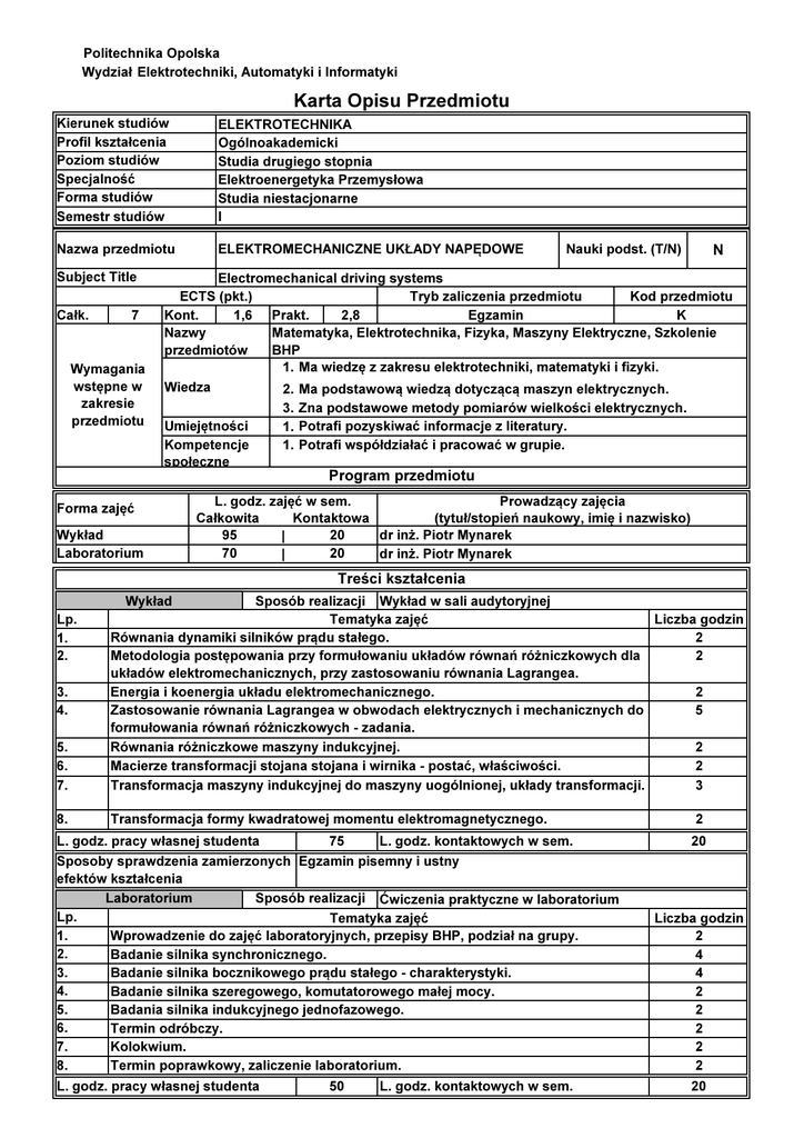 Karta Opisu Przedmiotu - Wydział Elektrotechniki, Automatyki i