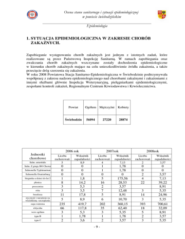 Ocena stanu sanitarnego i sytuacji epidemiologicznej w powiecie świebodzińskim Epidemiologia 1. SYTUACJA EPIDEMIOLOGICZNA W ZAKRESIE CHORÓB ZAKAŹNYCH. Zapobieganie występowaniu chorób zakaźnych jest jednym z istotnych zadań, które realizowane są przez Państwową Inspekcję Sanitarną. W ramach zapobiegania oraz zwalczania chorób zakaźnych wszczynane zostały dochodzenia epidemiologiczne w kierunku chorób zakaźnych mające na celu unieszkodliwienie źródła zakażenia, a także przecięcie dróg szerzenia się zakażenia. W roku 2008 Powiatowa Stacja Sanitarno-Epidemiologiczna w Świebodzinie podtrzymywała współpracę z zakresu nadzoru epidemiologicznego nad chorobami zakaźnymi i zakażeniami z innymi służbami głównie Inspekcja Weterynaryjną, pielęgniarkami epidemiologicznymi, zespołami kontroli zakażeń, Regionalnym Centrum Krwiodawstwa i Krwiolecznictwa. Powiat Ogółem Mężczyźni Kobiety Świebodzin 56094 27220 2006 rok Jednostki chorobowe Salm. enteritidis Salm. Z grupy BO Chester Salmonella Typhimurium Salmonella Oranienburg biegunka u dzieci do lat 2 płonica posocznica róża borelioza styczność i narażenie na wściekliznę -szczepienia ospa wietrzna różyczka wzw ogółem typu B typu C 28874 2007rok 2008rok Liczba zachorowań 5 Wskaźnik zapadalności 8,9 Liczba zachorowań 4 Wskaźnik zapadalności 7,13 Liczba zachorowań 2 Wskaźnik zapadalności 3,57 0 0 0 1 8 3 3 11 5 235 66 3 1 2 0 0 0 1,8 14,2 5,3 3,5 17,8 8,9 419,7 117,8 5,3 1,78 3,6 1 1 0 5 16 2 7 5 6 202 35 3 1 2 1,78 1,78 0 175,56 28,53 3,57 12,48 8,91 10,70 360,15 62,40 5,35 1,78 3,57 0 0 2 4 22 0 0 3,57 7,13 39,22 8,91 5,35 24,96 5,35 700,61 32,09 8,91 3,57 5,35 -9- 3 14 3 393 18 5 2 3 Ocena stanu sanitarnego i sytuacji epidemiologicznej w powiecie świebodzińskim Epidemiologia cytomegalia świnka mononukleoza zakaźna toksoplazmoza glistnica owsica świerzb bakteryjne zapalenie opon inne i nie określone Zapalenie mózgu nie określone Jersinioza zatrucia związkami chemicznymi ogółem zatrucia alkoholem zatrucia pestycydami zatrucia lekami zatrucia innymi substancjami nie stosowanymi w celach leczniczych Zapalenie płuc o etiologii zakaźnej 2 13 0 2 93 21 13 1 3,6 23 0 3,6 166 37,5 23 1,8 3 5 0 1 93 16 18 4 5,35 8,91 0 1,78 165,81 28,53 32,09 7,13 1 6 0 1 140 9 18 3 1,78 10,70 0 1,78 249,58 16,04 32,09 5,35 8 0 0 5 14 0 0 8,9 1 2 0 2 0 1 1,78 3,57 0 3,57 0 1,78 0 0 0 0 0 0 0 0 0 0 0 0 3 5,3 0 0 0 0 36 64,3 106 188,99 58 103,40 I.CHOROBY SZERZĄCE SIĘ DROGĄ POKARMOWĄ 1. Salomonellozy Liczba zachorowań W 2008 roku zarejestrowano i opracowano 4 zachorowania na salmonellę, które nie były powiązane ze sobą. 3 2 1 0 2006 rok 2007 rok I II III I V V V V I X X X 2006 rok 0 0 0 0 0 1 0 0 0 0 0 0 2007 rok 1 0 2 0 1 0 0 0 0 0 0 0 2008 rok 0 0 0 0 0 0 1 3 0 0 0 0 Poszczególne miesiące Z pobranych próbek kału wyhodowano: - 10 - 2008 rok Ocena stanu sanitarnego i sytuacji epidemiologicznej w powiecie świebodzińskim Epidemiologia - u dwóch osób pałeczki salmonella Enteritidis - u dwóch osób osoby pałeczkę salmonella Oranienburg II. ZACHOROWANIA I ZAKAŻENIA SZERZACE SIĘ DROGĄ KRWI NARUSZENIA CIĄGŁOŚCI TKANEK 1. Wirusowe zapalenie wątroby typu B W 2008 roku zarejestrowano i opracowano dwa zachorowania kobiety i mężczyzny. 1. Kobieta lat 39 zamieszkała w mieście, hospitalizowana w Oddziale Zakaźnym Szpitala Wojewódzkiego w Zielonej Górze. 2. Mężczyzna lat 29 zamieszkały w mieście. Od roku 2004 przyjmował narkotyki drogą dożylną. Hospitalizowany w Oddziale Zakaźnym Szpital w Poznaniu. W rejestrze nosicieli antygenu HBs wpisano 6 nosicieli, osoby z otoczenia skierowano pod nadzór epidemiologiczny. 2. Wirusowe zapalenie wątroby typu C W 2008 roku zarejestrowano 3 zachorowania na WZW typu C. W roku 2008 zarejestrowano 18 nosicieli przeciwciał anty HCV (+). Analiza epidemiologiczna poszczególnych przypadków ujawniła, że źródłem zakażenia mogły być: pobieranie narkotyków drogą dożylną - 6 osób zabiegi stomatologiczne - 9 osób badania endoskopowe – 2 osoba. pojedyncze hospitalizacje - 3 osoby wielokrotna hospitalizacje - 11 osób tatuaże wykonane w nieprofesjonalnych warunkach - 6 osób 31 30 29 28 27 26 25 24 23 22 21 20 19 18 17 16 15 14 13 12 11 10 9 8 7 6 5 4 3 2 1 0 Mężczyźni Mężczyźni Kobiety RAZEM 2006 rok 2007 rok 2008 rok 23 20 11 Kobiety 7 11 7 RAZEM 30 31 18 - 11 - Ocena stanu sanitarnego i sytuacji epidemiologicznej w powiecie świebodzińskim Epidemiologia III. ZACHOROWANIA NA CHOROBY ODZWIERZĘCE 1. Borelioza. Liczba zachorowań Opracowano 14 zachorowań na boreliozę z Lome. Jedna osoba – kobieta lat 29 zamieszkała na wsi była hospitalizowana w Oddziale Zakaźnym Szpitala Wojewódzkiego w Zielonej Górze.. Zachorowania 3 osób dotyczyły osób powiązanych z pracą w lesie. 15 14 13 12 11 10 9 8 7 6 5 4 3 2 1 0 Miasto Wieś 2006 rok 2007 rok 2008 rok 3. Styczność i narażenie na wściekliznę - podjęte szczepienia. W ciągu roku 2008 przyjęto zgłoszenia pokąsania przez zwierzęta 22 osób. W 20 przypadkach były to pogryzienia przez psy w 1 przypadku pogryzienie przez koty, a w 1 przypadku pogryzienie przez kuca. W 3 przypadkach podjęto szczepienia przeciwko wściekliźnie. Dwie osoby otrzymały po 5 dawek szczepionki p/wściekliźnie, jedna osoba jest w trakcie szczepień. Formularze szczepień w ilości 2 kopii przesłano do Wojewódzkiej Stacji Sanitarno – Epidemiologicznej w Gorzowie Wlkp. W ciągu 2008 roku zostało pobranych 16 próbek do badań laboratoryjnych od zdechłych zwierząt w tym: - 8 lisów, - 6 saren - 1 kuny - 1 fretki 4. Toksoplazmoza Zarejestrowano i opracowano jedno zachorowanie. Zachorowanie dotyczyło mężczyzny lat 73 zamieszkałego na wsi. Chory był leczony w Oddziale Okulistycznym Szpitala Wojewódzkiego w Zielonej Górze - 12 - Ocena stanu sanitarnego i sytuacji epidemiologicznej w powiecie świebodzińskim Epidemiologia IV ZACHOROWANIA NA NEUROINFEKCJE W roku 2008 zarejestro