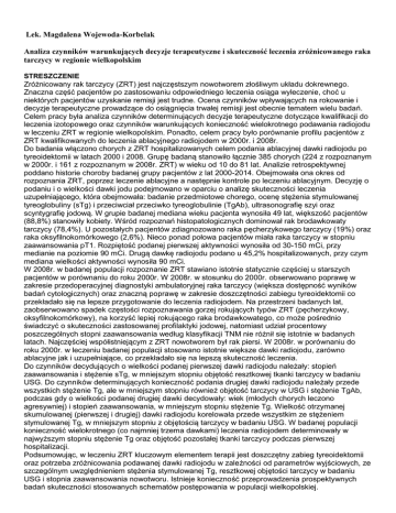 Lek. Magdalena Wojewoda-Korbelak Analiza czynników warunkujących decyzje terapeutyczne i skuteczność leczenia zróżnicowanego raka tarczycy w regionie wielkopolskim STRESZCZENIE Zróżnicowany rak tarczycy (ZRT) jest najczęstszym nowotworem złośliwym układu dokrewnego. Znaczna część pacjentów po zastosowaniu odpowiedniego leczenia osiąga wyleczenie, choć u niektórych pacjentów uzyskanie remisji jest trudne. Ocena czynników wpływających na rokowanie i decyzje terapeutyczne prowadzące do osiągnięcia trwałej remisji jest obecnie tematem wielu badań. Celem pracy była analiza czynników determinujących decyzje terapeutyczne dotyczące kwalifikacji do leczenia izotopowego oraz czynników warunkujących konieczność wielokrotnego podawania radiojodu w leczeniu ZRT w regionie wielkopolskim. Ponadto, celem pracy było porównanie profilu pacjentów z ZRT kwalifikowanych do leczenia ablacyjnego radiojodem w 2000r. i 2008r. Do badania włączono chorych z ZRT hospitalizowanych celem podania ablacyjnej dawki radiojodu po tyreoidektomii w latach 2000 i 2008. Grupę badaną stanowiło łącznie 385 chorych (224 z rozpoznanym w 2000r. i 161 z rozpoznanym w 2008r. ZRT) w wieku od 10 do 81 lat. Analizie retrospektywnej poddano historie choroby badanej grupy pacjentów z lat 2000-2014. Obejmowała ona okres od rozpoznania ZRT, poprzez leczenie ablacyjne a następnie kontrole po leczeniu ablacyjnym. Decyzję o podaniu i o wielkości dawki jodu podejmowano w oparciu o analizę skuteczności leczenia uzupełniającego, która obejmowała: badanie przedmiotowe chorego, ocenę stężenia stymulowanej tyreoglobuliny (sTg) i przeciwciał przeciwko tyreoglobulinie (TgAb), ultrasonografię szyi oraz scyntygrafię jodową. W grupie badanej mediana wieku pacjenta wynosiła 49 lat, większość pacjentów (88,8%) stanowiły kobiety. Wśród rozpoznań histopatologicznych dominował rak brodawkowaty tarczycy (78,4%). U pozostałych pacjentów zdiagnozowano raka pęcherzykowego tarczycy (19%) oraz raka oksyfilnokomórkowego (2,6%). Nieco ponad połowa pacjentów miała raka tarczycy w stopniu zaawansowania pT1. Rozpiętość podanej pierwszej aktywności wynosiła od 30-150 mCi, przy medianie na poziomie 90 mCi. Drugą dawkę radiojodu podano u 45,2% hospitalizowanych, przy czym mediana wielkości aktywności wynosiła 90 mCi. W 2008r. w badanej populacji rozpoznanie ZRT stawiano istotnie statycznie częściej u starszych pacjentów w porównaniu do roku 2000r. W 2008r. w stosunku do 2000r. obserwowano poprawę w zakresie przedoperacyjnej diagnostyki ambulatoryjnej raka tarczycy (większa dostępność wyników badań cytologicznych) oraz znaczną poprawę w zakresie doszczętności zabiegu tyreoidektomii co przekładało się na lepsze przygotowanie do leczenia radiojodem. Na przestrzeni badanych lat, zaobserwowano spadek częstości rozpoznawania gorzej rokujących typów ZRT (pęcherzykowy, oksyfilnokomórkowy), na korzyść lepiej rokującego raka brodawkowatego, co może pośrednio świadczyć o skuteczności zastosowanej profilaktyki jodowej, natomiast udział procentowy poszczególnych stopni zaawansowania według klasyfikacji TNM nie różnił się istotnie w badanych latach. Najczęściej współistniejącym z ZRT nowotworem był rak piersi. W 2008r. w porównaniu do roku 2000r. w leczeniu badanej populacji stosowano istotnie większe dawki radiojodu, zarówno ablacyjne jak i uzupełniające, co przekładało się na lepszą skuteczność leczenia. Do czynników decydujących o wielkości podanej pierwszej dawki radiojodu należały: stopień zaawansowania i stężenie sTg, w mniejszym stopniu objętość resztkowej tkanki tarczycy w badaniu USG. Do czynników determinujących konieczność podania drugiej dawki radiojodu należały przede wszystkich stężenie Tg, ale w mniejszym stopniu również objętość tarczycy w USG i stężenie TgAb, podczas gdy o wielkości podanej drugiej dawki decydowały: wiek (młodych chorych leczono agresywniej) i stopień zaawansowania, w mniejszym stopniu stężenie Tg. Wielkość otrzymanej skumulowanej (pierwszej i drugiej) dawki radiojodu korelowała przede wszystkim ze stężeniem stymulowanej Tg, w mniejszym stopniu z objętością tarczycy w badaniu USG. W badanej populacji konieczność wielokrotnego (co najmniej trzema dawkami) leczenia radiojodem determinowały w najwyższym stopniu stężenie Tg oraz objętość pozostałej tkanki tarczycy podczas pierwszej hospitalizacji. Podsumowując, w leczeniu ZRT kluczowym elementem terapii jest doszczętny zabieg tyreoidektomii oraz potrzeba zróżnicowania podawanej dawki radiojodu w zależności od parametrów wyjściowych, ze szczególnym uwzględnieniem stężenia stymulowanej Tg, resztkowej objętości tarczycy w badaniu USG i stopnia zaawansowania nowotworu. Istnieje konieczność przeprowadzenia prospektywnych badań skuteczności stosowanych schematów postępowania w populacji wielkopolskiej.