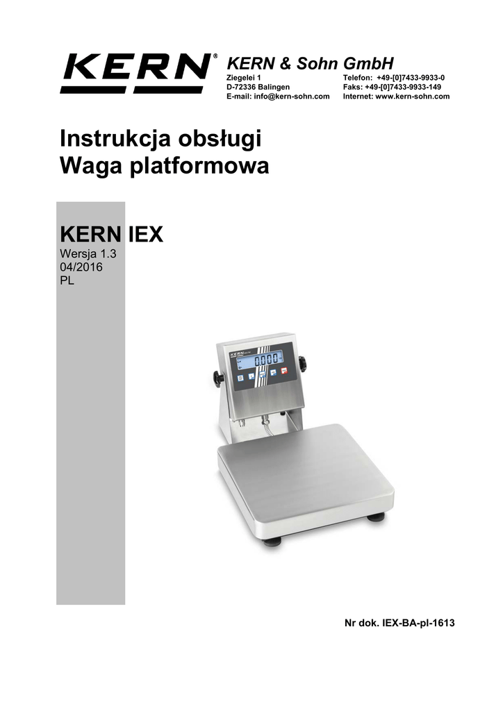 KERN & Sohn GmbH Ziegelei 1 D-72336 Balingen E-mail: [email protected] Telefon: +49-[0]7433-9933-0 Faks: +49-[0]7433-9933-149 Internet: www.kern-sohn.com Instrukcja obsługi Waga platformowa KERN IEX Wersja 1.3 04/2016 PL Nr dok. IEX-BA-pl-1613 PL KERN IEX Wersja 1.3 04/2016 Instrukcja obsługi Waga platformowa Spis treści 1 2 3 4 5 6 7 8 Przestrzeganie wskazówek zawartych w instrukcji obsługi ........................... 3 Użytkowanie wag IEX zgodne z ich przeznaczeniem ...................................... 4 Konstrukcja wag IEX z jednym ogniwem obciążnikowym .............................. 4 Oznakowanie ATEX — znaczenie symboli ....................................................... 6 Instrukcja montażu wagi .................................................................................... 8 Zmiana miejsca ustawienia wagi .................................................................... 11 Czyszczenie, konserwacja ............................................................................... 12 Badania techniczne .......................................................................................... 13 2 Nr dok. IEX-BA-pl-1613 1 Przestrzeganie wskazówek zawartych w instrukcji obsługi Przed ustawieniem i uruchomieniem urządzenia należy dokładnie przeczytać niniejszą instrukcję obsługi, nawet wtedy, gdy mają już Państwo doświadczenie z wagami firmy KERN. Wszystkie wersje językowe zawierają niewiążące tłumaczenie. Wiążący jest niemieckim. oryginalny dokument w języku Przestrzeganie zaleceń zawartych w tej instrukcji obsługi jest jednym ze środków ostrożności zapewniających bezpieczną eksploatację wag serii OEX w obszarach zagrożonych wybuchem. Pracownicy powinni zapoznać się z elementami urządzenia opisanymi w instrukcji obsługi, do których należą: • • wyświetlacz KEX-TM; zasilacz sieciowy IEX-A01-U, IEX-A01-E. Instrukcję obsługi należy udostępnić pracownikom, umożliwiając im wgląd w każdej chwili. W instrukcji obsługi występują następujące symbole: • • czynności, których wykonywanie jest zalecane stale; czynności, których wykonywanie zalecane jest w określonych okolicznościach. • Oznaczenie ustępów istotnych z punktu widzenia bezpieczeństwa przeciwwybuchowego Instrukcja obsługi może być uzupełniona o dodatkowe ostrzeżenia i informacje dotyczące bezpieczeństwa udostępnione przez firmę KERN. O wszelkich dodatkach do przedłożonej instrukcji obsługi należy poinformować wszystkich pracowników. Nr dok. IEX-BA-pl-1613 3 2 Użytkowanie wag IEX zgodne z ich przeznaczeniem Materiał ważony w obszarach zagrożonych wybuchem. Wagę można wytarować w całym zakresie pomiarowym, umożliwiając tym samym określenie masy netto. Forma wykonania wagi (konstrukcja nieelektrycznej części wagi platformowej wagi oraz użyty materiał) jest zgodna z dyrektywą 2014/34/EU obowiązującą w krajach Unii Europejskiej. • Ze względu na swoją konstrukcję, z nieelektryczną częścią przy platformie, oraz użyty materiał wagi serii IEX mogą być użytkowane w 1. lub 2. strefie zagrożenia wybuchowego, w których mogą występować: o gazy, mieszaniny gazów i opary zaliczane do klas wybuchowości IIA, IIB lub IIC; o oraz klas temperaturowych T1, T2, T3 lub T4. 3 Konstrukcja wag IEX z jednym ogniwem obciążnikowym Wagi serii IEX z jednym ogniwem obciążnikowym zbudowane są na zasadzie modułowej i składają się z: • • • • wyświetlacza KEX-TM; zasilacza IEX-A01 firmy KERN umieszczanego poza strefą zagrożoną wybuchem; ogniwa obciążnikowego w wykonaniu przeciwwybuchowym; wagi platformowej, stanowiącej nieelektryczny, mechaniczny element konstrukcyjny wagi. Wyświetlacz serii KEX-TM podłączany jest za pomocą kabla do czujnika pomiarowego siły (ogniwa obciążnikowego) umieszczonego w platformie. Waga platformowa składa się z płytki wagi wykonanej ze stali nierdzewnej, zapewniającej wystarczającą ochronę i umożliwiającej łatwe czyszczenie. Waga serii IEX składa się z jednego aluminiowego ogniwa obciążnikowego, zapewniającego lepszą odporność na szkodliwe wpływy oraz warunki środowiskowe. Kabel łączący ogniwo obciążnikowe z wyświetlaczem zabezpieczony jest przy użyciu pręta i węża o długości ok. 3 m. Wyświetlacz zasilany jest za pomocą zasilacza sieciowego IEX-A01 firmy KERN, który znajduje się poza strefą zagrożoną wybuchem. Zasilacz sieciowy podłączany jest do publicznej sieci zasilającej 230 V. Obudowa wyświetlacza wyposażona jest w oznakowane przyłącze przewodu ochronnego (wyładowania elektrostatyczne). Obudowa połączona jest elektrycznie z wagą platformową za pomocą węża w oplocie stalowym. 4 Nr dok. IEX-BA-pl-1613 Waga serii IEX z wyświetlaczem KEX-TM Obszar bezpieczny Zasilacz sieciowy IEX-A01 Obszar zagrożony wybuchem Waga z jednym ogniwem obciążnikowym Waga IEX (waga platformowa 300 × 300) Waga IEX – (500 × 400) Nr dok. IEX-BA-pl-1613 5 4 Oznakowanie ATEX — znaczenie symboli • Wagi serii IEX spełniają wymagania dyrektywy 2014/34/EU dla urządzeń grupy II, klasy 2 i posiadają oznakowanie II 2 G IIB T4. Objaśnienie symboli zgodnych z dyrektywą 2014/34/EU: Grupa urządzeń: I – Podziemne elementy kopalń II – Wszystkie inne miejsca, w których może istnieć zagrożenie wynikające z występowania atmosfery Wyposażenie elektryczne — zgodne z jednym typem lub kilkoma typami konstrukcji zabezpieczenie przeciwwybuchow ego Kategoria dla urządzeń grupy II: 1 – urządzenie zapewniające bardzo wysoki poziom Atmosfera wybuchowa: bezpieczeństwa G – związana z – do pracy w strefach występowaniem gazu, 0, 1, 2 oparów i mgły 2 – urządzenie D – związana z zapewniające wysoki występowaniem pyłu poziom bezpieczeństwa – do pracy w strefach 1, 2 3 – urządzenie zapewniające normalny poziom bezpieczeństwa – do pracy w strefie 2 Symbol użytego zabezpieczenia przeciwwybuchow ego Typ kon