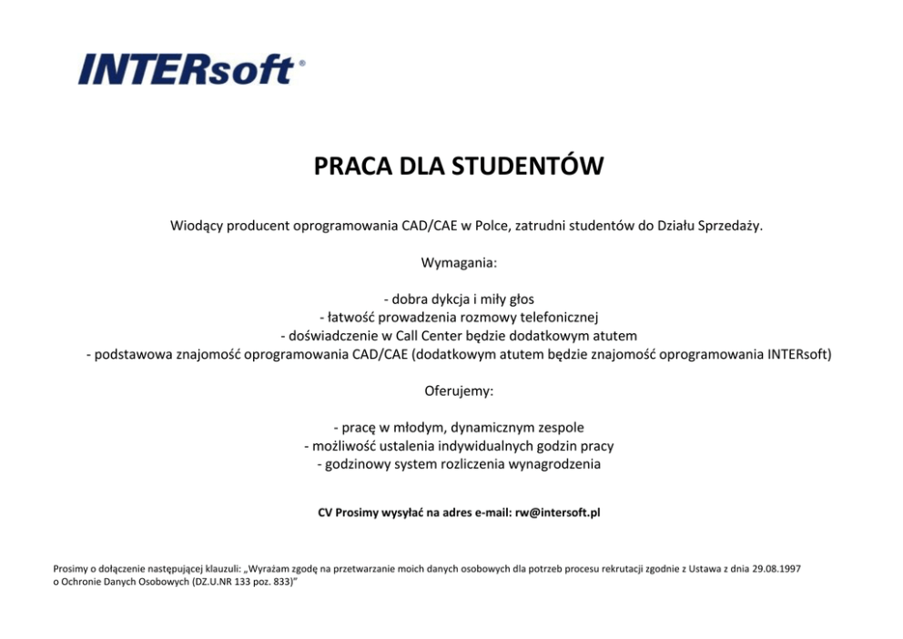 PRACA DLA STUDENTÓW Wiodący producent oprogramowania CAD/CAE w Polce, zatrudni studentów do Działu Sprzedaży. Wymagania: - dobra dykcja i miły głos - łatwość prowadzenia rozmowy telefonicznej - doświadczenie w Call Center będzie dodatkowym atutem - podstawowa znajomość oprogramowania CAD/CAE (dodatkowym atutem będzie znajomość oprogramowania INTERsoft) Oferujemy: - pracę w młodym, dynamicznym zespole - możliwość ustalenia indywidualnych godzin pracy - godzinowy system rozliczenia wynagrodzenia CV Prosimy wysyłać na adres e-mail: [email protected] Prosimy o dołączenie następującej klauzuli: „Wyrażam zgodę na przetwarzanie moich danych osobowych dla potrzeb procesu rekrutacji zgodnie z Ustawa z dnia 29.08.1997 o Ochronie Danych Osobowych (DZ.U.NR 133 poz. 833)”