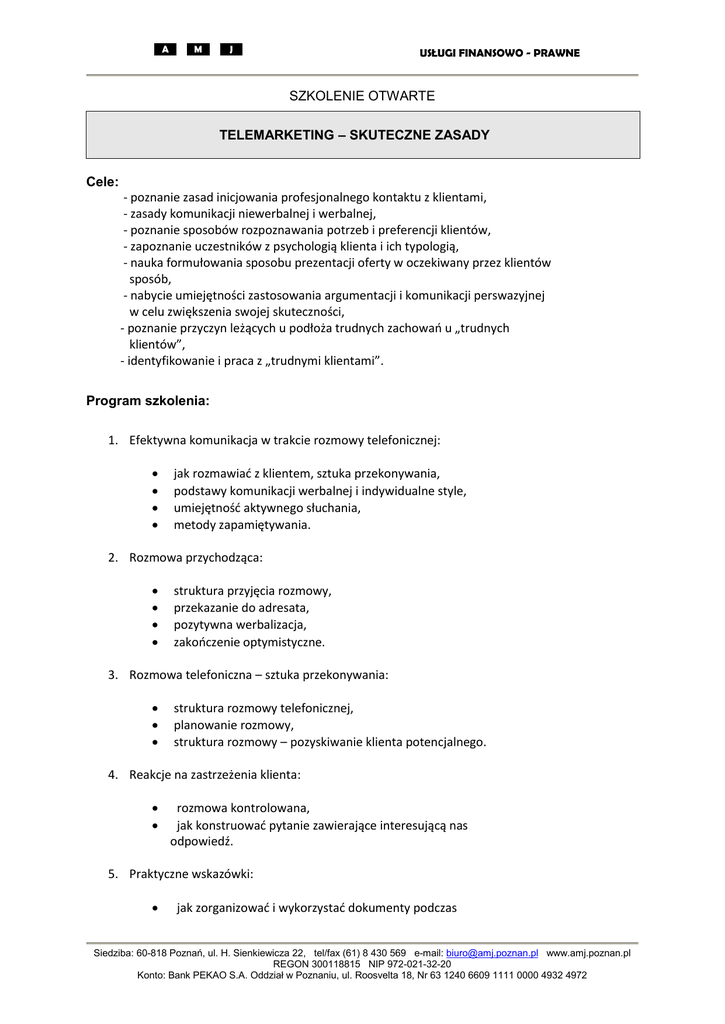 A M J USŁUGI FINANSOWO - PRAWNE SZKOLENIE OTWARTE TELEMARKETING – SKUTECZNE ZASADY Cele: - poznanie zasad inicjowania profesjonalnego kontaktu z klientami, - zasady komunikacji niewerbalnej i werbalnej, - poznanie sposobów rozpoznawania potrzeb i preferencji klientów, - zapoznanie uczestników z psychologią klienta i ich typologią, - nauka formułowania sposobu prezentacji oferty w oczekiwany przez klientów sposób, - nabycie umiejętności zastosowania argumentacji i komunikacji perswazyjnej w celu zwiększenia swojej skuteczności, - poznanie przyczyn leżących u podłoża trudnych zachowao u „trudnych klientów”, - identyfikowanie i praca z „trudnymi klientami”. Program szkolenia: 1. Efektywna komunikacja w trakcie rozmowy telefonicznej: jak rozmawiad z klientem, sztuka przekonywania, podstawy komunikacji werbalnej i indywidualne style, umiejętnośd aktywnego słuchania, metody zapamiętywania. 2. Rozmowa przychodząca: struktura przyjęcia rozmowy, przekazanie do adresata, pozytywna werbalizacja, zakooczenie optymistyczne. 3. Rozmowa telefoniczna – sztuka przekonywania: struktura rozmowy telefonicznej, planowanie rozmowy, struktura rozmowy – pozyskiwanie klienta potencjalnego. 4. Reakcje na zastrzeżenia klienta: rozmowa kontrolowana, jak konstruowad pytanie zawierające interesującą nas odpowiedź. 5. Praktyczne wskazówki: jak zorganizowad i wykorzystad dokumenty podczas Siedziba: 60-818 Poznań, ul. H. Sienkiewicza 22, tel/fax (61) 8 430 569 e-mail: [email protected] www.amj.poznan.pl REGON 300118815 NIP 972-021-32-20 Konto: Bank PEKAO S.A. Oddział w Poznaniu, ul. Roosvelta 18, Nr 63 1240 6609 1111 0000 4932 4972 A M J USŁUGI FINANSOWO - PRAWNE sprzedaży / rozmowy telefonicznej, karta klienta jako podstawowe narzędzie o kliencie. 6. Trening praktyczny. 7. Podsumowanie szkolenia: najważniejsze elementy treningu praktycznego, co należy zapamiętad, najczęściej popełniane błędy. Metodyka: zajęcia prowadzone są w formie mikro - wykładów połączonych z praktycznymi ćwiczeniami, analizy odgrywanych zachowań, dyskusją. Wykładowca: Pan Henryk Przemysław Anger – coach i trener biznesu, Mistrz NLP ( certyfikat Polskiego Instytutu NLP, akredytacja Europejskiego Stowarzyszenia NLPt ), zawodowy negocjator. Specjalizuje się w prowadzeniu szkoleń z zakresu zarządzania organizacją, zarządzania przez cele, wprowadza w przedsiębiorstwach Balanced Scorecard ( Zrównoważona Karta Wyników) oraz projekty zmian systemowych. DANE ORGANIZACYJNE Termin szkolenia: 4 października 2010 r. Czas trwania zajęć: 1 dzień, w godz. od 9.00 do 15.00 (7 godzin lekcyjnych). Miejsce szkolenia: sala konferencyjna – HOTEL MERCURE w Poznaniu, ul. Roosvelta 20. Koszt uczestnictwa: 380,00 zł od osoby. Cena obejmuje udział w zajęciach, autorskie materiały dydaktyczne, serwis kawowy. Każdy uczestnik szkolenia otrzyma zaświadczenie potwierdzające udział w szkoleniu. Siedziba: 60-818 Poznań, ul. H. Sienkiewicza 22, tel/fax (61) 8 430 569 e-mail: [email protected] www.amj.poznan.pl REGON 300118815 NIP 972-021-32-20 Konto: Bank PEKAO S.A. Oddział w Poznaniu, ul. Roosvelta 18, Nr 63 1240 6609 1111 0000 4932 4972