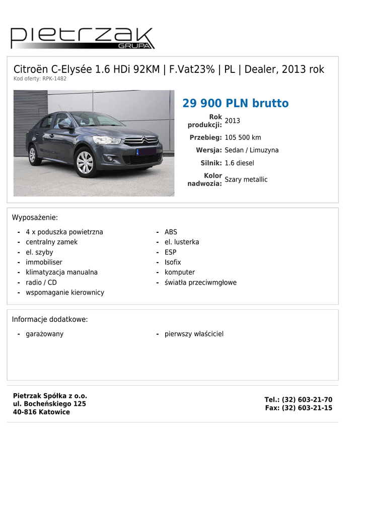 Citroën C-Elysée 1.6 HDi 92KM | F.Vat23% | PL | Dealer, 2013 rok Kod oferty: RPK-1482 29 900 PLN brutto Rok 2013 produkcji: Przebieg: 105 500 km Wersja: Sedan / Limuzyna Silnik: 1.6 diesel Kolor Szary metallic nadwozia: Wyposażenie: - 4 x poduszka powietrzna centralny zamek el. szyby immobiliser klimatyzacja manualna radio / CD wspomaganie kierownicy - ABS el. lusterka ESP Isofix komputer światła przeciwmgłowe Informacje dodatkowe: - garażowany Pietrzak Spółka z o.o. ul. Bocheńskiego 125 40-816 Katowice - pierwszy właściciel Tel.: (32) 603-21-70 Fax: (32) 603-21-15