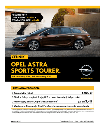 PROMOCYJNY OPEL KREDYT 4 25 + WA A A OP 4 ATA1 CENNIK OPEL ASTRA SPORTS TOURER. Rok produkcji 2014 / Rok modelowy 2015. AKTUALNA PROMOCJA 6 000 zł Promocyjny rabat Silnik z abryczn instalacj P 2 zwrot inwestycji już po roku Promocyjny pakiet „Opel Ubezpieczenie” Wydłużona warancja Opel le 1 już od 3,4% 1 are teraz również w cenie samochodu 4 letnia gwarancja Opel zawarta jest w cenie samochodu wyłącznie przy zakupie w kredycie 4 5 i obejmuje lata standardowej gwarancji fabrycz nej oraz lata ydłużonej warancji Opel le are z łącznym limitem przebiegu 0 000 km. zczegóły programu Opel le are i inne warianty okresu ochrony dostępne są u ealerów Opla i na stronie www.opel.pl sługi serwisowe ydłużona warancja Opel le are. www.opel.pl Cennik nr 01/2014 z dnia 10 lipca 2014, GMPL Cennik – Opel Astra Sports Tourer Rok produkcji 2014, rok modelowy 2015 Ceny promocyjne* Essentia Enjoy Cosmo Sport 1.4 Twinport 100 KM M5 61 900 65 800 – – 1.6 Twinport 115 KM M5 64 900 68 800 74 250 74 500 1.6 Twinport 115 KM A6 – 73 800 79 250 79 500 1.4 Turbo 120 KM** M6 67 900 71 800 77 250 77 500 1.4 Turbo 140 KM** M6 69 900 73 800 79 250 79 500 A6 – 78 800 84 250 84 500 M6 73 300 75 800 81 250 81 500 1.6 Turbo 170 KM Start/Stop M6 – – 86 150 86 400 1.6 Turbo 170 KM A6 – – 89 750 90 000 1.7 CDTI 110 KM M6 75 100 79 200 84 650 84 900 1.6 CDTI 110 KM M6 74 700 80 600 86 050 86 300 1.7 CDTI 130 KM M6 – 81 600 87 050 87 300 1.6 CDTI 136 KM Start/Stop M6 – 83 000 88 450 88 700 2.0 CDTI 165 KM** M6 – – 92 350 92 600 2.0 CDTI 165 KM A6 – – 97 350 97 600 1.4 Turbo 140 KM 1.4 Turbo 140 KM LPGTEC 2 * Dokładny opis całej oferty promocyjnej znajduje się na stronie www.opel.pl w sekcji promocje lub dostępny jest u Dealerów marki Opel. Ceny promocyjne dotyczą klientów indywidualnych (detalicznych). Klientów flotowych (firmy i przedsiębiorstwa prowadzące działalność gospodarczą bądź instytucje prowadzące działalność społeczną, zarejestrowane w Polsce i rejestrujące auto na terenie Polski) w sprawie zapytań ofertowych prosimy o kontakt z wybranym Dealerem marki Opel. 2 Zwrot kosztów instalacji fabrycznej w promocyjnej cenie 2 000 zł (nie dot. Essentia) już po roku przy założeniach: roczny przebieg 20 000 km; średnie ceny detaliczne z dn. 26.03. 2014 r. (za www.e-petrol.pl): LPG 2,63 zł/l, Pb 95 5,58 zł/l; dla średniego spalania w cyklu mieszanym. Ceny katalogowe Essentia Enjoy Cosmo Sport 1.4 Twinport 100 KM M5 67 900 71 800 – – 1.6 Twinport 115 KM M5 70 900 74 800 80 250 80 500 1.6 Twinport 115 KM A6 – 79 800 85 250 85 500 1.4 Turbo 120 KM** M6 73 900 77 800 83 250 83 500 1.4 Turbo 140 KM** M6 75 900 79 800 85 250 85 500 1.4 Turbo 140 KM A6 – 84 800 90 250 90 500 1.4 Turbo 140 KM LPGTEC M6 82 300 84 800 90 250 90 500 1.6 Turbo 170 KM Start/Stop M6 – – 92 150 92 400 1.6 Turbo 170 KM A6 – – 95 750 96 000 1.7 CDTI 110 KM M6 81 300 85 200 90 650 90 900 1.6 CDTI 110 KM Start/Stop M6 82 700 86 600 92 050 92 300 1.7 CDTI 130 KM M6 – 87 600 93 050 93 300 1.6 CDTI 136 KM Start/Stop M6 – 89 000 94 450 94 700 2.0 CDTI 165 KM** M6 – – 98 350 98 600 2.0 CDTI 165 KM A6 – – 103 350 103 600 ** Silnik dostępny z systemem Start/Stop – dopłata 1 400 zł (dla silników 1.4 Turbo 120 KM i 140 KM nie dostępny dla wersji Essentia). Cennik Opla Astry Sports Tourer, rok produkcji 2014, rok modelowy 2015, nr 01/2014 z dnia 10 lipca 2014 1/4 Wyposażenie standardowe Tapicerka materiałowa, czarna Essentia Enjoy Cosmo Sport S S ― ― S S S S S S S S S S S S S S S S P P 1 400/P ― ― 900/P ― 1 000 S S S ― S S ― S S S S S S S S S S S S S S S S S S S ― ― S S ― S ― S S S S S S S S S S S S S S -300 S S ― ― S S ― S ― S S S S S S S S S S P S S S -300 ― ― S ― 1 500/P ― 1000 900 1 500/P 1 700/P 1 000/P 900/P S S S S S S S S ― 1400 S S DBU ― ― P 500/P S S S S TSP ― 450/P S S VGB MDE ― ― ― ― S S S S TADB ― 400 400 S SR1 ― 1 600 1 600 S N35 ― ― ― S T3S 2 200 ― ― 3 600 ― ― 2 200 600/P 700 3 600 3 100 800/P 2 200 600/P 700/P 3 600 3 100 800/P 2 200 600/P 700/P 3 600 3 100 800/P A8Z ― 5 200 5 200/P 5 200/P PWP 600 ― ― ― 350/P ― ― ― 200 3000 4600 350/P 3 500 600 ― ― 1 600 3 200 350/P 3 500 600 ― ― 1 600 3 200 350/P 3 500 600 100 ― 100 200 100 ― 100 ― ― ― 5 000 4 650 KA1 1 000 1 000/P 1 000/P 1 000/P UVD ― 1 000 1 000 1 000 DT4 50 ― 50 700 50 700/P 50 700 TACW/ TAJM/TAJI Układ stabilizacji toru jazdy ESP z TCS i ABS Przednie i boczne poduszki powietrzne dla kierowcy i pasażera Klimatyzacja sterowana ręcznie Radioodtwarzacz CD/MP3 300 z 4 głośnikami Elektrycznie sterowane przednie szyby Elektrycznie sterowane i podgrzewane lusterka zewnętrzne w kolorze nadwozia Felgi stalowe 16" System monitorujący ciśnienie w oponach Relingi dachowe, czarne Światła do jazdy dziennej Fotel kierowcy z regulacją wysokości Tylne siedzenia dzielone w proporcji 40/60 Kolumna kierownicy regulowana w pionie i poziomie Flex Floor: składana podłoga bagażnika Zaczepy Isofix w oparciach tylnych zewnętrznych siedzeń Sztywna górna osłona bagażnika Kurtynowe poduszki powietrzne dla kierowcy i pasażerów Aktywne zagłówki foteli przednich Radioodtwarzacz CD/MP3 400 z 6 głośnikami Kierownica pokryta skórą Przyciski sterowania na kierownicy Komputer pokładowy Tempomat z ogranicznikiem prędkości Felgi aluminiowe 16" Tapicerka materiałowa z elementami ze sztucznej skóry, czarna, szaro-czarna lub brązowa (dostępność zależna od koloru nadwozia) Klimatyzacja sterowana elektronicznie dwustrefowa Czujniki parkowania, przód i tył Elektrycznie sterowane tylne szyby Reflektory przeciwmgielne Felgi aluminiowe 17" FX3 AJG C67 UYB AEF/ AXG DWE PWM UJM V2T T3N AH3 A64 N37 B6U AHN B75 AYC AJF UZZ/UNM/UYN N34 UC3 U68 K33 RRZ TADA/TAJK/ TAFS CJ2 UD5 AER T3U RTN/PGQ/ RCN/PXS Układ wspomagania ruszania pod górę Konsola centralna z przesuwanym podłokietnikiem i zamy