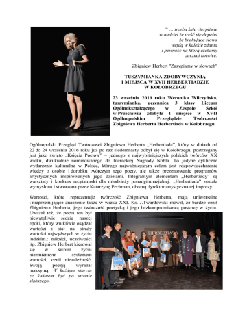 ” … trzeba śnić cierpliwie w nadziei że treść się dopełni że brakujące słowa wejdą w kalekie zdania i pewność na którą czekamy zarzuci kotwicę. Zbigniew Herbert "Zasypiamy w słowach" TUSZYMIANKA ZDOBYWCZYNIĄ I MIEJSCA W XVII HERBERTIADZIE W KOŁOBRZEGU 23 września 2016 roku Weronika Wilczyńska, tuszymianka, uczennica 3 klasy Liceum Ogólnokształcącego w Zespole Szkół w Przecławiu zdobyła I miejsce w XVII Ogólnopolskim Przeglądzie Twórczości Zbigniewa Herberta Herbertiada w Kołobrzegu. Ogólnopolski Przegląd Twórczości Zbigniewa Herberta „Herbertiada”, który w dniach od 22 do 24 września 2016 roku już po raz siedemnasty odbył się w Kołobrzegu, postrzegany jest jako święto „Księcia Poetów” – jednego z najwybitniejszych polskich twórców XX wieku, dwukrotnie nominowanego do literackiej Nagrody Nobla. To jedyne cykliczne wydarzenie kulturalne w Polsce, którego najważniejszym celem jest rozpowszechnianie wiedzy o osobie i dorobku twórczym tego poety, ale także prezentowanie programów artystycznych inspirowanych jego dziełami. Integralnym elementem „Herbertiady” są warsztaty i konkurs recytatorski dla młodzieży ponadgimnazjalnej. „Herbertiada” została wymyślona i stworzona przez Katarzynę Pechman, obecną dyrektor artystyczna tej imprezy. Wartości, które reprezentuje twórczość Zbigniewa Herberta, mają uniwersalne i nieprzemijające znaczenie także w wieku XXI. Ks. J.Twardowski mówił, że bardzo cenił Zbigniewa Herberta, jego twórczość poetycką i jego bezkompromisową postawę w życiu. Uważał też, że poeta ten był niewątpliwie sędzią naszej epoki, który wnikliwie osądzał wartości i stał na straży wartości najwyższych w życiu ludzkim.: miłości, uczciwości itp. Zbigniew Herbert kierował się w swoim życiu niezmiennym systemem wartości, cenił niezależność. Swoją poezją wyrażał maksymą: W każdym starciu ze światem być po stronie słabszego. Publiczność przyzwyczajona jest do tego, że „Herbertiada” trwa kilka dni, w istocie jednak impreza ma większy zasięg czasowy i przestrzenny. Tegoroczny przegląd rozpoczął się 22 września o godzinie 11.00 warsztatami recytatorskimi, które poprowadził aktor Wojciech Machnicki w Zespole Szkół Społecznych nr 1 im. Z. Herberta. Warsztaty te polegały przede wszystkim na pracy nad tekstami Z. Herberta, które młodzież przygotowała na konkurs recytatorski, ale także była to okazja do poznania warsztatu aktorskiego i innych technik prezentacji tekstu. Drugiego dnia, tj. 23 września o godzinie 10.00 w Regionalnym Centrum Kultury im. Z. Herberta (mała sala teatralna) rozpoczął się konkurs recytatorski, do którego przystąpiła młodzież ze szkół ponadgimnazjalnych m.in. ze Szczecina, Poznania, Koszalina, Trzebiatowa, Słupska, Nowogardu, Przecławia i innych miejscowości Polski. Swoje umiejętności recytatorskie zaprezentowało 29 uczniów. Ich interpretacje oceniało trzyosobowe jury, w składzie: Monika Rasiewicz (wieloletni pedagog Krakowskiej PWST, profesor Krakowskiej Akademii Muzycznej i Akademii Ignatianum w Krakowie, aktorka), Janusz Andrzejewski (aktor Teatru Nowego w Poznaniu) i Helena Elert (polonistka z Kołobrzegu).Uczestnicy ubiegali się o tytuł laureata Grand Prix oraz o nagrody ufundowane przez Prezydenta RP i Ministra Kultury i Dziedzictwa Narodowego. Wręczenie nagród oraz podsumowanie konkursu nastąpiło tego samego dnia. Gala „Herbertiady” odbyła się 24 września. Rozpoczęto ją prezentacją laureatów piątkowego konkursu recytatorskiego, a następnie publiczność zobaczyła dwa programy artystyczne i nagrany w 1972 r. przez TVP wywiad, którego udzielił Zbigniew Herbert Aleksandrowi Małachowskiemu. Na wspomnianą część artystyczną złożyły się spektakl muzyczno – poetycki reżyserii Grażyny Matyszkiewicz pt. „Czas ciemnej gwiazdy” (wiersze Z. Herberta z muzyką S. Radwana, J. K. Pawluśkiewicza, J. Strobla, M. Kulentego i A. Trąbczyńskiego), który zaprezentowali aktor Aleksander Trąbczyński, Aga Derlak (fortepian, flet poprzeczny) i kontrabasista Tymon Trąbczyński oraz spektakl pt. „Nie pytaj, czym jest róża. Bajki Herberta”. Wybrane utwory Z. Herberta zaprezentowali aktorzy: Agata Piotrowska – Mastalerz i Dariusz Kowalski. Galę poprowadził student PWST we Wrocławiu Patryk Bartoszewski. Organizatorem „Herbertiady” jest Stowarzyszenie Katolicka Inicjatywa Kulturalna, a partnerami: Gmina Miasto Kołobrzeg, PKN ORLEN, Fundacja Stefczyka, Fundusz Popierania Twórczości Stowarzyszenia Autorów ZAiKS im. Andrzeja Szczypiorskiego Fundacja PZU. Patronat honorowy objęli: Rodzina Zbigniewa Herberta (Katarzyna Herbert, Halina Herbert – Żebrowska i Rafał Żebrowski), Minister Kultury i Dziedzictwa Narodowego, I Wicepremier prof. dr hab. Piotr Gliński, Wojewoda Zachodniopomorski, Członek Zarządu Województwa Zachodniopomorskiego Anna Mieczkowska, Prezydent Miasta Kołobrzeg Janusz Gromek. Patronat medialny sprawowali: TVP 3, Radio Plus, Radio Koszalin, „Gość Niedzielny”, Radio Kołobrzeg, „Kulisy Kołobrzeskie”, TKK Kołobrzeg oraz portal www.miastokolobrzeg.pl. M.Wąż Fot. J.Błażyński Galeria
