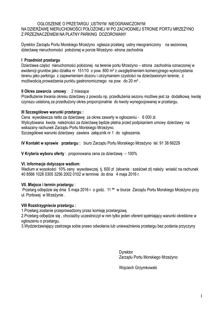 OGŁOSZENIE O PRZETARGU USTNYM NIEOGRANICZONYM NA DZIERŻAWĘ NIERUCHOMOŚCI POŁOŻONEJ W PO ZACHODNIEJ STRONIE PORTU MRZEŻYNO Z PRZEZNACZENIEM NA PŁATNY PARKING DOZOROWANY Dyrektor Zarządu Portu Morskiego Mrzeżyno ogłasza przetarg ustny nieograniczony na sezonową dzierżawę nieruchomości położonej w porcie Mrzeżyno -strona zachodnia I Przedmiot przetargu Dzierżawa części nieruchomości położonej na terenie portu Mrzeżyno – strona zachodnia oznaczonej w ewidencji gruntów jako działka nr 151/10 o pow. 800 m² z uwzględnieniem komercyjnego wykorzystania terenu jako parkingu z zapewnieniem dozoru i utrzymaniem czystości na dzierżawionym terenie, z możliwością prowadzenia punktu gastronomicznego na pow. do 20 m² . II Okres zawarcia umowy : 2 miesiące Przedłużenie trwania okresu dzierżawy z powodu np. przedłużenia sezonu możliwe jest za dodatkową kwotę czynszu ustaloną za przedłużony okres proporcjonalnie do kwoty wynegocjowanej w przetargu. III Szczegółowe warunki przetargu : Cena wywoławcza netto za dzierżawę za okres zawarty w ogłoszeniu - 6 000 zł. Wylicytowana kwota należności za dzierżawę będzie płatna przed podpisaniem umowy dzierżawy na wskazany rachunek Zarządu Portu Morskiego Mrzeżyno. Szczegółowe warunki dzierżawy zawiera załącznik nr 1 do ogłoszenia. IV Kontakt w sprawie przetargu : biuro Zarządu Portu Morskiego Mrzeżyno tel. 91 38 66229 V Kryteria wyboru oferty : proponowana cena za dzierżawę – 100% VI. Informacje dotyczące wadium: Wadium w wysokości 10% ceny wywoławczej tj. 600 zł (słownie : sześćset zł) należy wnieść na rachunek 40 8566 1026 0305 3256 2002 0102 w terminie do dnia 4 maja 2016 r. VII. Miejsce i termin przetargu : Przetarg odbędzie się dnia 5 maja 2016 r o godz. 11 ºº w biurze Zarządu Portu Morskiego Mrzeżyno przy ul. Portowej w Mrzeżynie . VIII Rozstrzygniecie przetargu : 1.Przetarg zostanie przeprowadzony przez komisję przetargową 2.Przetarg odbędzie się , chociażby uczestniczył w nim tylko jeden oferent spełniający warunki określone w ogłoszeniu o przetargu. 3.Wydzierżawiający zastrzega sobie prawo odwołania lub unieważnienia przetargu bez podania przyczyny Dyrektor Zarządu Portu Morskiego Mrzeżyno Wojciech Grzymkowski 1 Załącznik Nr 1 do ogłoszenia o przetargu Warunki przetargu ustnego nieograniczonego na dzierżawę nieruchomości położonej na terenie portu Mrzeżyno – po jego zachodniej części - z przeznaczeniem na prowadzenie płatnego parkingu z możliwością prowadzenia mobilnego punktu gastronomicznego. I.WYDZIERŻAWIAJĄCY : Zarząd Portu Morskiego Mrzeżyno Ul. Portowa 6 , 72-330 Mrzeżyno tel. 91 3866229 e-mail. [email protected] adres strony internetowej - www.port.mrzeżyno.pl II.WARUNKI PRZETARGU 1.Sezonowa dzierżawa części nieruchomości położonej w Mrzeżynie , po zachodniej stronie portu , oznaczonej w ewidencji gruntów pod numerem 151/10 o powierzchni 800 m² z przeznaczeniem na komercyjne wykorzystanie terenu jako parkingu z możliwością prowadzenia małego punktu gastronomicznego, z zapewnieniem dozoru i utrzymaniem czystości na dzierżawionym terenie. 2. Minimalne postąpienie wynosi 200 zł. III WARUNKI WYMAGANE OD UCZESTNIKÓW POSTĘPOWANIA PRZETARGOWEGO - brak zaległości finansowych wobec wydzierżawiającego, niezaleganie z płatnościami z tytułu podatków i składek ZUS IV OKREŚLENIE PRZEDMIOTU DZIERŻAWY 1. Wydzielona część nieruchomości o pow. 800 m² po zachodniej stronie portu z dostępem do mediów stanowiących własność Wydzierżawiającego 2. Teren z bezpośrednim dostępem do plaży , z oświetleniem ,z nawierzchnią betonową , z usytuowanymi koszami na odpadki. 3.Miejsca postojowe dla pojazdów do wyznaczenia przez Dzierżawcę. V. CZAS TRWANIA UMOWY : od dnia 1.07.2016 r do dnia 31.08.2016 r z możliwością przedłużenia VI.WARUNKI DZIERŻAWY 1.Wywoławcza cena minimalna za 1m² gruntu/m-c 2,50 zł netto 2.Ponoszenie opłat publiczno- prawnych, 3.Wniesienie zabezpieczenia finansowego – zwrotna kaucja w kwocie 10 % wynegocjowanej ceny dzierżawy 4.Wprowadzenie organizacji ruchu ,opracowanie cennika oraz regulaminu o korzystaniu z miejsc postojowych z uwzględnieniem godzin otwarcia oraz praw osób uprawnionych do zwolnień od opłat za parkowanie. 5.Odpowiedzialność za szkody osobowe i rzeczowe wyrządzone osobom trzecim z tytułu prowadzonej na dzierżawionym terenie działalności gospodarczej, w tym za następstwa nieszczęśliwych wypadków. 6.Odpowiedzialność za szkody poniesione przez Gminę Trzebiatów z winy przyszłego Dzierżawcy. VII WARUNKI PŁATNOŚCI 1.Wynegocjowany czynsz zwiększony o 23 % stawkę podatku Vat płatny jednorazowo przed podpisaniem umowy dzierżawy na rachunek bankowy Zarządu Portu Morskiego Mrzeżyno. 2.Koszty pobranej energii elektrycznej i wody podlegają dodatkowemu rozliczeniu. VIII.KRYTERIA ROZSTRZYGNIĘCIA PRZETARGU Oferowana cena czynszu za dzierżawę- 100 % IX. WADIUM PRZETARGOWE 1.Wadium w wysokości 10 % ceny wywoławczej t,j 600 zł wniesione na wskazany w ogłoszeniu o przetargu rachunek bankowy Zarządu Portu Morskiego Mrzeżyno- wpływ do dnia 4 maja 2016 r. 2.Uczestnik przetargu winien okazać komisji przetargowej dokument tożsamości lub stosowne upoważnienie oraz dowód wniesienia wadium. 3.Wadium wniesione przez uczestników przetargu , którzy nie nabyli prawa do dzierżawy będzie zwrócone na 2 rachunek bankowy uczestników przetargu w terminie 3 dni roboczych od daty przetargu. 4.Wadium wygrywającego przetarg będzie zaliczone na poczet zwrotnej kaucji. 5.Wadium ulega przepadkowi na rzecz Wydzierżawiającego , jeżeli uczestnik, który wygrał przetarg odstąpi od zawarcia umowy. X. ROZSTRZYGNIĘCIE 1. Zakończenie przetargu i wyłonienie dzierżawcy potwierdzone zostanie protokołem z przeprowadzenia postępowania przetargowego . 2.Wydzierzawiający zastrzega sobie prawo odwołania lub unieważnienia przetargu bez podania przyc