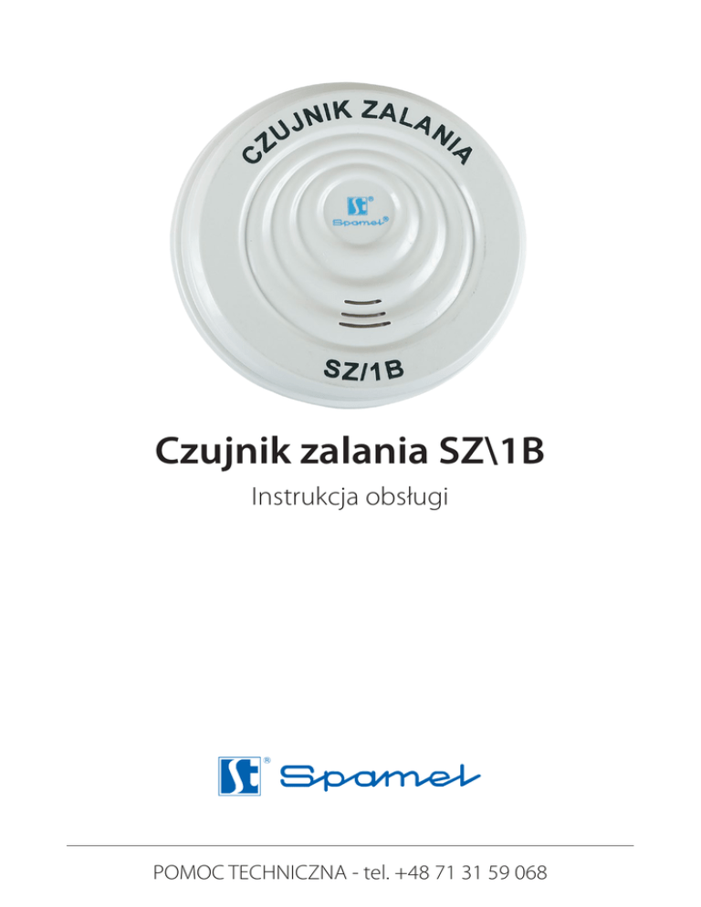 Czujnik zalania SZ\1B Instrukcja obsługi POMOC TECHNICZNA - tel. +48 71 31 59 068 Dziękujemy za zakup naszego produktu. Przed uruchomieniem urządzenia zapoznaj się z niniejszą instrukcją obsługi i konserwacji. Producent nie ponosi odpowiedzialności za uszkodzenia wynikające z nieprawidłowego montażu lub eksploatacji urządzenia. Czujnik zalania SZ\1B pozwala na wczesne wykrycie obecności wody w miejscach narażonych na zalania np. piwnice, garaże a także pomieszczenia ze zbiornikami wody takimi jak zmywarka, pralka, klimatyzacja, itp. Producent nie ponosi odpowiedzialności za uszkodzenia wynikające z nieprawidłowego montażu lub eksploatacji urządzenia. Dane techniczne Napięcie zasilania 9V DC (1 x bateria w zestawie) Pobór prądu 5-10 µA Czas reakcji ≤ 7 sekund Głośność alarmu 85dB / 3m Wymiar Ø85 mm x 30 mm Zakres temperatur pracy -1°C ÷ +50°C W ZESTAWIE Bateria 9V DC 1x Śruby mocujące 2x INSTALACJA 1. Przy pomocy monety lub odpowiednio dobranego śrubokręta otwórz pokrywę baterii. 2. Włóż do urządzenia 1 szt. baterii 9V. Pamiętaj, aby zachować prawidłową polaryzację. 3. Zamknij urządzenie, wcześniej usuniętą pokrywą. Zwróć uwagę na prawidłowe ułożenie uszczelki. Sensory 4. Tak przygotowane urządzenie jest gotowe do pracy. Wystarczy umieścić je na podłodze lub innej powierzchni w miejscu potencjalnie narażonym na zalanie. W przypadku wykrycia wody, czujnik uruchomi sygnalizację dźwiękową. Pamiętaj, aby nie umieszczać czujnika na powierzchniach metalowych lub łatwo przewodzących, może to spowodować fałszywy alarm. POMOC TECHNICZNA - tel. +48 71 31 59 068 WYMIANA BATERII W przypadku gdy urządzenie zacznie wydawać sygnał dźwiękowy w odstępach ok. 30 sekund oznacza to, że bateria zasilająca jest na wyczerpaniu. Należy wymienić baterię w sposób opisany w sekcji „Instalacja”. W celu zachowania wysokiej sprawności urządzenia, bateria powinna być wymieniana przynajmniej jeden raz w roku. OBSŁUGA 1. Regularnie czyść urządzenie z kurzu i innych zanieczyszczeń używając do tego celu miękkiej szmatki. 2. Wymieniaj baterię przynajmniej jeden raz w roku. 3. W przypadku zalania urządzenia - wyciągnij je z wody najszybciej jak to możliwe. Usuń baterię i pozostaw urządzenie do wyschnięcia przed ponownym użyciem. 4. Nie naprawiaj urządzenia na własną rękę, ani nie zrywaj fabrycznej plomby, skutkuje to utratą gwarancji. POMOC TECHNICZNA - tel. +48 71 31 59 068