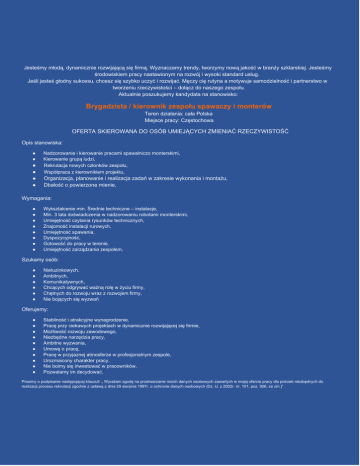 Jesteśmy młodą, dynamicznie rozwijającą się firmą. Wyznaczamy trendy, tworzymy nową jakość w branży szklarskiej. Jesteśmy środowiskiem pracy nastawionym na rozwój i wysoki standard usług. Jeśli jesteś głodny sukcesu, chcesz się szybko uczyć i rozwijać. Męczy cię rutyna a motywuje samodzielność i partnerstwo w tworzeniu rzeczywistości – dołącz do naszego zespołu. Aktualnie poszukujemy kandydata na stanowisko: Brygadzista / kierownik zespołu spawaczy i monterów Teren działania: cała Polska Miejsce pracy: Częstochowa OFERTA SKIEROWANA DO OSÓB UMIEJĄCYCH ZMIENIAĆ RZECZYWISTOŚĆ Opis stanowiska: ● ● ● ● ● ● Nadzorowanie i kierowanie pracami spawalniczo monterskimi, Kierowanie grupą ludzi, Rekrutacja nowych członków zespołu, Współpraca z kierownikiem projektu, Organizacja, planowanie i realizacja zadań w zakresie wykonania i montażu, Dbałość o powierzone mienie, Wymagania: ● ● ● ● ● ● ● ● Wykształcenie min. Średnie techniczne – instalacje, Min. 3 lata doświadczenia w nadzorowaniu robotami monterskimi, Umiejętność czytania rysunków technicznych, Znajomość instalacji rurowych, Umiejętność spawania, Dyspozycyjność, Gotowość do pracy w terenie, Umiejętność zarządzania zespołem, Szukamy osób: ● ● ● ● ● ● Nietuzinkowych, Ambitnych, Komunikatywnych, Chcących odgrywać ważną rolę w życiu firmy, Chętnych do rozwoju wraz z rozwojem firmy, Nie bojących się wyzwań Oferujemy: ● ● ● ● ● ● ● ● ● ● Stabilność i atrakcyjne wynagrodzenie, Pracę przy ciekawych projektach w dynamicznie rozwijającej się firmie, Możliwość rozwoju zawodowego, Niezbędne narzędzia pracy, Ambitne wyzwania, Umowę o pracę, Pracę w przyjaznej atmosferze w profesjonalnym zespole, Urozmaicony charakter pracy, Nie boimy się inwestować w pracowników, Pozwalamy im decydować, Prosimy o podpisanie następującej klauzuli: „ Wyrażam zgodę na przetwarzanie moich danych osobowych zawartych w mojej ofercie pracy dla potrzeb niezbędnych do realizacji procesu rekrutacji zgodnie z ustawą z dnia 29 sierpnia 1997r. o ochronie danych osobowych (Dz. U. z 2002r. nr. 101, poz. 926, ze zm.)”