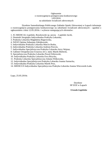 Ogłoszenie o rozstrzygnięciu postępowania konkursowego 1/05/2016 na udzielanie świadczeń zdrowotnych Dyrektor Samodzielnego Publicznego Zakładu Opieki Zdrowotnej w Łapach informuje o rozstrzygnięciu postępowania konkursowego na udzielanie świadczeń zdrowotnych – zgodnie z ogłoszeniem z dnia 12.05.2016r. i wyborze następujących oferentów: 1. JG MEDICAL Łapiński, Roszkowski sp. jawna - Łapiński Jacek, 2. Dominik Siergiejko Indywidualna Praktyka Lekarska, 3. Praktyka Lekarska Magdalena Bagrowska, 4. NZOZ Optima Sebastjan Zdrójkowski, 5. Indywidualna Praktyka Lekarska Marcin Rutka, 6. Indywidualna Praktyka Lekarska Andrzej Purwin, 7. Indywidualna Specjalistyczna Praktyka Lekarska Jerzy Wojnar, 8. Gabinet Ortopedyczno-Urazowy dr n. med, Marek Bielecki, 9. Specjalistyczna Praktyka Lekarska Paweł Żebrowski, 10. Indywidualna Praktyka Lekarska Ewa Birycka, 11. Praktyka Lekarska Specjalistyczna Jolanta Witkowska, 12. Indywidualna Specjalistyczna Praktyka Lekarska Joanna Sarnacka, 13. Indywidualna Praktyka Lekarska Marek Prus, 14. MEDICUS Indywidualna Specjalistyczna Praktyka Lekarska Joanna Wieczorek-Łada. Łapy, 25.05.2016r. Dyrektor SP ZOZ w Łapach Urszula Łapińska