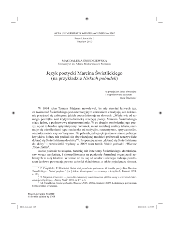 ACTA UNIVERSITATIS WRATISLAVIENSIS No 3267 Prace Literackie L Wrocław 2010 MAGDALENA ŚNIEDZIEWSKA Uniwersytet im. Adama Mickiewicza w Poznaniu Język poetycki Marcina Świetlickiego (na przykładzie Niskich pobudek) ta poezja jest jakaś obsesyjna i wypolerowana zarazem Piotr Śliwiński1 W 1994 roku Tomasz Majeran nawoływał, by nie stawiać łatwych tez, że twórczość Świetlickiego jest ostentacyjnym zerwaniem z tradycją, ale dokładnie przyjrzeć się zabiegom, jakich poeta dokonuje na słowach: „Właściwie od samego początku nad krytycznoliteracką recepcją poezji Marcina Świetlickiego ciąży jedno, a podstawowe nieporozumienie. W co drugim omówieniu jego poezji, a jest to bardzo optymistyczny rachunek, miast rzetelnej analizy tekstu, szermuje się określeniami typu »ucieczka od tradycji«, »autentyzm«, »prywatność«, »aspołeczność« czy »o’haryzm«. Na palcach jednej ręki jestem w stanie policzyć krytyków, którzy nie poddali się obowiązującej modzie i próbowali rzeczywiście dobrać się Świetlickiemu do skóry”2. Proponuję zatem „dobrać się Świetlickiemu do skóry” i prześwietlić wydany w 2009 roku tomik Niskie pobudki. (Wiersze 2006–2009)3. Niskie pobudki to książka, bardziej niż inne tomy Świetlickiego, domknięta, czy wręcz zamknięta, i skomplikowana na poziomie formalnej organizacji zebranych w niej tekstów. W tomie aż roi się od anafor i różnego rodzaju powtórzeń (celowo powracają pewne całostki składniowe, a także pojedyncze słowa), 1 P. Czapliński, P. Śliwiński, Świat stoi przed nim potworem. O tomiku poetyckim Marcina Świetlickiego „Pieśni profana”, [w:] iidem, Kontrapunkt — rozmowy o książkach, Poznań 1999, s. 123. 2 T. Majeran, Czerwiec — pora dla świerszczy niebezpieczna. (Kilka uwag o wierszach Marcina Świetlickiego), „Nowy Nurt” 1994, nr 17, s. 5. 3 M. Świetlicki, Niskie pobudki (Wiersze 2006–2009), Kraków 2009. Lokalizacja przytoczeń bezpośrednio w tekście. Prace Literackie 50/2010 © for this edition by CNS PL50_book.indb 115 2010-12-06 12:39:37 116 MAGDALENA ŚNIEDZIEWSKA które sprawiają, że nie tylko poszczególne fragmenty utworów, ale i same wiersze dialogują ze sobą, nawiązują do siebie, nawet się zapowiadają4. Wyraźnym sygnałem spójności tomu są, pozostawione bez tytułów, zapisane kursywą, dwa utwory: pierwszy i ostatni. Charakterystyczne jest to, że oba teksty mają budowę klamrową — otwiera je i zamyka niemal ta sama fraza. Piszę „niemal”, ponieważ zakończenie wieńczącego Niskie pobudki wiersza zostało przez Świetlickiego dodatkowo skomplikowane. Poeta spiętrzył klamry kompozycyjne — utwory zbudowane klamrowo5 stają się bowiem klamrą kompozycyjną całego tomu. Interesujący mnie, powtarzający się dwuwers brzmi tak: „A to jest zwyczajnie historia o człowieku, / który budzi się codziennie w innym łóżku” (s. 7, 59). Domknięcie zbioru wygląda nieco inaczej: [...] to jest, to być musi historia o człowieku, który budzi się codziennie w innym łóżku. A to jest zwyczajnie historia o człowieku, który uparcie pisze, chociaż wszystkie klisze już prześwietliły się. (s. 59) Wprowadzona przez poetę zmiana jest oczywiście znacząca. Świetlicki ucieka się tutaj do ciekawej gry językowej, za sprawą której możemy pokusić się o utożsamienie człowieka codziennie budzącego się w innym łóżku z autorem tekstu. Podstawienie to okazuje się możliwe nie tylko za sprawą sformułowania „uparcie pisze”, nieprzypadkowo przywodzącego na myśl pisanie wierszy. Dużo ciekawszy jest inny zabieg dokonany na granicy wersów. Dowiadujemy się, że człowiek, którego dotyczy opowiadana historia, „uparcie pisze, chociaż wszystkie klisze” — tu narracja zostaje na chwilę zawieszona i wydaje się, że do słowa „klisze” dołączy określenie „językowe”, tworząc w ten sposób związek frazeologiczny. Otóż nie, chodzi bowiem nie o klisze językowe, ale fotograficzne, które „już prześwietliły się”. Pierwsze, domniemane znaczenie zostaje odsunięte, ale nie zanegowane, ponieważ w słowie „prześwietliły” kryje się cząstka „świetli”, przywodząca na myśl nazwisko autora. Mielibyśmy zatem klisze, które przeszły przez Świetlickiego, zostały więc zużyte; jednak ten — mimo to — „uparcie pisze”, wierząc w niekończące się możliwości języka, mając oczywiście świadomość, że nigdy nie wyzwoli się z własnego poetyckiego idiomu. Piotr Śliwiński 4 Mam tu na myśli Gloomy Sunday, kończący się słowami „Wszystko jest doraźne / i tylko rani” (s. 13), i następujący po nim Wiersz doraźny (s. 14) oraz Mniej i mniej, wprowadzający w ostatnim wersie, brzmiącym: „Wszedł specyficzny anioł” (s. 57), przedostatni tekst tomu zatytułowany Specyficzny anioł (s. 58). 5 Co istotne, powtórzenie, które otwiera i zamyka tekst, pojawia się nie tylko w utworach granicznych, kompozycję klamrową mają także: Doprawdy (s. 10), Ohydny wiersz (s. 15), Ziemnioki (s. 24). Prace Literackie 50/2010 © for this edition by CNS PL50_book.indb 116 2010-12-06 12:39:37 Język poetycki Marcina Świetlickiego 117 stwierdza, że autor Pieśni profana „jest rozpoznawalny, nie sposób go pomylić z kimś innym, jest — dobrze to czy źle — konsekwentny”6. Rozbite związki frazeologiczne i melodia Sommera Ciekawym przykładem podobnego wykorzystania tego, że wiersz składa się z pojedynczych, ekwiwalentnych wersów, wydaje się Wiersz dla: „Żyjemy ponad stan / wojenny” (s. 18). Pierwsza linijka czytana osobno jest utartym związkiem frazeologicznym, jednak lektura z uwzględnieniem przerzutni sprawia, że słowo „stan” zyskuje określenie w postaci przymiotnika „wojenny”. Powstaje zatem kolejny związek frazeologiczny „stan wojenny”, odnoszący się do najnowszej historii Polski. Dotychczasowe znaczenie zdania „Żyjemy ponad stan” zostaje