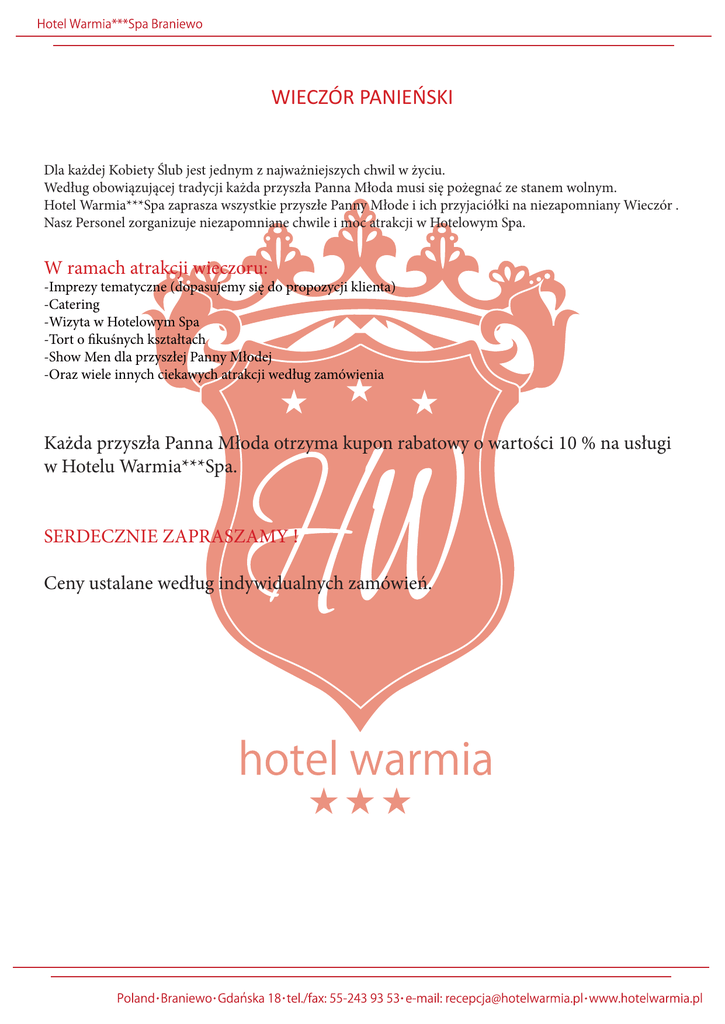 WIECZÓR PANIEŃSKI Dla każdej Kobiety Ślub jest jednym z najważniejszych chwil w życiu. Według obowiązującej tradycji każda przyszła Panna Młoda musi się pożegnać ze stanem wolnym. Hotel Warmia***Spa zaprasza wszystkie przyszłe Panny Młode i ich przyjaciółki na niezapomniany Wieczór . Nasz Personel zorganizuje niezapomniane chwile i moc atrakcji w Hotelowym Spa. W ramach atrakcji wieczoru: -Imprezy tematyczne (dopasujemy się do propozycji klienta) -Catering -Wizyta w Hotelowym Spa -Tort o fikuśnych kształtach -Show Men dla przyszłej Panny Młodej -Oraz wiele innych ciekawych atrakcji według zamówienia Każda przyszła Panna Młoda otrzyma kupon rabatowy o wartości 10 % na usługi w Hotelu Warmia***Spa. SERDECZNIE ZAPRASZAMY ! Ceny ustalane według indywidualnych zamówień.