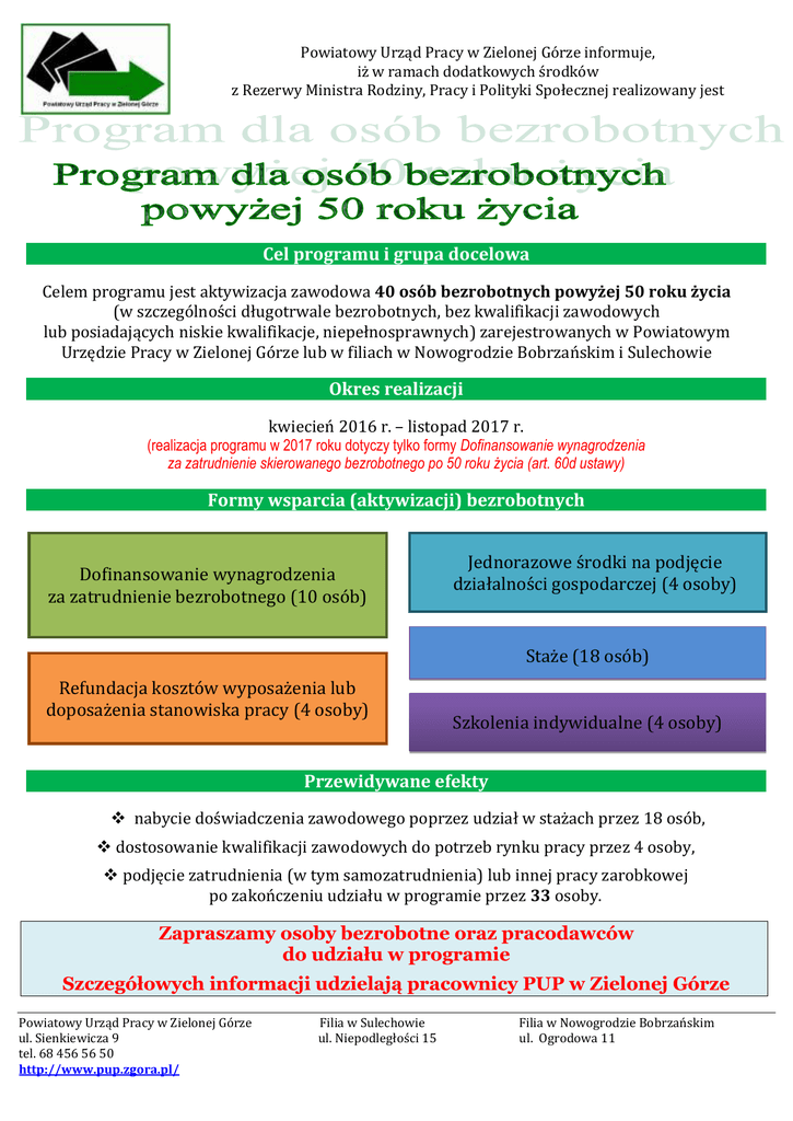 Powiatowy Urząd Pracy w Zielonej Górze informuje, iż w ramach dodatkowych środków z Rezerwy Ministra Rodziny, Pracy i Polityki Społecznej realizowany jest Cel programu i grupa docelowa Celem programu jest aktywizacja zawodowa 40 osób bezrobotnych powyżej 50 roku życia (w szczególności długotrwale bezrobotnych, bez kwalifikacji zawodowych lub posiadających niskie kwalifikacje, niepełnosprawnych) zarejestrowanych w Powiatowym Urzędzie Pracy w Zielonej Górze lub w filiach w Nowogrodzie Bobrzańskim i Sulechowie Okres realizacji kwiecień 2016 r. – listopad 2017 r. (realizacja programu w 2017 roku dotyczy tylko formy Dofinansowanie wynagrodzenia za zatrudnienie skierowanego bezrobotnego po 50 roku życia (art. 60d ustawy) Formy wsparcia (aktywizacji) bezrobotnych Dofinansowanie wynagrodzenia za zatrudnienie bezrobotnego (10 osób) Jednorazowe środki na podjęcie działalności gospodarczej (4 osoby) Staże (18 osób) Refundacja kosztów wyposażenia lub doposażenia stanowiska pracy (4 osoby) Szkolenia indywidualne (4 osoby) Przewidywane efekty nabycie doświadczenia zawodowego poprzez udział w stażach przez 18 osób, dostosowanie kwalifikacji zawodowych do potrzeb rynku pracy przez 4 osoby, podjęcie zatrudnienia (w tym samozatrudnienia) lub innej pracy zarobkowej po zakończeniu udziału w programie przez 33 osoby. Zapraszamy osoby bezrobotne oraz pracodawców do udziału w programie Szczegółowych informacji udzielają pracownicy PUP w Zielonej Górze Powiatowy Urząd Pracy w Zielonej Górze ul. Sienkiewicza 9 tel. 68 456 56 50 http://www.pup.zgora.pl/ Filia w Sulechowie ul. Niepodległości 15 Filia w Nowogrodzie Bobrzańskim ul. Ogrodowa 11