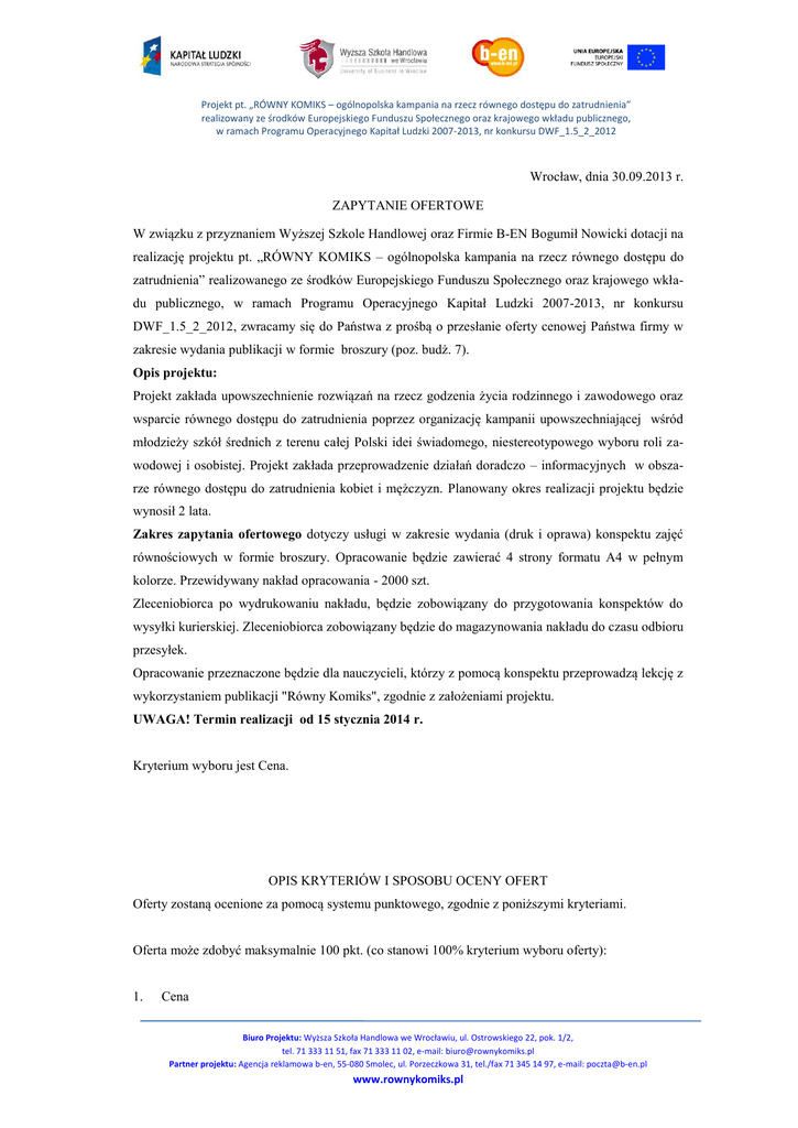 Projekt pt. „RÓWNY KOMIKS – ogólnopolska kampania na rzecz równego dostępu do zatrudnienia” realizowany ze środków Europejskiego Funduszu Społecznego oraz krajowego wkładu publicznego, w ramach Programu Operacyjnego Kapitał Ludzki 2007-2013, nr konkursu DWF_1.5_2_2012 Wrocław, dnia 30.09.2013 r. ZAPYTANIE OFERTOWE W związku z przyznaniem Wyższej Szkole Handlowej oraz Firmie B-EN Bogumił Nowicki dotacji na realizację projektu pt. „RÓWNY KOMIKS – ogólnopolska kampania na rzecz równego dostępu do zatrudnienia” realizowanego ze środków Europejskiego Funduszu Społecznego oraz krajowego wkładu publicznego, w ramach Programu Operacyjnego Kapitał Ludzki 2007-2013, nr konkursu DWF_1.5_2_2012, zwracamy się do Państwa z prośbą o przesłanie oferty cenowej Państwa firmy w zakresie wydania publikacji w formie broszury (poz. budż. 7). Opis projektu: Projekt zakłada upowszechnienie rozwiązań na rzecz godzenia życia rodzinnego i zawodowego oraz wsparcie równego dostępu do zatrudnienia poprzez organizację kampanii upowszechniającej wśród młodzieży szkół średnich z terenu całej Polski idei świadomego, niestereotypowego wyboru roli zawodowej i osobistej. Projekt zakłada przeprowadzenie działań doradczo – informacyjnych w obszarze równego dostępu do zatrudnienia kobiet i mężczyzn. Planowany okres realizacji projektu będzie wynosił 2 lata. Zakres zapytania ofertowego dotyczy usługi w zakresie wydania (druk i oprawa) konspektu zajęć równościowych w formie broszury. Opracowanie będzie zawierać 4 strony formatu A4 w pełnym kolorze. Przewidywany nakład opracowania - 2000 szt. Zleceniobiorca po wydrukowaniu nakładu, będzie zobowiązany do przygotowania konspektów do wysyłki kurierskiej. Zleceniobiorca zobowiązany będzie do magazynowania nakładu do czasu odbioru przesyłek. Opracowanie przeznaczone będzie dla nauczycieli, którzy z pomocą konspektu przeprowadzą lekcję z wykorzystaniem publikacji "Równy Komiks", zgodnie z założeniami projektu. UWAGA! Termin realizacji od 15 stycznia 2014 r. Kryterium wyboru jest Cena. OPIS KRYTERIÓW I SPOSOBU OCENY OFERT Oferty zostaną ocenione za pomocą systemu punktowego, zgodnie z poniższymi kryteriami. Oferta może zdobyć maksymalnie 100 pkt. (co stanowi 100% kryterium wyboru oferty): 1. Cena Biuro Projektu: Wyższa Szkoła Handlowa we Wrocławiu, ul. Ostrowskiego 22, pok. 1/2, tel. 71 333 11 51, fax 71 333 11 02, e-mail: [email protected] Partner projektu: Agencja reklamowa b-en, 55-080 Smolec, ul. Porzeczkowa 31, tel./fax 71 345 14 97, e-mail: [email protected] www.rownykomiks.pl Projekt pt. „RÓWNY KOMIKS – ogólnopolska kampania na rzecz równego dostępu do zatrudnienia” realizowany ze środków Europejskiego Funduszu Społecznego oraz krajowego wkładu publicznego, w ramach Programu Operacyjnego Kapitał Ludzki 2007-2013, nr konkursu DWF_1.5_2_2012 Maksymalnie 100 punktów (co stanowi kryterium 100 % wyboru oferty), otrzyma Wykonawca, który zaproponuje najniższą całkowitą cenę brutto za w/w usługi. Wykonawcy otrzymają odpowiednio liczbę punktów zgodnie z poniższym wzorem: C = CN/COB * 100 pkt. C – liczba punktów przyznanych Wykonawcy za Cenę gdzie: CN – najniższa zaoferowana Cena, COB – Cena zaoferowana w ofercie badanej Sporządzone przez Państwa oferty prosimy dostarczyć do dnia 15.10.2013 r. Bogumił Nowicki Zespół Sterujący Projektu Biuro Projektu: Wyższa Szkoła Handlowa we Wrocławiu, ul. Ostrowskiego 22, pok. 1/2, tel. 71 333 11 51, fax 71 333 11 02, e-mail: [email protected] Partner projektu: Agencja reklamowa b-en, 55-080 Smolec, ul. Porzeczkowa 31, tel./fax 71 345 14 97, e-mail: [email protected] www.rownykomiks.pl
