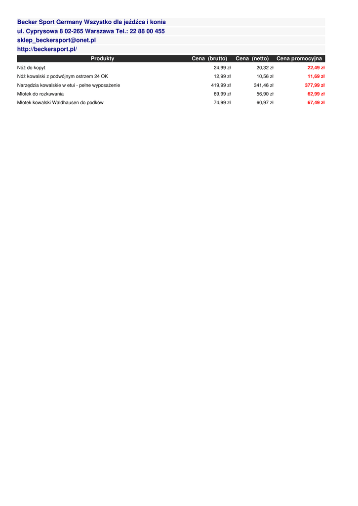 Becker Sport Germany Wszystko dla jeźdźca i konia ul. Cyprysowa 8 02-265 Warszawa Tel.: 22 88 00 455 [email protected] http://beckersport.pl/ Produkty Cena (brutto) Cena (netto) Cena promocyjna Nóż do kopyt 24,99 zł 20,32 zł 22,49 zł Nóż kowalski z podwójnym ostrzem 24 OK 12,99 zł 10,56 zł 11,69 zł Narzędzia kowalskie w etui - pełne wyposażenie 419,99 zł 341,46 zł 377,99 zł Młotek do rozkuwania 69,99 zł 56,90 zł 62,99 zł Młotek kowalski Waldhausen do podków 74,99 zł 60,97 zł 67,49 zł