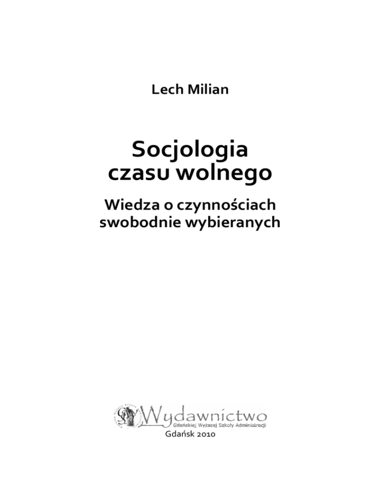 Lech Milian Socjologia czasu wolnego Wiedza o czynnościach swobodnie wybieranych Gdańsk 2010 Spis treści Wprowadzenie ................................................................................................. 11 1. Charakterystyka socjologii jako nauki społecznej................................... 14 1.1. Zjawiska społeczne w rodowodzie socjologii...............................................14 1.2. Ucieczka od pracy podłoŜem podziałów społecznych. ..............................17 1.3. Wybrane teoretyczne i praktyczne nurty w socjologii.................................25 1.4. Zakres problemowy socjologii czasu wolnego. ............................................33 2. Czas wolny i jego społeczno-ekonomiczne uwarunkowania................ 40 2.1. Czynności dobrowolne wyznacznikiem czasu wolnego?............................40 2.2. Początek i rozwój badań nad czasem wolnym. ............................................50 2.3. Definicja czasu wolnego i koncepcja wczasów. ...........................................55 3. Pogłębione omówienie funkcji czasu wolnego....................................... 65 3.1. Odpoczynek, czyli regeneracja sił psychicznych i fizycznych....................65 3.2. Zabawa, rozrywka, rekreacja. ..........................................................................71 3.3. Samodoskonalenie w modelu i praktyce społecznej....................................79 4. Kultura z umiejscowieniem w czasie wolnym......................................... 86 4.1. Kultura w charakterystyce ogólnej i rodzajowej...........................................86 4.2. Kultura masowa, czyli takŜe medialna. ..........................................................90 5. Kultura Ŝycia codziennego i kultura wczasów. ....................................... 97 5.1. Kultura obyczajowa i jej poziomy. .................................................................97 5.2. Kształtowanie nawyków do kultury wczasów........................................... 105 5.3. Czas wolny i wczasy w specyficznych warunkach Ŝycia........................... 110 6. Instytucjonalizacja czynności czasu wolnego........................................117 6.1. Sztuki artystyczne i ich instytucje. ............................................................... 117 6.2. Kolekcjonerstwo i związki hobbystyczne................................................... 125 6.3. Stowarzyszenia w słuŜbie kultury fizycznej................................................ 128 7. Turystyka w wykorzystywaniu czasu wolnego......................................133 7.1. Turystyka w ujęciu historycznym i definicyjnym....................................... 133 7.2. Turystyka metodą optymalnej rekreacji. ..................................................... 140 7.3. Specyficzne funkcje i dysfunkcje turystyki. ................................................ 144 7.4. Socjologiczne aspekty rynku turystycznego. .............................................. 149 8. Praca i czas wolny w ujęciu retrospektywnym. .....................................155 8.1. Przemiany w pojmowaniu pracy i czasu wolnego..................................... 155 8.2. Odpoczynek w refleksji filozoficzno-teologicznej.................................... 161 8.3. Szlachetne powinności i pogardzana praca w splocie zobowiązań. ....... 166 8.4. Przebieg walki o czas wolny. ........................................................................ 173 8.5. Koniec walki o czas wolny? .......................................................................... 181 9. Czas wolny kobiet – przeszłość i teraźniejszość. .................................186 9.1. Nic nierobienie w domach stanów i klas dominujących. ......................... 186 9.2. Czas wolny kobiet pracujących najemnie. .................................................. 193 10. Czas wolny w społeczeństwie przyszłości...........................................198 10.1. Zanik podziału na czas wolny i czas pracy?............................................. 198 10.2. Jaki rodzaj aktywności zdominuje Ŝycie ludzkie?.................................... 206 Bibliografia opracowań przywołanych.......................................................216