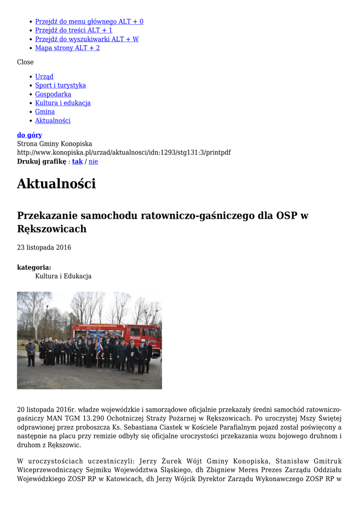 Przejdź do menu głównego ALT + 0 Przejdź do treści ALT + 1 Przejdź do wyszukiwarki ALT + W Mapa strony ALT + 2 Close Urząd Sport i turystyka Gospodarka Kultura i edukacja Gmina Aktualności do góry Strona Gminy Konopiska http://www.konopiska.pl/urzad/aktualnosci/idn:1293/stg131:3/printpdf Drukuj grafikę : tak / nie Aktualności Przekazanie samochodu ratowniczo-gaśniczego dla OSP w Rększowicach 23 listopada 2016 kategoria: Kultura i Edukacja 20 listopada 2016r. władze wojewódzkie i samorządowe oficjalnie przekazały średni samochód ratowniczogaśniczy MAN TGM 13.290 Ochotniczej Straży Pożarnej w Rększowicach. Po uroczystej Mszy Świętej odprawionej przez proboszcza Ks. Sebastiana Ciastek w Kościele Parafialnym pojazd został poświęcony a następnie na placu przy remizie odbyły się oficjalne uroczystości przekazania wozu bojowego druhnom i druhom z Rększowic. W uroczystościach uczestniczyli: Jerzy Żurek Wójt Gminy Konopiska, Stanisław Gmitruk Wiceprzewodniczący Sejmiku Województwa Śląskiego, dh Zbigniew Meres Prezes Zarządu Oddziału Wojewódzkiego ZOSP RP w Katowicach, dh Jerzy Wójcik Dyrektor Zarządu Wykonawczego ZOSP RP w Katowicach, st.bryg. Janusz Benduch Zastępca Komendanta Miejskiego PSP w Częstochowie, mł.bryg. Radosław Mól z KM PSP Częstochowa, dh Krzysztof Smela Wiceprezes Zarządu Powiatowego ZOSP RP w Częstochowie i Członek Zarządu Powiatu Częstochowskiego, dh. Edward Bałdyga Przewodniczący Rady Gminy Konopiska, dh Grzegorz Dyner Prezes Zarządu Oddziału Gminnego ZOSP RP w Konopiskach i Członek Zarządu Powiatu Częstochowskiego, dh Janusz Jończyk Komendant Gminny i Wiceprzewodniczący Wojewódzkiego Sądu Honorowego ZOSP RP w Katowicach, dh Czesław Romański Przeze OSP Rększowice, dh Mariusz Kowalski Naczelnik OSP Rększowice, Ks. Sebastian Ciastek Proboszcz Parafii Najświętszego Serca Pana Jezusa w Rększowicach, Ks. Sławomir Kaczmarek Proboszcz Parafii pw.św. Walentego w Konopiskach i Kapelan Gminny Strażaków, Ks. Jacek Szczecina Proboszcz Parafii pw.św. Maksymiliana Marii Kolbego w Aleksandrii, Pani Edyta Pawlak Dyrektor Szkoły w Rększowicach, Pani Iwona Lisek Dyrektor GCKiR w Konopiskach, dh. Izabela Kowalska Sołtys Sołectwa Rększowice, delegacja Koła Gospodyń Wiejskich z Rększowic, delegacje jednostek gminnych OSP, delegacja z OSP Tanina, delegacja Koła z Rększowic PZHGP z pocztami sztandarowymi. Obecni byli także: Pan Bogdan Kisiela reprezentujący Nadleśnictwo Herby, Pan Andrzej Miedziński, Pan Edward Klyta, Pan Tomasz Skowronek druhny oraz druhowie OSP Rększowice i mieszkańcy Rększowic. W obecności zaproszonych gości i przedstawicieli władz, uroczystego przekazania pojazdu dokonali Jerzy Żurek Wójt Gminy Konopiska, Stanisław Gmitruk Wiceprzewodniczący Sejmiku Województwa Śląskiego i dh Zbigniew Meres Prezes Zarządu Oddziału Wojewódzkiego ZOSP RP w Katowicach. Druhom z OSP wręczono kluczyki do nowego samochodu oraz dokumentację. W dalszej części uroczystości Zarząd OSP Rększowice podziękował wszystkim, którzy przyczynili się do zakupu nowego samochodu i wspierają działalność jednostki. Druhowie z Rększowic zapewniali, że samochód, którym od dzisiaj dysponuje Ochotnicza Straż Pożarna w Rększowicach, będzie służył nie tylko mieszkańcom Rększowic, lecz wszystkim ludziom potrzebującym pomocy. To nowy nabytek, dzięki któremu będą mogli szybko i skutecznie nieść pomoc. Druhnom i druhom z OSP w Rększowicach życzymy wszystkiego najlepszego, jak najmniej wyjazdów, aby ten samochód służył im jak najdłużej! Zobacz relację filmową z uroczystości… 22 lis 2016 Przekazanie nowego samochodu ratowniczo-gaśniczego dla OSP Rększowice Przekazanie Przekazanie Przekazanie Przekazanie Przekazanie Przekazanie Przekazanie Przekazanie Przekazanie Przekazanie nowego nowego nowego nowego nowego nowego nowego nowego nowego nowego Aktualności - strona 1 Aktualności - strona 2 Aktualności - strona 3 samochodu samochodu samochodu samochodu samochodu samochodu samochodu samochodu samochodu samochodu ratowniczo-gaśniczegodla ratowniczo-gaśniczegodla ratowniczo-gaśniczegodla ratowniczo-gaśniczegodla ratowniczo-gaśniczegodla ratowniczo-gaśniczegodla ratowniczo-gaśniczegodla ratowniczo-gaśniczegodla ratowniczo-gaśniczegodla ratowniczo-gaśniczegodla OSP OSP OSP OSP OSP OSP OSP OSP OSP OSP Rększowice Rększowice Rększowice Rększowice Rększowice Rększowice Rększowice Rększowice Rększowice Rększowice powrót do listy aktualności