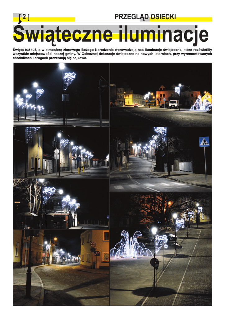 [2] PRZEGLĄD OSIECKI Świąteczne iluminacje Święta tuż tuż, a w atmosferę zimowego Bożego Narodzenia wprowadzają nas iluminacje świąteczne, które rozświetliły wszystkie miejscowości naszej gminy. W Osiecznej dekoracje świąteczne na nowych latarniach, przy wyremontowanych chodnikach i drogach prezentują się bajkowo.