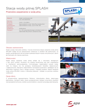 Systemy sanitarne Stacja wody pitnej SPLASH Przenośne zaopatrzenie w wodę pitną Materiał Wymiary (d x s x w) Przyłącza kanalizacyjne Elementy dodatkowe Transport stelaż: ocynkowana stal rura: stal szlachetna 2,40 x 1,12 x 0,60 m doprowadzenie wody: Geka Plus (woda pitna) odprowadzenie wody: rura HT NW 100 podbudowa na 1,20 metra ładunkowego wchodzą 4 sztuki, co odpowiada 48 punktom czerpania wody Obszary zastosowania Dzięki swojej niezwykle solidnej i mocnej konstrukcji stacje czerpania wody pitnej SPLASH nadają się do zastosowania zwłaszcza w strefach dla publiczności, na polach campingowych lub za kulisami podczas dużych imprez rozrywkowych, takich jak festiwale czy imprezy sportowe. Właściwości Każda stacja czerpania wody pitnej składa się z dwunastu dostępnych z obu stron kurków. Armatura ma solidną konstrukcję oraz jest wyposażona w mechanizm samowyłączania, minimalizujący niepotrzebne zużycie wody. Jeśli na miejscu nie ma przyłączy kanalizacyjnych (kanałów dopływowych i odpływowych), oferujemy odpowiednie rozwiązania przenośne, składające się ze zbiorników wodnych wraz z usługą wywozu i utylizacji ścieków. Stacje czerpania wody pitnej SPLASH można z łatwością ładować i układać za pomocą wózków widłowych. Opcje oferty Z przyjemnością zaprezentujemy Państwu indywidualną ofertę, obejmującą planowanie, transport kabin, prace przyłączeniowe, bieżące utrzymanie czystości oraz sprzątanie końcowe, a także wywóz ścieków z użyciem przyczepy asenizacyjnej. www.eps.net Systemy sanitarne Stacja wody pitnej SPLASH Zastosowania Stacja wody pitnej SPLASH, Hurricane Festival Dostępność z dwóch stron Wygodne i szybkie napełnianie kanistrów i butelek Strefa systemów sanitarnych SPLASH ze stacją wody pitnej © eps Oszczędność wody, samoistnie zamykająca sie armatura Kontakt i więcej informacji: [email protected]