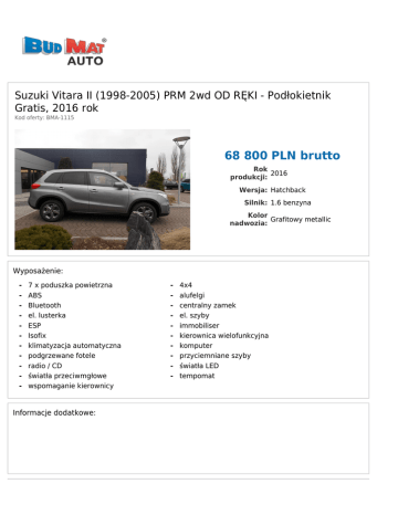Suzuki Vitara II (1998-2005) PRM 2wd OD RĘKI - Podłokietnik Gratis, 2016 rok Kod oferty: BMA-1115 68 800 PLN brutto Rok 2016 produkcji: Wersja: Hatchback Silnik: 1.6 benzyna Kolor Grafitowy metallic nadwozia: Wyposażenie: - 7 x poduszka powietrzna ABS Bluetooth el. lusterka ESP Isofix klimatyzacja automatyczna podgrzewane fotele radio / CD światła przeciwmgłowe wspomaganie kierownicy Informacje dodatkowe: - 4x4 alufelgi centralny zamek el. szyby immobiliser kierownica wielofunkcyjna komputer przyciemniane szyby światła LED tempomat Budmat Auto Sp. z o. o. ul. Bielska 67 09-400 Płock Tel.: Peugeot: 24 267 47 60 Fax: +48 24 2674723