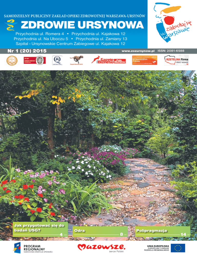 ZDROWIE URSYNOWA Przychodnia ul. Romera 4 • Przychodnia ul. Kajakowa 12 Przychodnia ul. Na Uboczu 5 • Przychodnia ul. Zamiany 13 Szpital - Ursynowskie Centrum Zabiegowe ul. Kajakowa 12 Nr 1 (20) 2015 www.zozursynow.pl ISSN: 2081-6588 Jak przygotować się do badań USG? 4 Odra 8 Polipragmazja 14 Drodzy Czytelnicy, Przyśpieszona wiosna spowodowała liczne infekcje górnych dróg oddechowych i zachorowań grypopodobnych. Dla alergików jest to również czas szczególnie trudny ze względu na wczesne pylenie. W wydaniu tego kwartalnika znajdziecie Państwo kilka ciekawych artykułów, które mogą wiele wyjaśnić, zwłaszcza jeżeli chodzi o nadmierne zażywanie suplementów diety. Jeżeli stwierdzimy, że dzieje się coś niepokojącego z naszym organizmem, skontaktujmy się jednak z lekarzem. Pamiętajmy, że suplement diety nie zastąpi naszego codziennego, zrównoważonego odżywiania. Kwiecień to szczególny czas, aby złożyć wszystkim Pracownikom Ochrony Zdrowia życzenia wytrwałości w niesieniu pomocy potrzebującym. W szczególności z okazji Świąt Zmartwychwstania Pańskiego życzę wszystkim siły w pokonywaniu trudności i patrzenia z ufnością w przyszłość. Niech czas nadchodzących Świąt będzie radosny w gronie najbliższych. mgr Grażyna Napierska Dyrektor SPZOZ Warszawa-Ursynów Spis treści Kwartalnik bezpłatny: 5000 egz. ISSN: 2081-6588 Jak przygotować się do badań USG? 4 Zdrowe stopy 6 Odra 8 ABC Fizjoterapii. Fizjoterapia Wydawca: SPZOZ Warszawa-Ursynów ul. Zamiany 13, 02-786 Warszawa, tel. 22 643 74 44 www.zozursynow.pl Redaktor Naczelna: Anna Dymińska, tel. 22 643 74 44 wew. 65, [email protected] Zespół redakcyjny: Grażyna Napierska, Magdalena Fekete, Barbara Lasota, Marek Kruk, Magdalena Mrozowska, e-mail: [email protected] 10 Korekta: Maria Kałuża Skład i druk: Galia Reklama Poligrafia Zdjęcia: Redakcja, archiwum, www.sxc.hu, pixabay.com Olszewska 12 Redakcja nie ponosi odpowiedzialności za treść zamieszczonych reklam, zastrzega sobie prawo do redagowania i skracania nadesłanych tekstów. Redakcja nie zwraca materiałów niezamówionych. Polipragmazja 14 „Zdrowie Ursynowa” nie zastępuje indywidualnego kontaktu z lekarzem. Przed skorzystaniem z porad należy się skonsultować z lekarzem. w nietrzymaniu moczu Portret prywatny – Karolina ZDROWIE URSYNOWA 3 Jak przygotować się do badań USG? Niezmiernie istotne jest zastosowanie się do poniższych zaleceń, w przeciwnym razie badanie może być znacznie utrudnione, ograniczone lub niemożliwe do przeprowadzenia! Przygotowujemy się zgodnie z aktualnym rodzajem badania zleconym przez lekarza, a nie z rozpoznaniem – np. przy kamicy nerkowej lub przeroście prostaty może być zlecone USG jamy brzusznej i do niego należy się przygotować. USG pęcherza moczowego i prostaty Należy wypełnić pęcherz, wypijając około 1 l płynów na godzinę przed badaniem, tak aby w momencie badania pęcherz moczowy był dobrze wypełniony (uczucie silnego parcia). USG jamy brzusznej W ramach przygotowań należy koniecznie przestrzegać poniższych zaleceń: – nie jeść sześć godzin przed badaniem, – nie pić, zwłaszcza płynów słodkich czy gazowanych, – stałe leki należy przyjąć, popijając niewielką ilością wody, – nie palić tytoniu i nie żuć gumy (powoduje to mimowolne połykanie większej ilości powietrza), – pacjenci chorujący na cukrzycę insulinozależną powinni się umawiać na badanie w godzinach porannych lub jeśli to nie jest możliwe, przyjąć insulinę i posiłek mniej więcej 5 godzin przed badaniem. Niezmiernie istotne jest, aby do każdego badania USG przynosić wyniki poprzednich badań USG danego narządu lub regionu oraz inne, jak tomografia komputerowa, rezonans magnetyczny, mammografia itp., a także dokumentację pooperacyjną i wyniki badań histopatologicznych w wypadku przebytych biopsji lub operacji guzów i zmian ogniskowych. lek. Rafał Ubysz radiolog SPZOZ Warszawa-Ursynów O G Ł O S Z E N I E Zapraszamy na szczepienia przeciw pneumokokom w ramach programu profilaktycznego „Zdrowie, Mama i Ja, etap II” finansowanego ze środków miasta stołecznego Warszawy Program profilaktyki zakażeń pneumokokowych u dzieci w wieku od 24 do 36 miesiąca życia, zamieszkałych na terenie Warszawy, przy zastosowaniu trzynastowalentnej (PCV 13) szczepionki przeciwko pneumokokom. Więcej informacji w poradniach pediatrycznych: • ul. Na Uboczu 5, tel. 22 649 65 03 • ul. Romera 4, tel. 22 643 04 98 • ul. Kajakowa 12, tel. 22 855 47 37 4 ZDROWIE URSYNOWA O G Ł O S Z E N I E ZDROWIE URSYNOWA 5 Zdrowe stopy Z punktu widzenia dermatologa zdrowe stopy to zdrowa skóra, a przede wszystkim paznokcie. Odpowiednie nawilżenie skóry stóp i niezmienione chorobowo paznokcie to podstawa, aby stopy stanowiły ozdobę człowieka, czyli były ładne, estetyczne i nie wymagały bez potrzeby zakrywania obuwiem. Podstawy anatomiczne i fizjopatologiczne wymagają kilkudziesięciu stron opisu, co w tym przesłaniu mija się z celem, więc poprzestańmy na kilku zdaniach istotnych dla idei artykułu. Paznokcie zdrowe rosną około 1 cm na dobę, chore dwa razy dłużej lub w ogóle nie rosną. Niektóre choroby, np. łuszczyca, przyśpieszają wzrost paznokci, a niektóre spowalniają, np. liszaj Wilsona. Płytki paznokciowe są przepuszczalne dla światła, przechodzi przez nie ok. 20% światła słonecznego. Naskórkowa utrata wody przez płytkę paznokciową jest wielokrotnie większa niż przez otaczającą skórę. Kształt paznokci jest zróżnicowany i zależy od budowy kostnej paliczka dystalnego. Powierzchnia jest lekko wypu- 6 ZDROWIE URSYNOWA kła, a grubość płytki zależy od „pracy” paznokci (np. chodzenia, biegania, kopania piłki itp.) oraz od sporadycznych urazów mechanicznych. U osób starszych na zdrowych paznokciach występują podłużne bruzdy, co jest zmianą fizjologiczną. Wszelkie urazy i zmiany chorobowe podpaznokciowe s